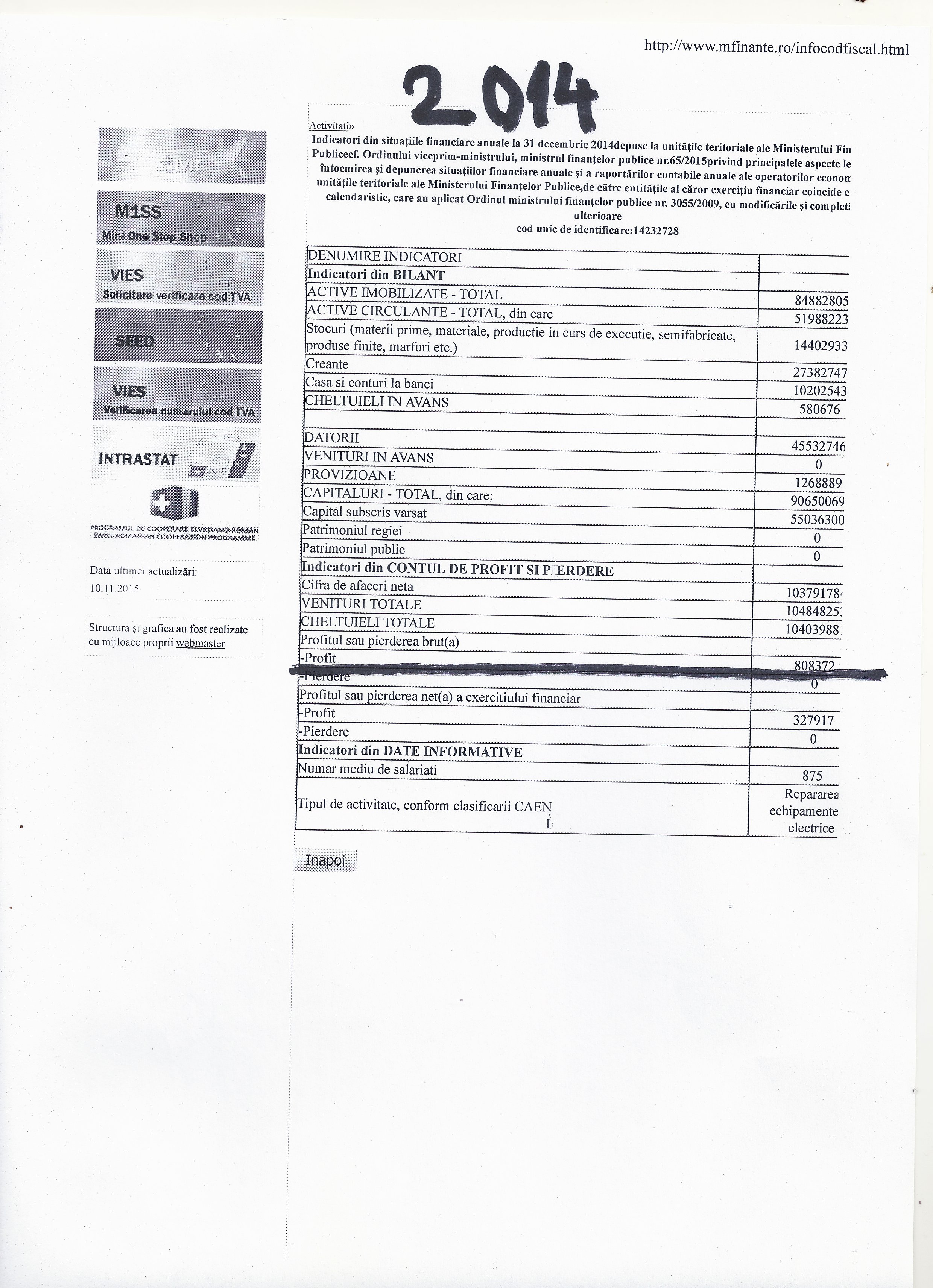 In anul 2014, an in care tu ai indeplinit prin cumul si atributiile directorului general, societatea a inregistrat venituri totale de 104.848.253 lei si un profit de numai 808.372 lei, de peste 10 ori mai mic decat in anul 2013, potrivit informatiilor publicate pe site-ul Ministerului Finantelor Publice.