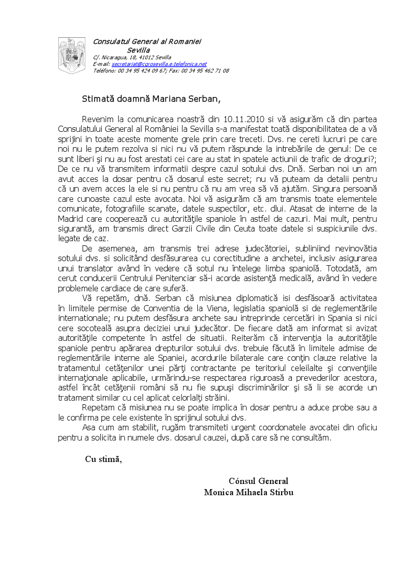 “Vreau sa se faca publica intamplarea prin care trece sotul meu. Pentru aceasta este responsabila justitia spaniola, deoarece nu au facut o ancheta corespunzatoare, nu s-au facut verificari, DECI NU AU FACUT NIMIC, ci pur si simplu au bagat un om in puscarie NEVINOVAT, am dovezi ca alta persoane sunt implicate si in totalitate vinovate.