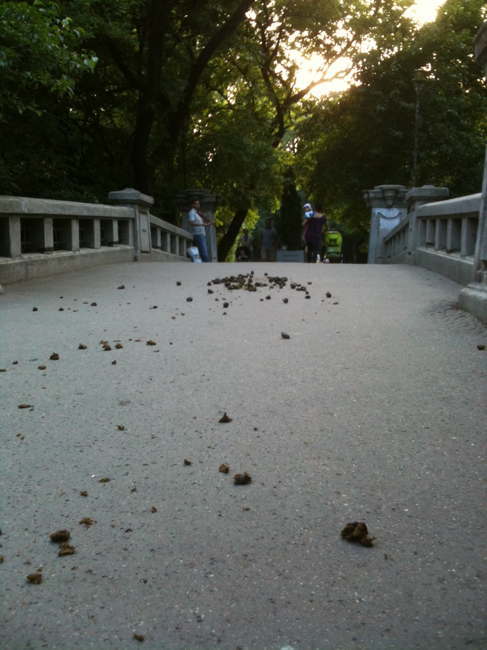 Dar cum orice parc are şi uscăturile lui, tocmai în Parcul Cişmigiu găsim şi reversul medaliei! Zilele trecute traversam pe unul dintre podurile de peste lac. …Pe la mijloc, o imensă grămadă de bălegăr! Părea cam căzută din cer, mai ales că accesul pe pod este limitat… Abia la întoarcere, când mormanul se împraştiase artistic pe toată aleea, mi-a picat fisa! Tocmai trecuse pe lângă mine un echipaj în acţiune… Aşadar, pe lângă pistol, catuse şi baston, poliţiştii călăre ar trebui dotaţi şi cu lopeţele şi saci menajeri. …Dacă nu, măcar să-şi facă autocritica şi să-şi taie singuri câte o amendă! Măcar din când în când.”