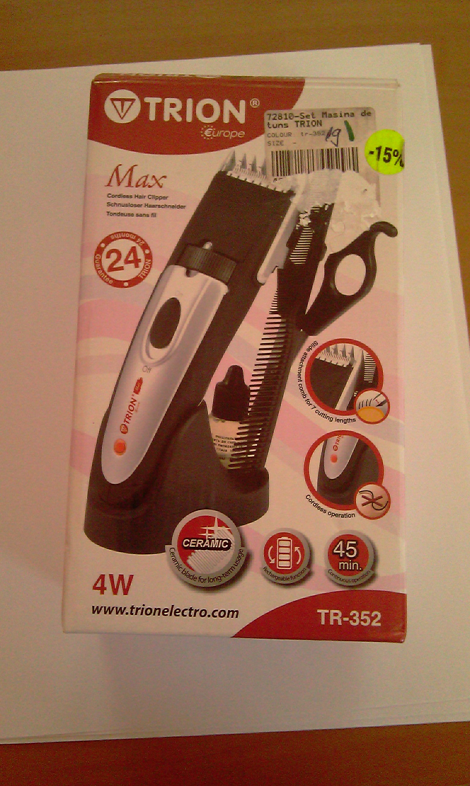 Cum nu aveam nici o idee, m-am plimbat putin prin magazin (pe rand cu toti in spate!) si m-am oprit la electronice & electrocasnice – masini de tuns si barbierit. Am fost consiliata amanuntit despre produsul pe care-l alesesem (nici cel mai scump, nici cel mai ieftin!) primind asigurarea (de vreo 3 ori!) ca are si dansul exact asa acasa si cu o singura incarcare se tunde si se rade mai mult de 2 saptamani.