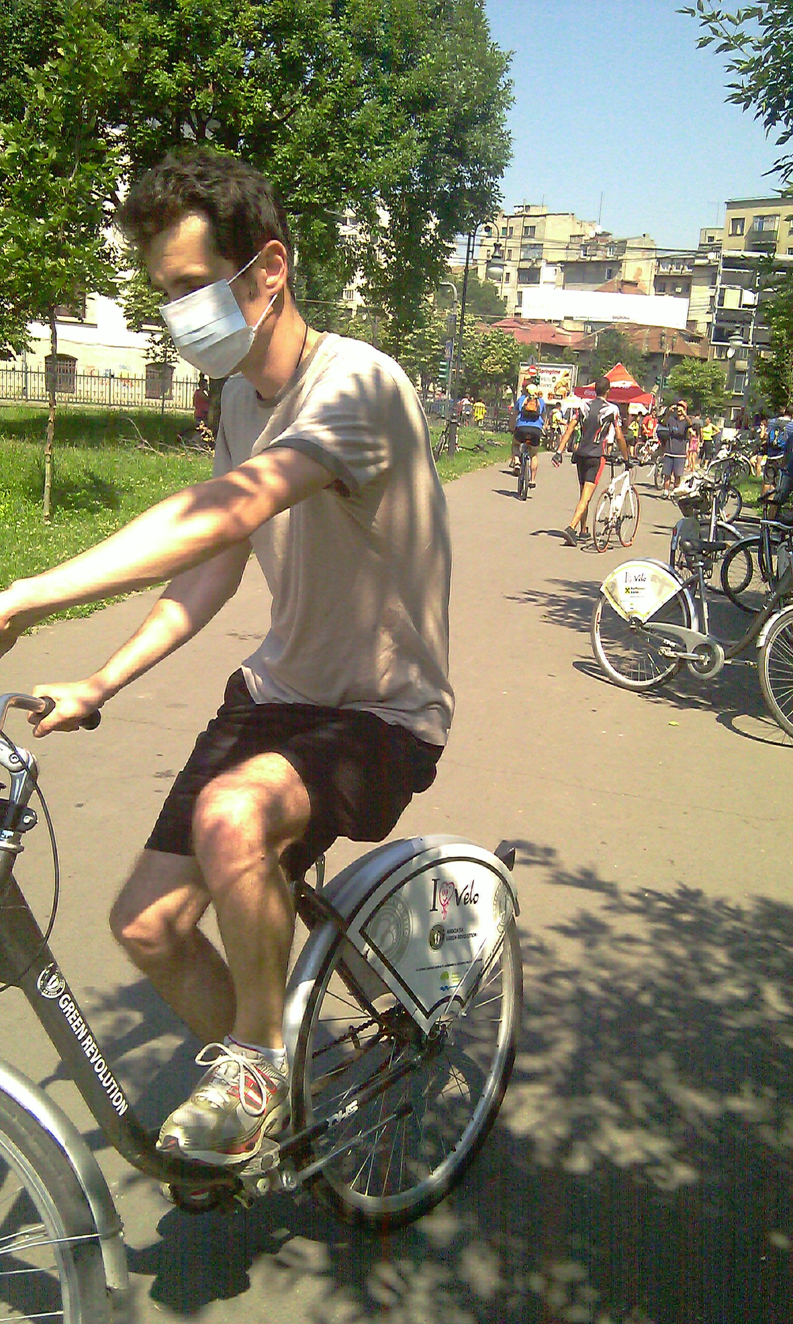 Organizatorii au distribuit gratuit bicilistilor masti pentru a-i proteja pe cat posibil de factorii ce impiedica respiratia: vara, praful si poluarea din Bucuresti