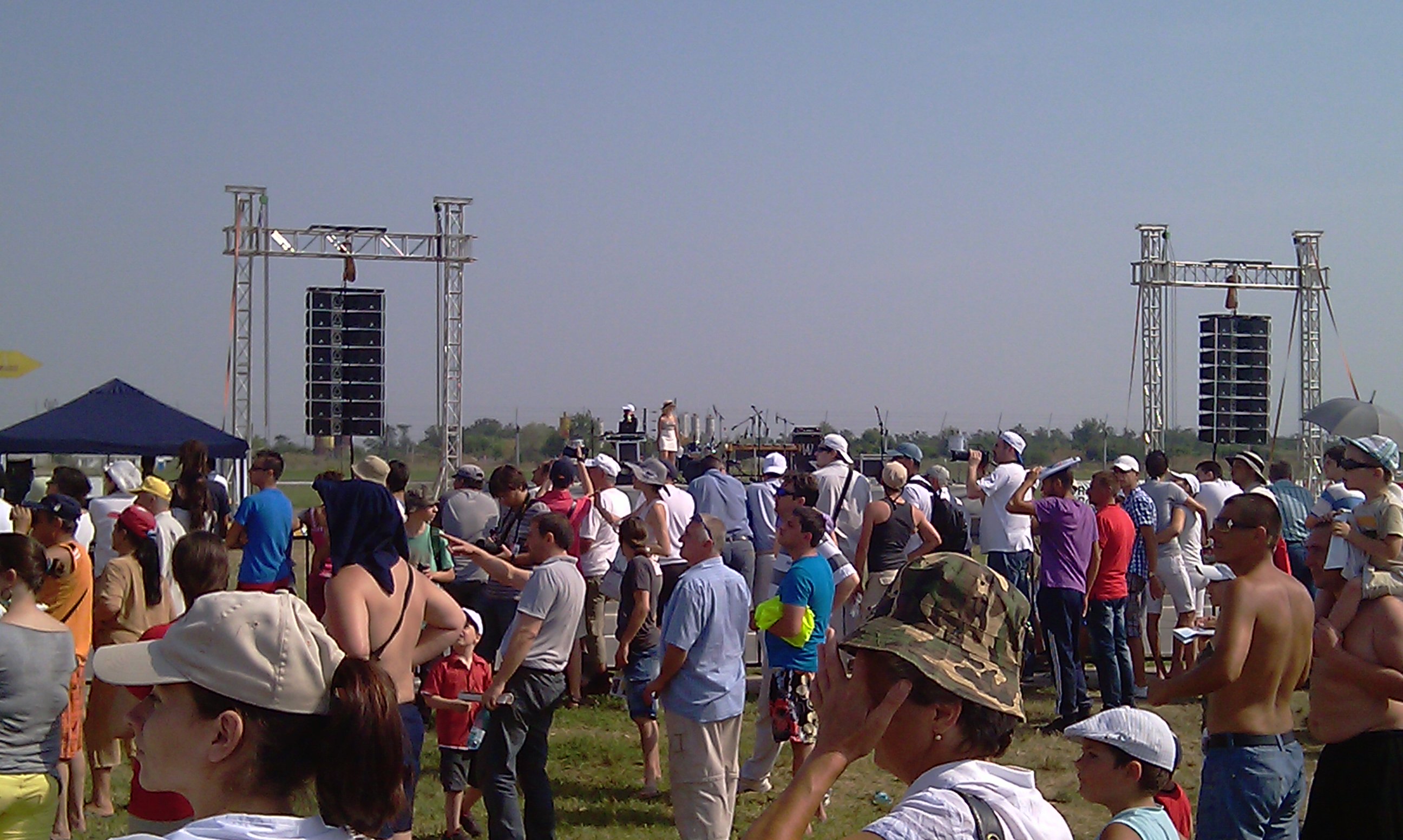 Cei care au venit cu masina personala erau ghidati ordonat catre locurile de parcare. Apoi autobuzele de aeroport incarcau spectatorii pentru a-i duce direct la locatia show-ului aviatic. Ca la orice petrecere romaneasca care se respecta, sfaraiau micii pe gratar asortati cu berea la pahar. Umbra cam putina: corturile VIP, cateva masute cu umbrelute, ceilalti ciorchine inghesuiti pe langa cate un pomisor sau gard. Bebelusa Oana a fost coprezentator al show-ului.
