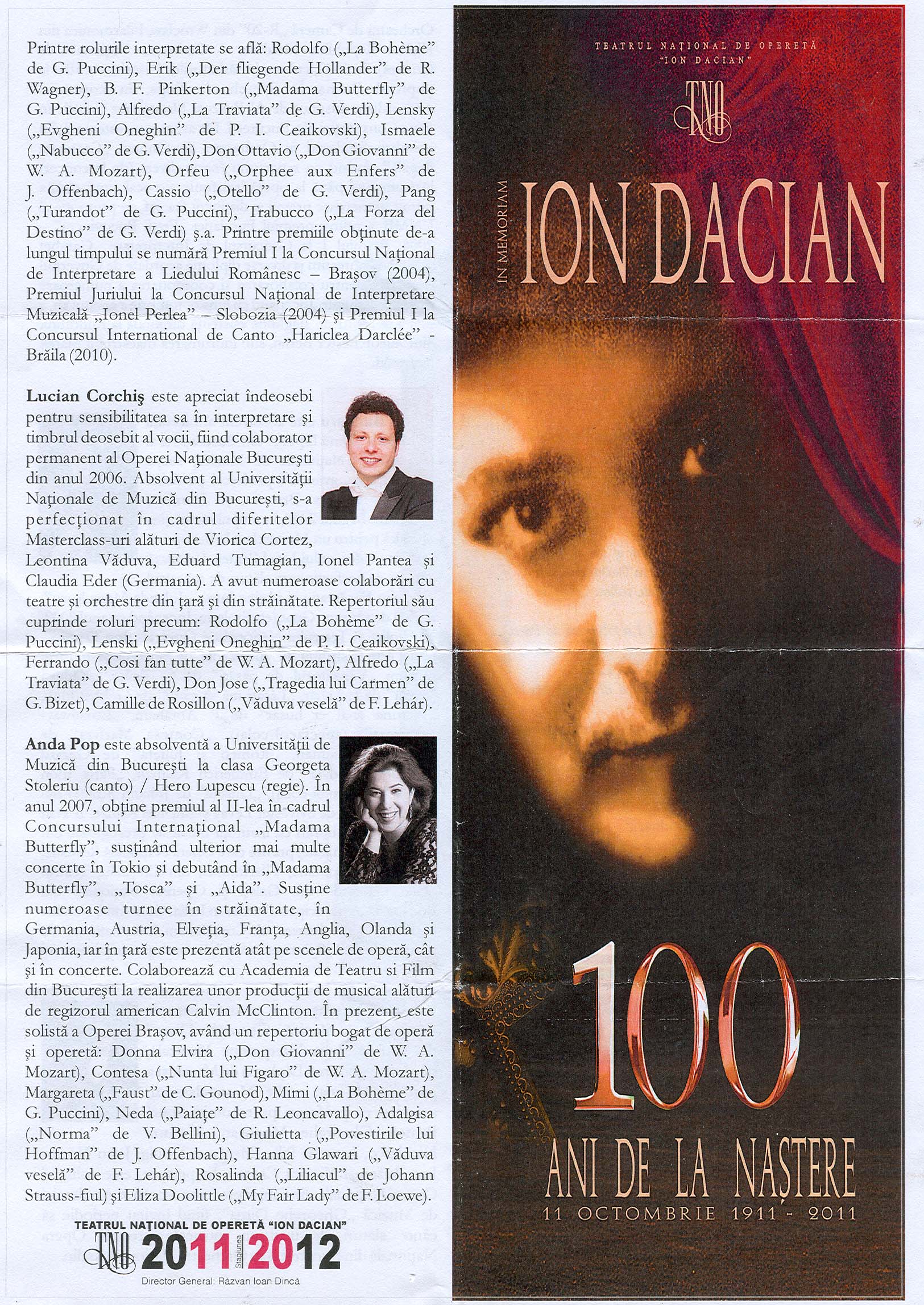 INSIDER: „Seara trecută am avut parte de o surpriză foarte plăcută – spectacolul „In Memoriam – Ion Dacian – 100 de ani de la naştere„, susţinut de trei tineri solişti – Florin Budnaru, Cristian Mogoşan, Lucian Corchiş – si de soprana Anda Pop, alături de neobosita orchestră a TNO, sub bagheta tânărului dirijor Constantin Adrian Grigore.”