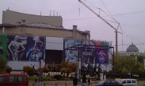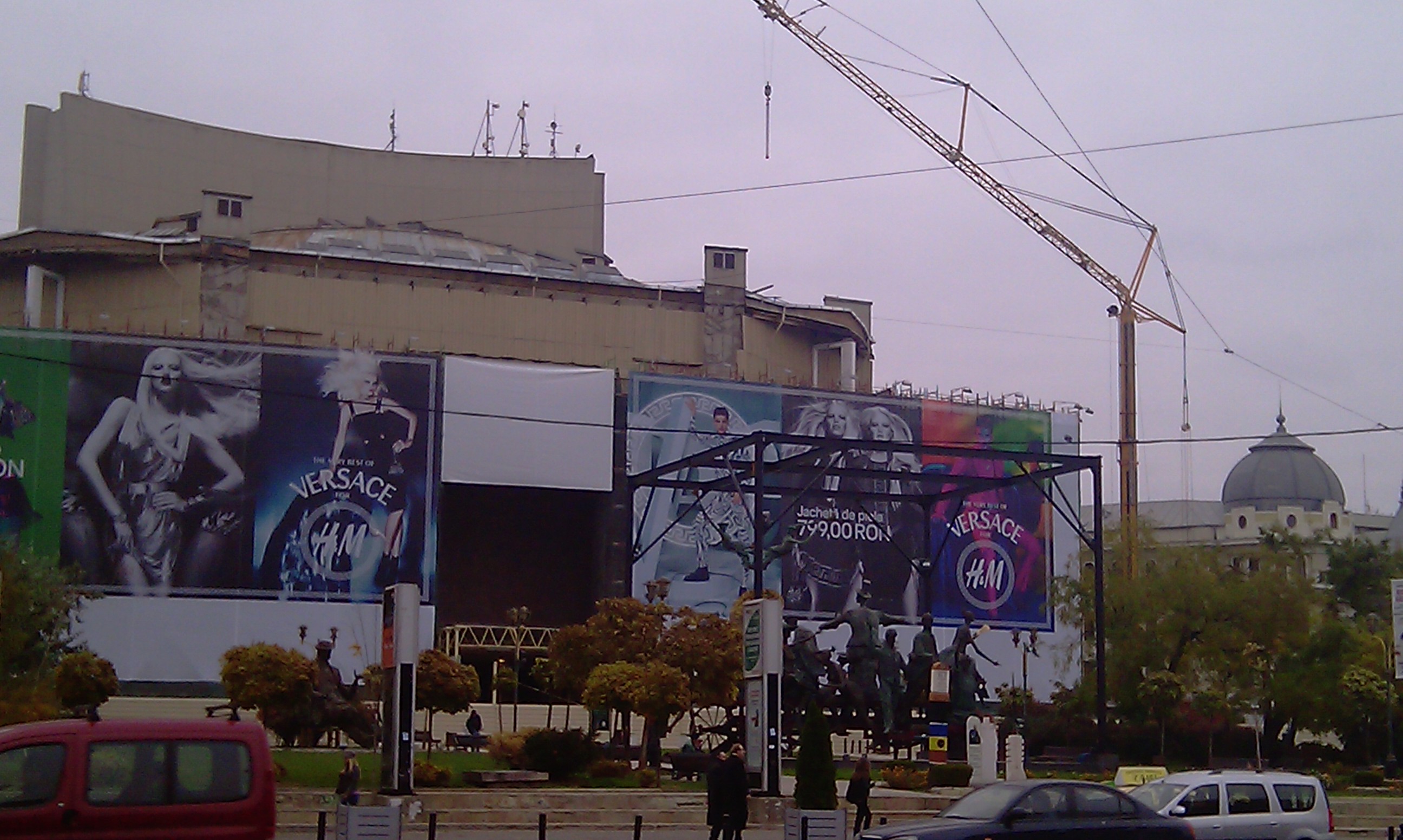 INSIDER: „Dupa ce mai multe saptamani TNB-ul a stat in pielea goala si a uratit Piata Universitatii (km 0 al Bucurestiului!) impreuna cu santierul parcarii-subterane-de- peste-morminte a primarului Oprescu a fost imbracat de Versace – H&M. Nu arata mai bine, da’ macar are „tzoale de firma”!”