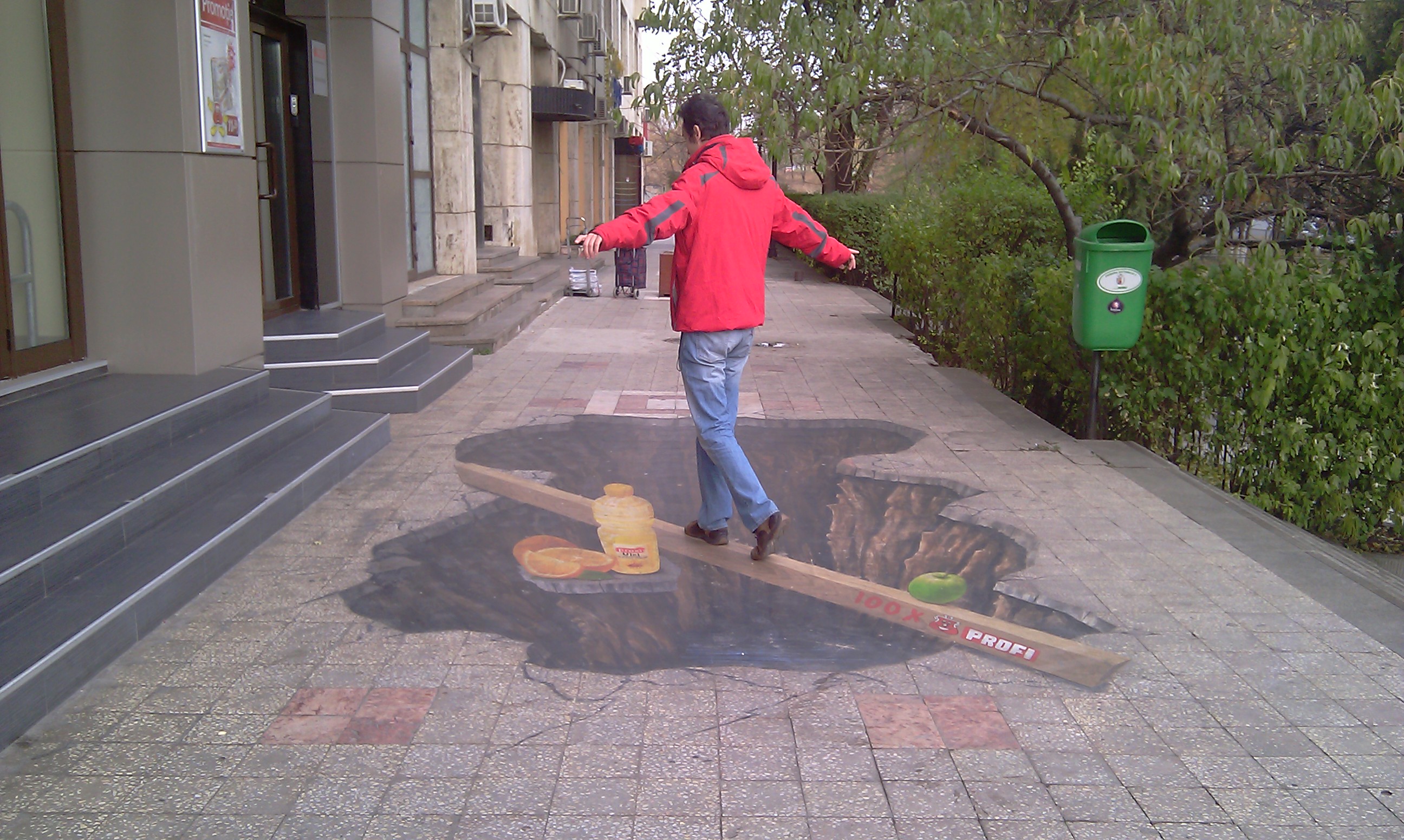 INSIDER: „Desi sunt destule gropi in Bucuresti, magazinul Profi pe Bd. Libertatii nr.1 din Bucuresti, isi atrage clientii „lasand o groapa nesemnalizata” in fata magazinului. „Groapa” 3D e realizata de celebrul pictor german Manfred Stader care a inveselit cu operele sale trotuare din mai multe capitale europene.”