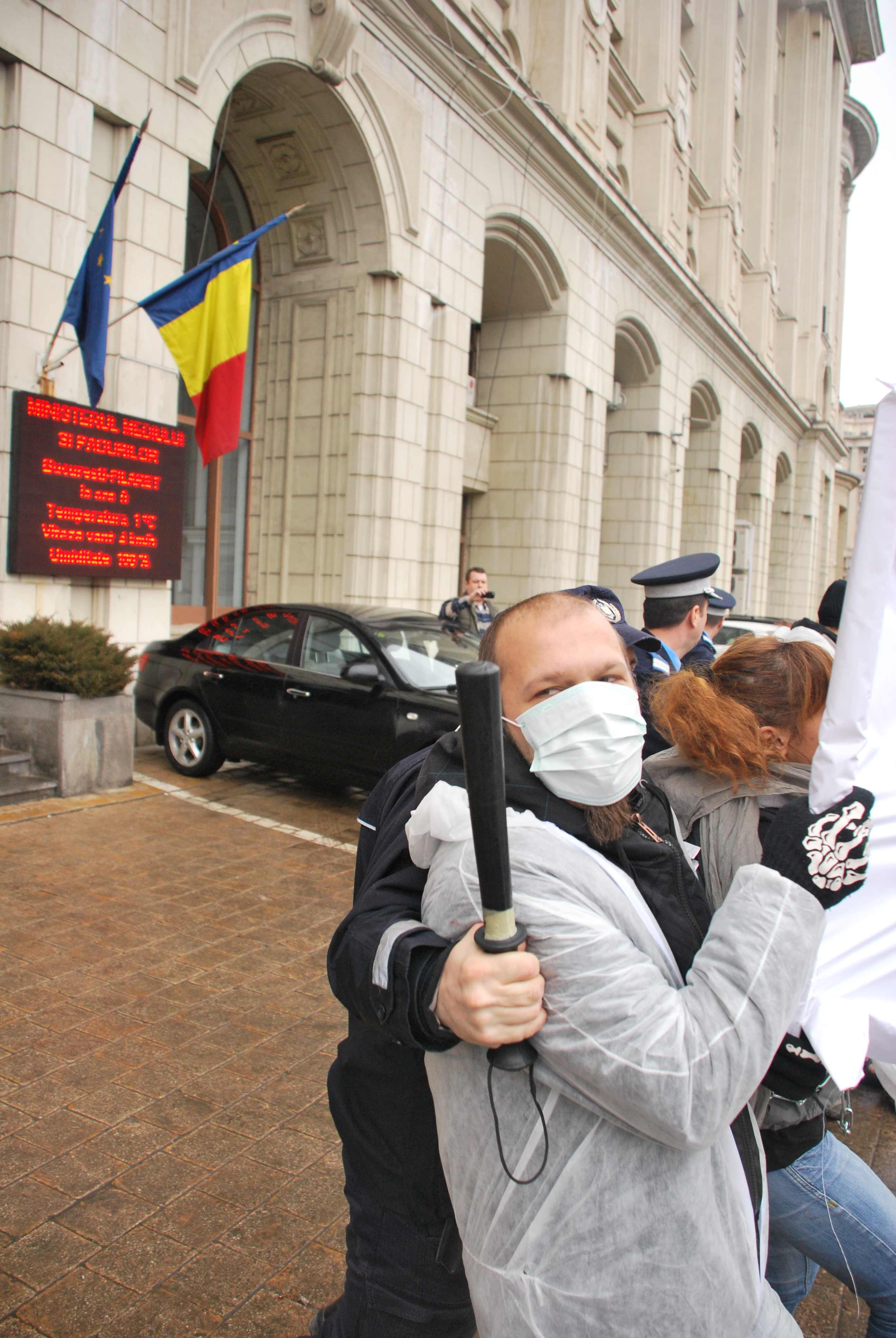 COMUNICAT: „Activistii Re.Generation au blocat in aceasta dimineata (ora. 09.45) accesul in cladirea Ministerului  Mediului si Padurilor. Ei au instituit carantina pe termen nelimitat,  in urma identificarii  unui  focar de coruptie, incompetenta si  propaganda in interiorul ministerului, focar inoculat si intretinut de  Rosia Montana Gold Corporation la cel mai inalt nivel. Activistii declara ca nu vor parasi locul actiunii pana cand ministrul  Borbely si secretarul de stat Marin Anton, principalii afectati si  responsabili de soarta Rosiei Montane, nu isi vor da demisiile sau  pana cand activistii nu vor fi luati cu forta din fata ministerului. Fortele de ordine din minister au intervenit violent pentru stoparea protestului. Mai multi activisti au fost raniti.”