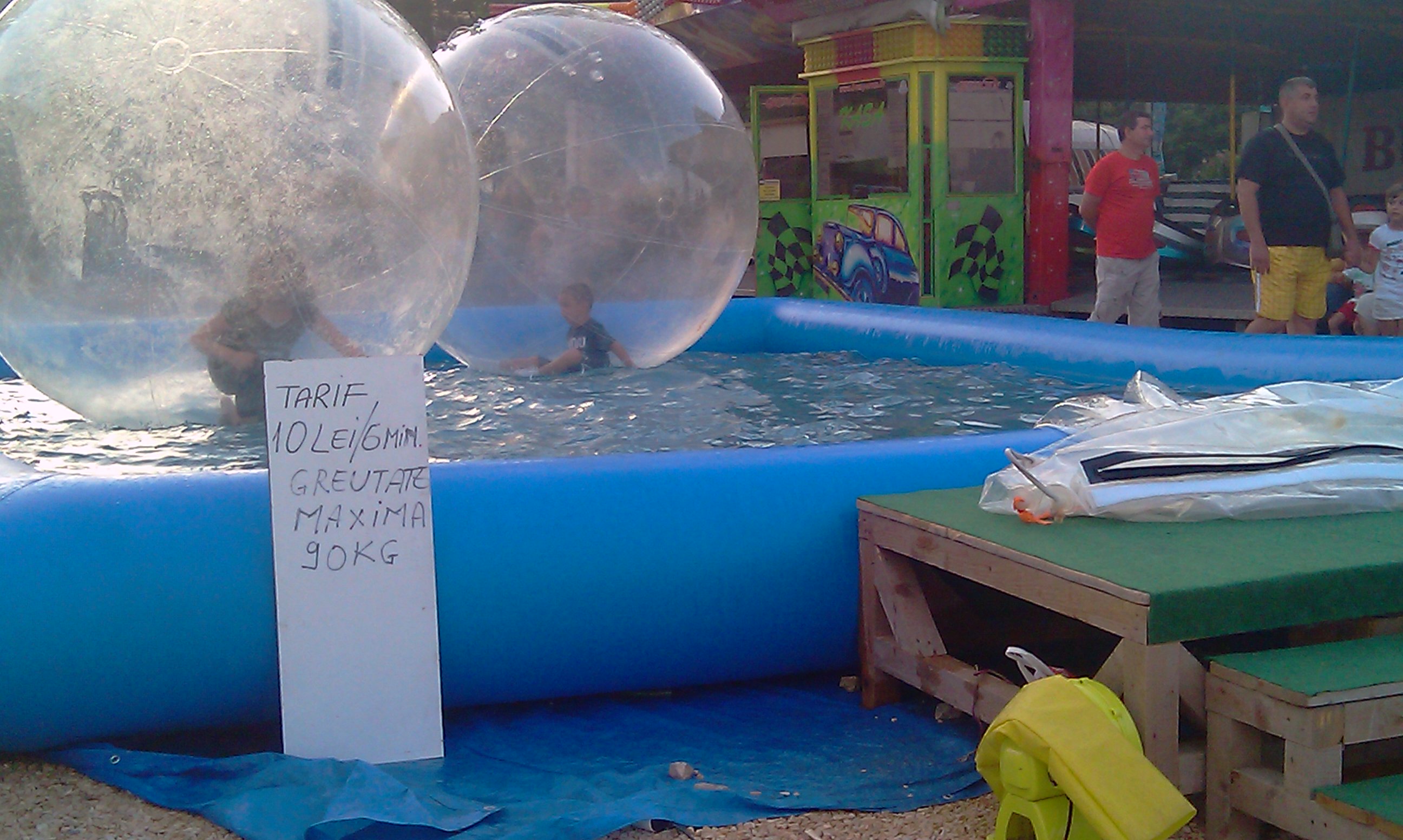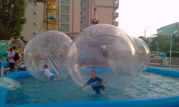 INSIDER: „Zorbing este un nou sport extrem apărut în România (acum şi în Eforie Nord!), provenit din Noua Zeelandă. Zorbing-ul constă în rostogolirea unei mingi gonflabile, numită zorb (diametru 2.6-3.8 m), în care se află una sau mai multe persoane şi se poate practica pe gheaţă, gazon, pământ sau zăpadă, dar şi pe apă. Balonul cu care se practica acest sport este o minge gonflabila de marimi gigantice, din poliuretan termoplastic (TPU – 0,8 mm/1 mm) transparent, foarte flexibila si cu rezistenta sporita la zgarieturi si temperaturi extreme (de la -20 grd pana la +50 grd). Pe plajă, preţul este de 15 lei/3 minute, dar în parcul copiilor găsiţi varianta mai ieftină de 10 lei/6 minute.”