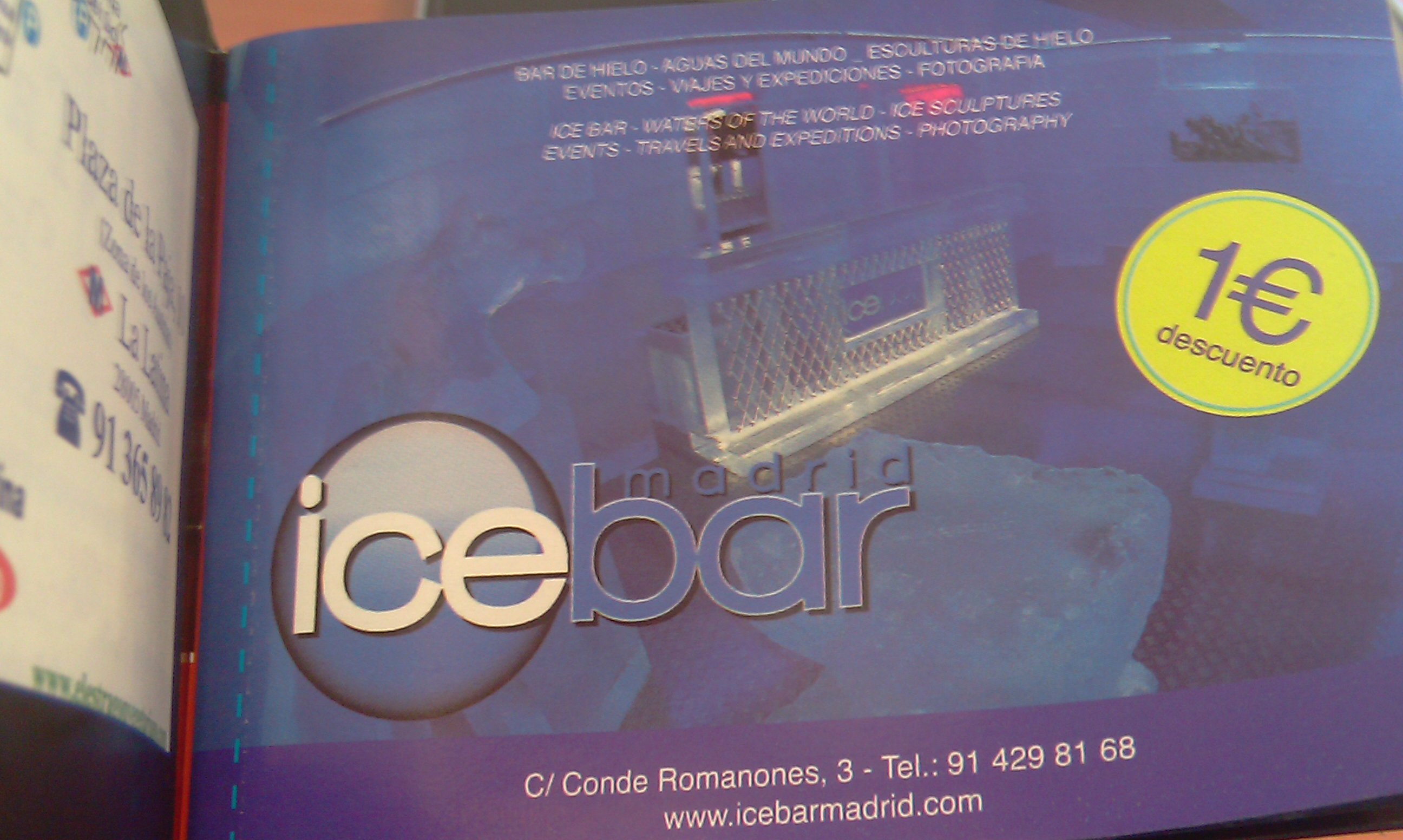 cupoane de reducere pentru diferite atracţii turistice madrilene: muzee, baruri, spectacole, expoziţii. La capitolul baruri, de departe cel mai spectaculos şi de neratat mi s-a părut Ice Bar – situat în buricul Madridului pe Calle Conde de Romanones Nr.3 (staţia de metrou Tirso de Molina) la 300 de metri de Puerta del Sol şi The Plaza Mayor.