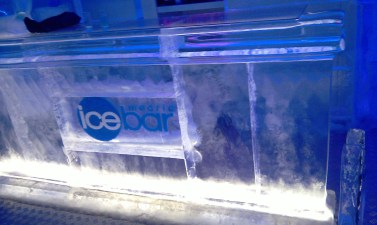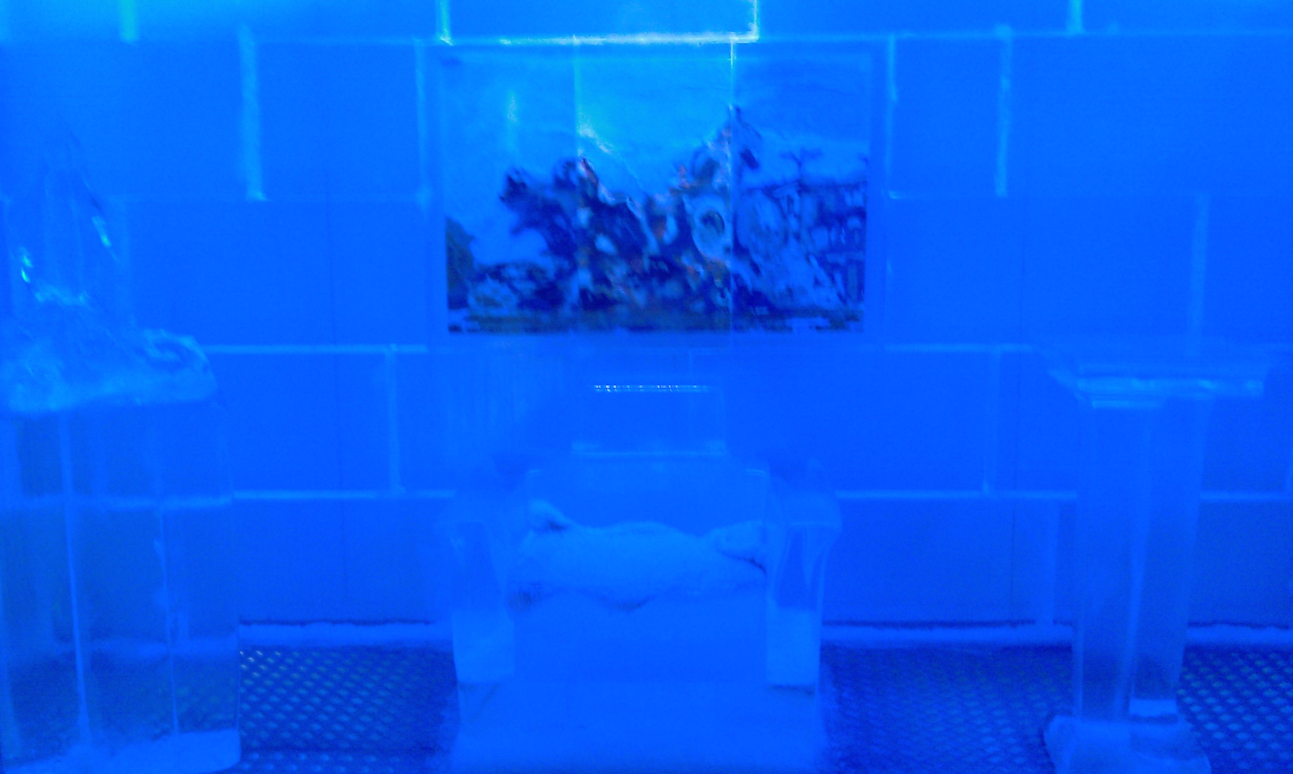 Marele „Ice Bar de 400 mp” este de fapt un bar de gheaţă 70 mp, într-un frigider puţin mai mare… Am intrat uşor timoraţi pe un holişor îngust şi cam întunecat, direct din stradă însorită, după ce trecusem de câteva ori prin faţa şi-l ratasem. Intrarea este 15 euro (!!!), dar aveam un cupon de reducere de 1 euro… În preţ intră şi un shoot de votcă dintr-un paharel de gheaţă.