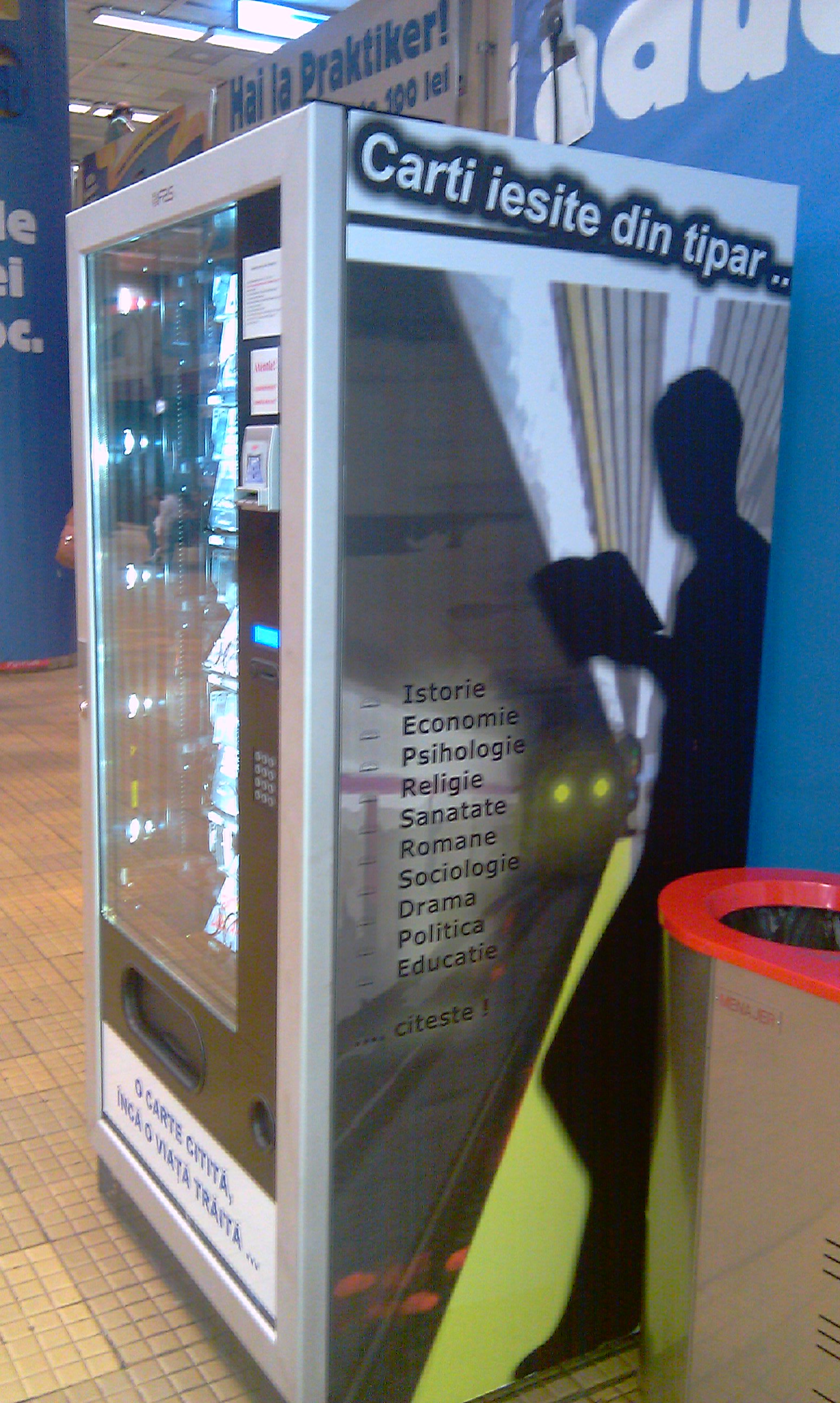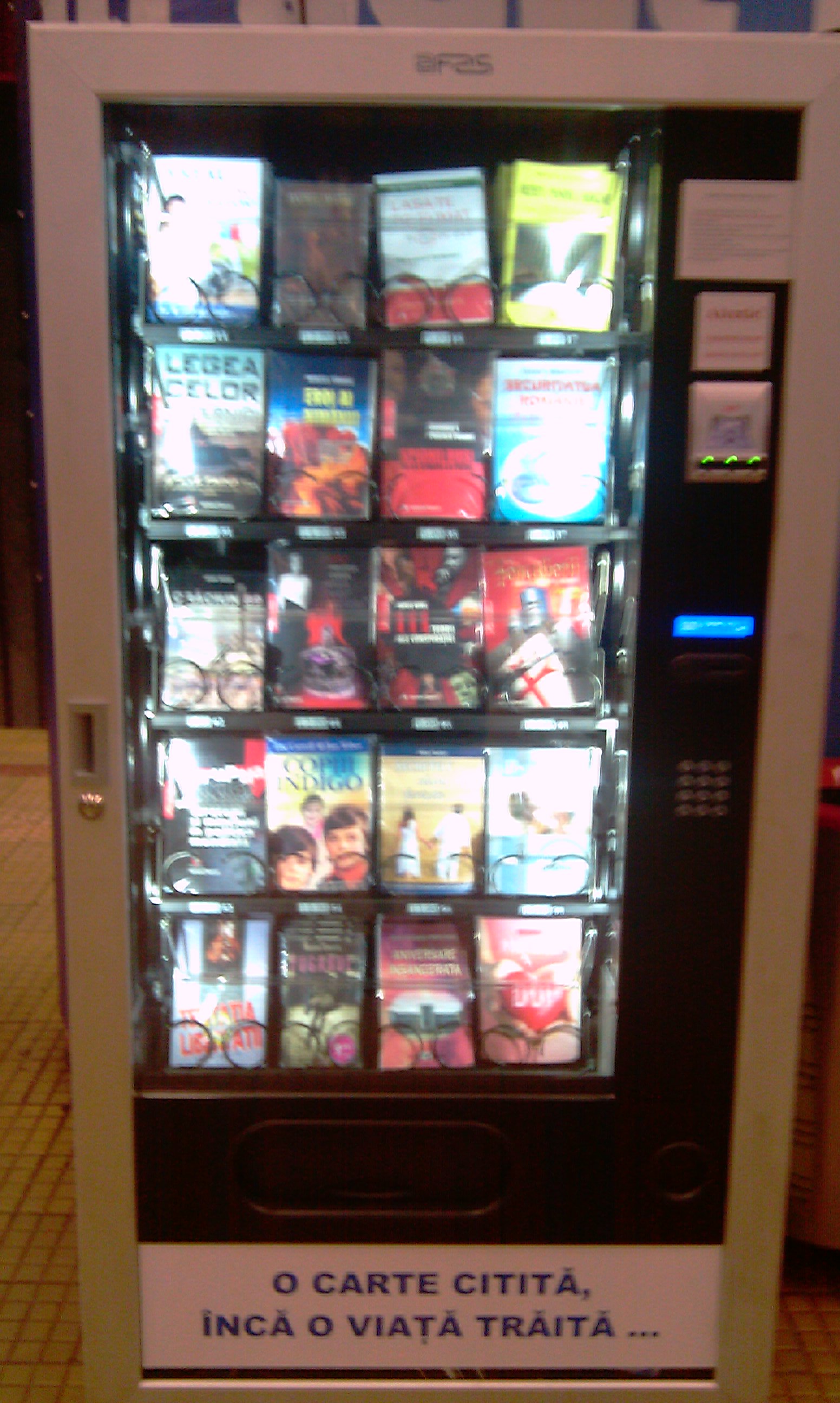 INSIDER: „În România sunt automate de cartele telefonice, băuturi, ciocolată, sandvişuri, iar prin ţări străine am mai văzut şi de buchete de flori, prezervative, ţigări, bilete transport. Mai nou, pe peron, în staţiile de metrou Piaţa Unirii 1 şi la Piaţa Victoriei au apărut de curând şi tonomate de cărţi. Funcţionează cu bancnote de 1, 5 şi 10 lei, iar preţurile sunt cuprinse între 5 şi 14 lei. Cărţile care se vând la aceste tonomate sunt de unică folosinţă, o citeşti şi o uiţi în metrou: “Lasă-te de fumat”, “Vreau să slăbesc sănătos”,
