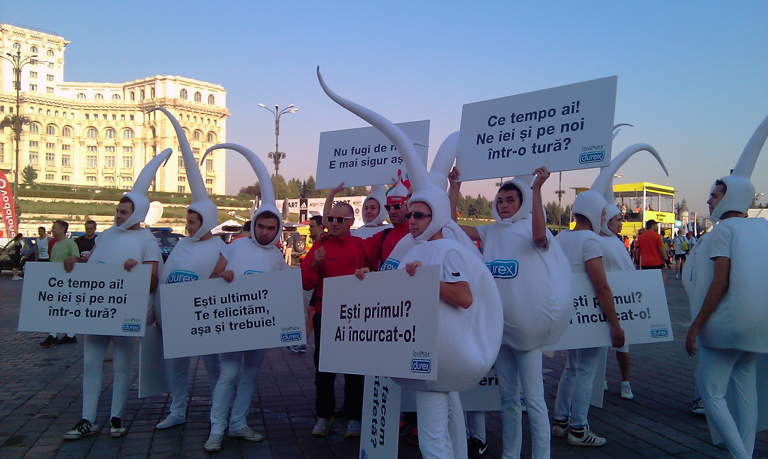 O familie de alergători împreună cu gemenii în carucior dublu. Printre sponsorii maratonului, Durex a gândit nişte mascote foarte haioase: nişte spermatozoizi foarte zglobii care pe lângă alergat haotic au ajutat şi la hidratarea sportivilor în punctul situat lângă Arena Naţională (Stadionul “Lia Manoliu”). Obosiţi şi bătuţi de soare am crezut iniţial că ne oferă prezervative. O surpriză plăcută pentru finish-eri, a fost medalia de 250 grame, mult mai mare decât cea de anul trecut.