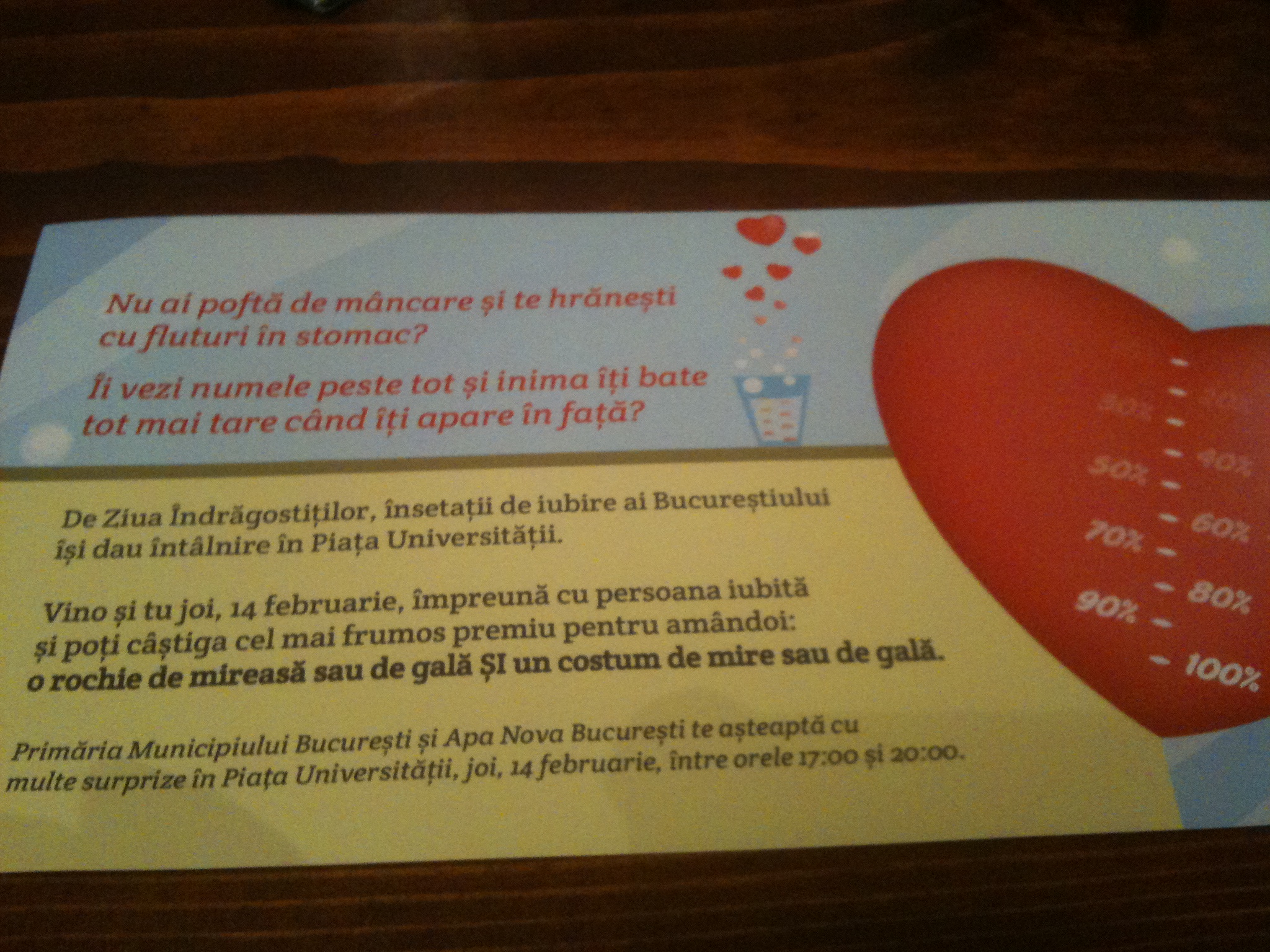 Marele premiu a fost o rochie şi un costum de ginere, asta dacă îndrăgostiţii degeraţi mai apucă ziua nunţii. Trecătorii erau ademeniţi cu o “felie de tort cu cireaşă” care, de fapt, era un prosopel. Organizatori: Apa Nova + Primăria Capitalei + Bien Savvy = LOVE?”