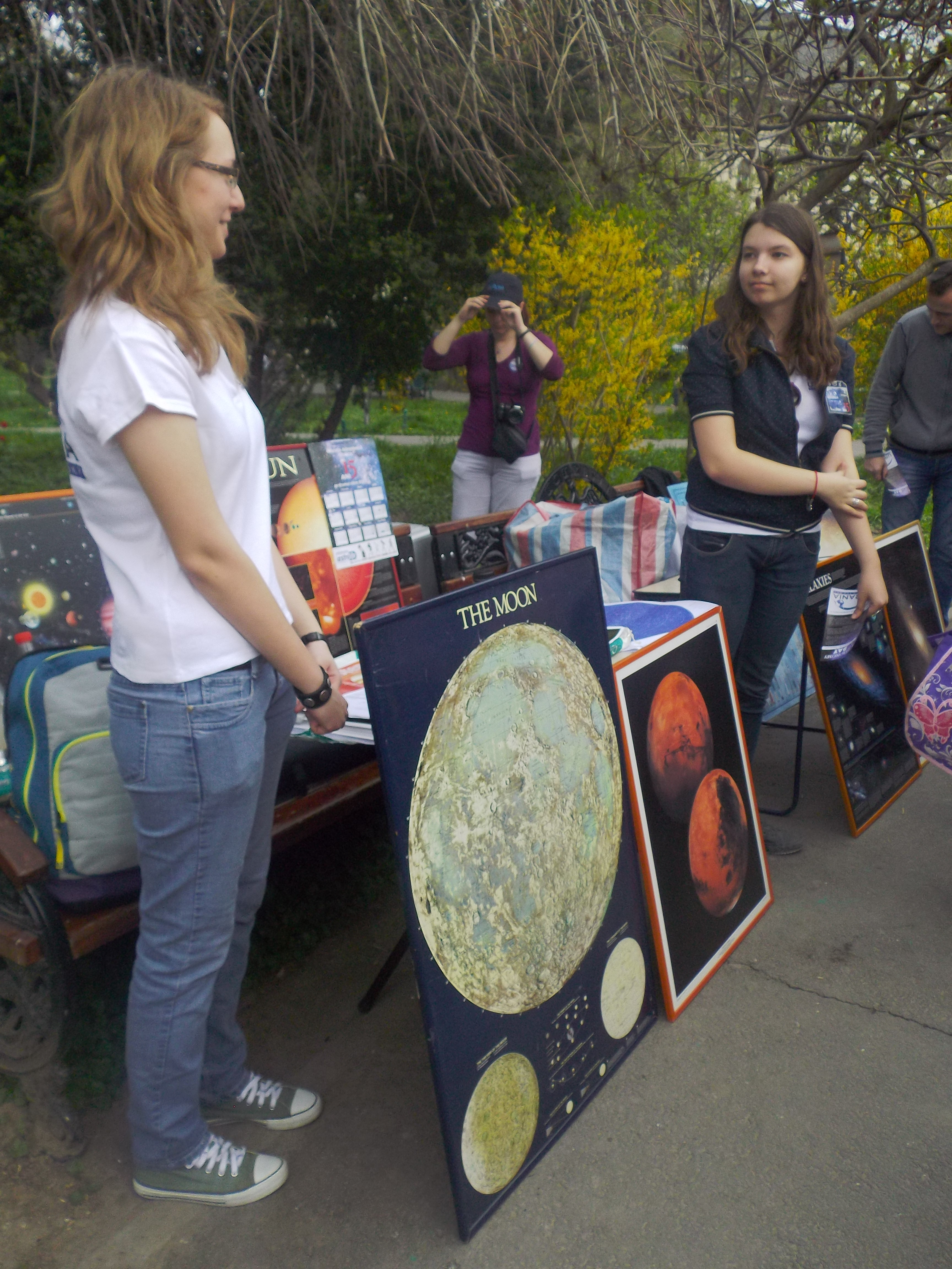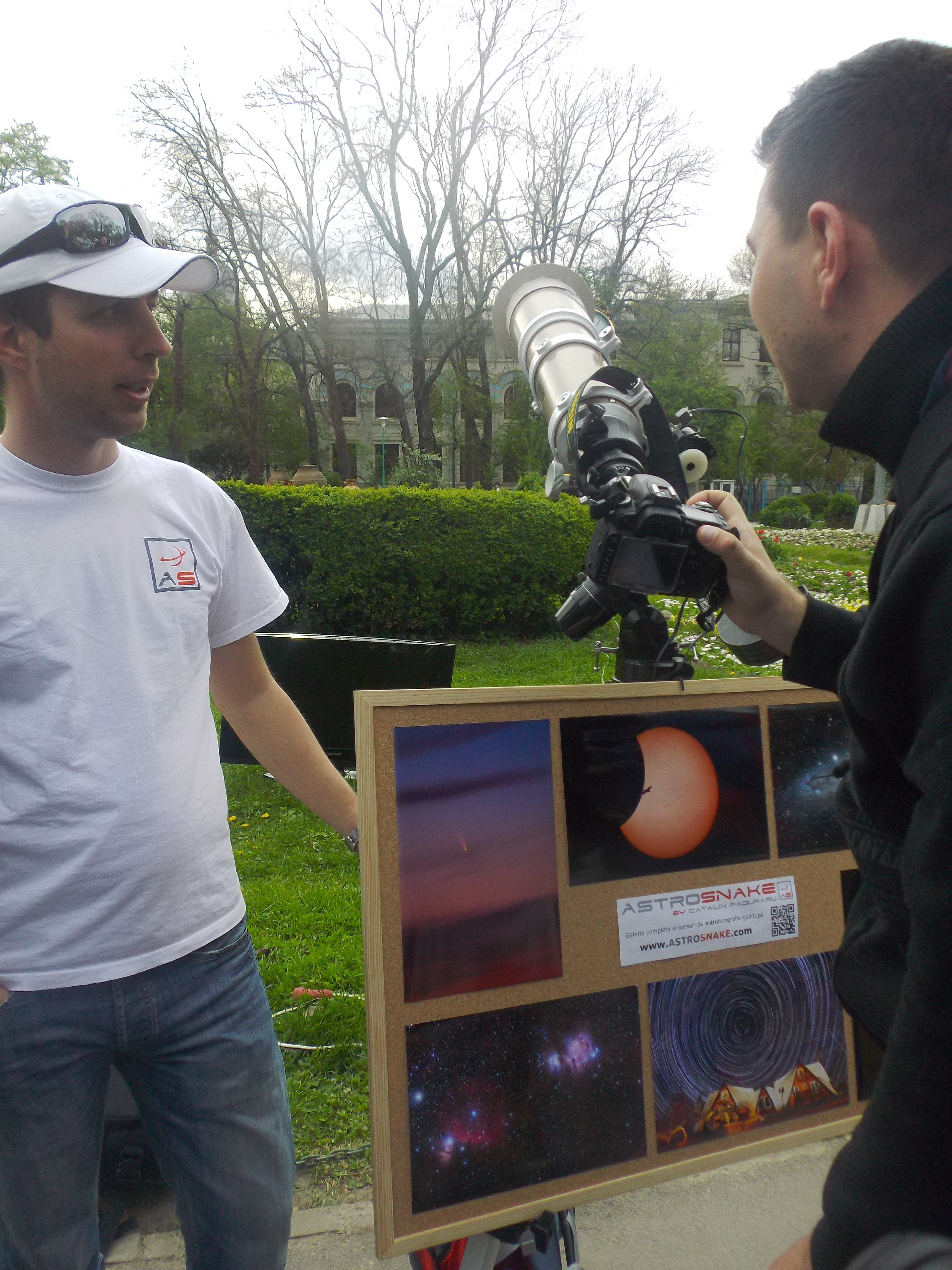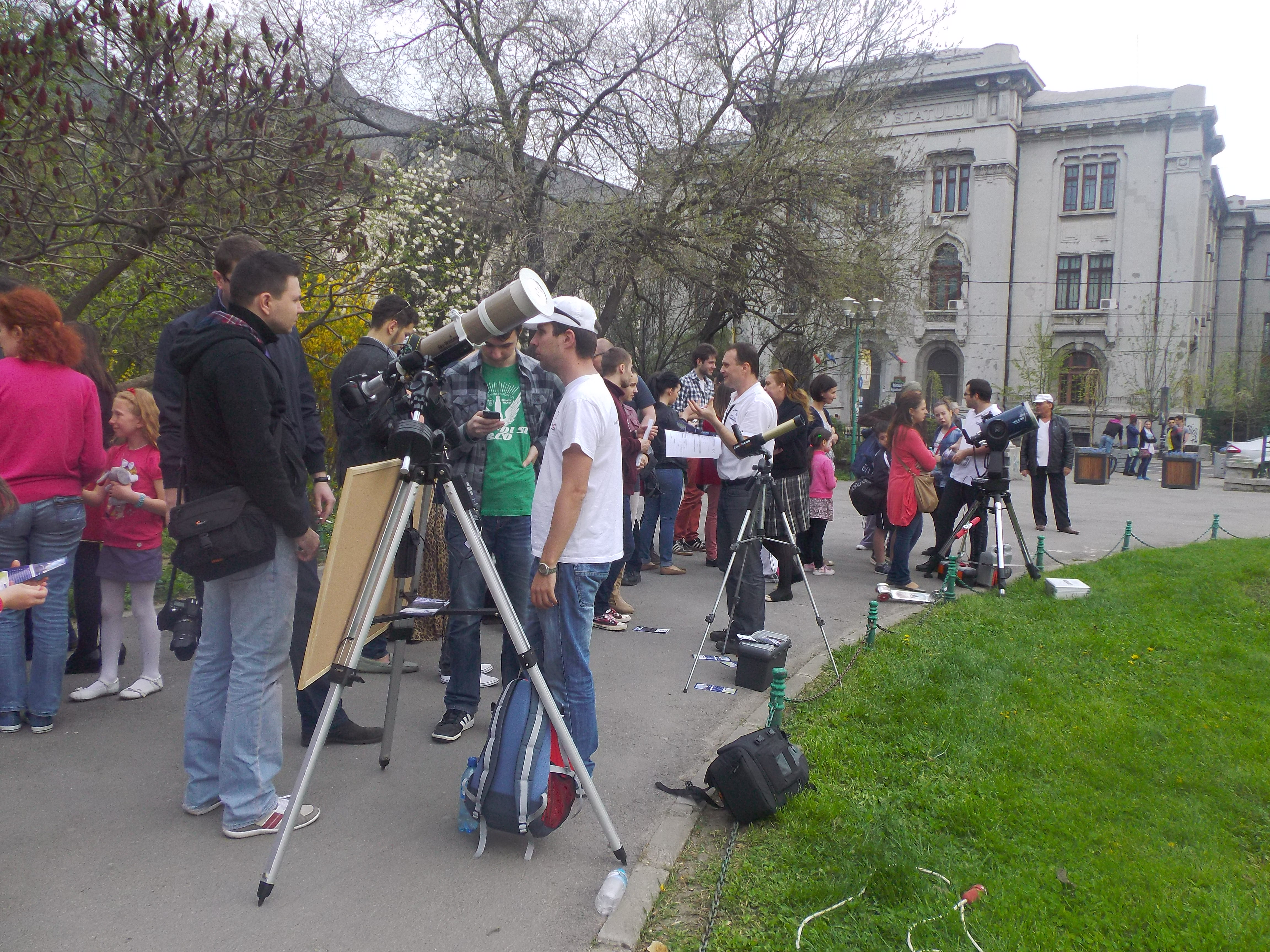 Ieri, 20 aprilie 2013, între orele 15:00 – 23:00 în Grădina Cişmigiu, Asociaţia Astronomică URANIA a oferit gratuit publicului informaţii legate de astronomie şi demonstraţii de utilizare a instrumentelor astronomice. În timpul zilei, cei interesaţi au putut privi Soarele prin instrumente dotate cu filtre speciale de protecţie, iar după lăsarea serii, Luna, planeta Jupiter şi alte corpuri cereşti (roiuri stelare, nebuloase şi galaxii).