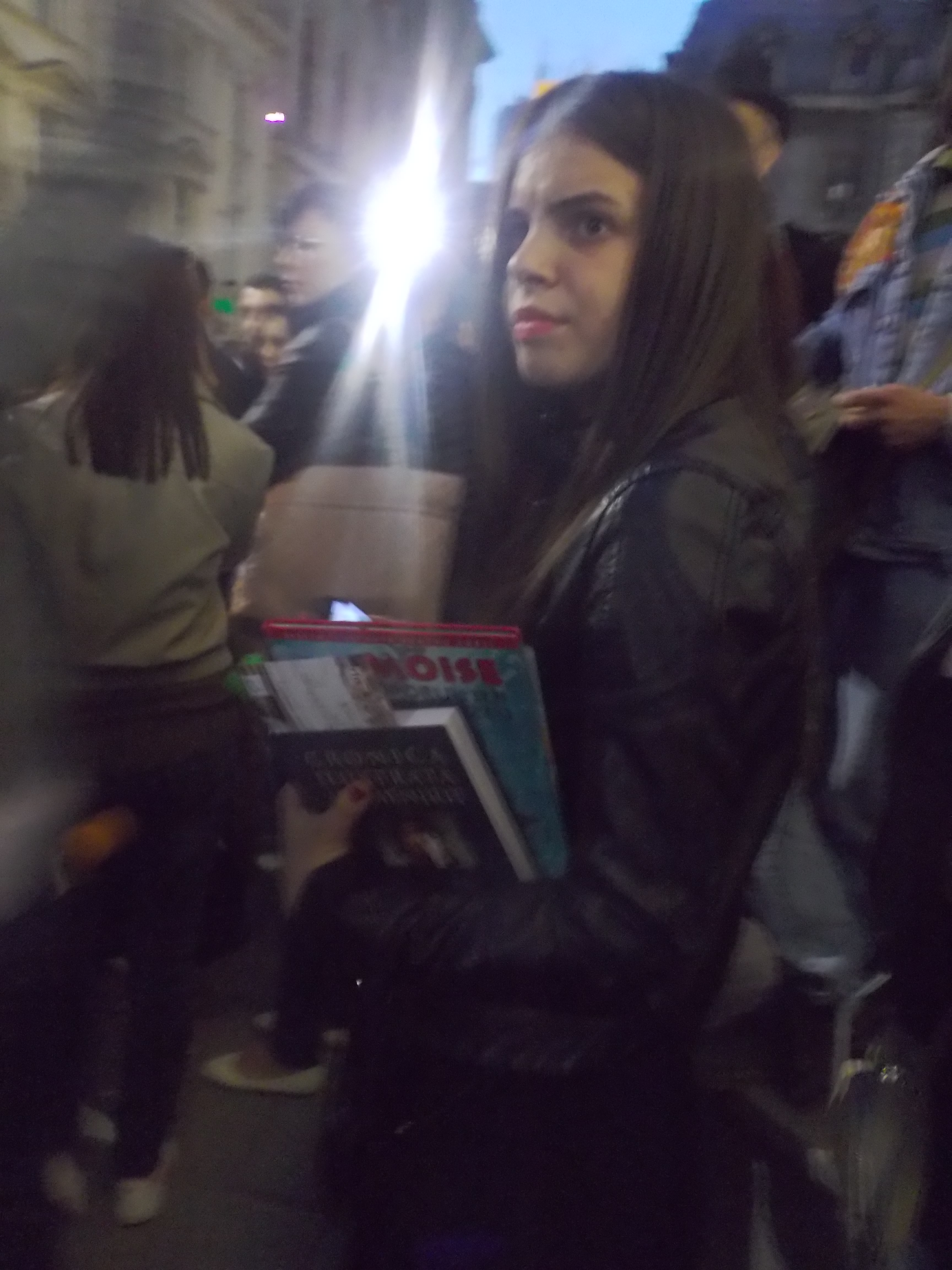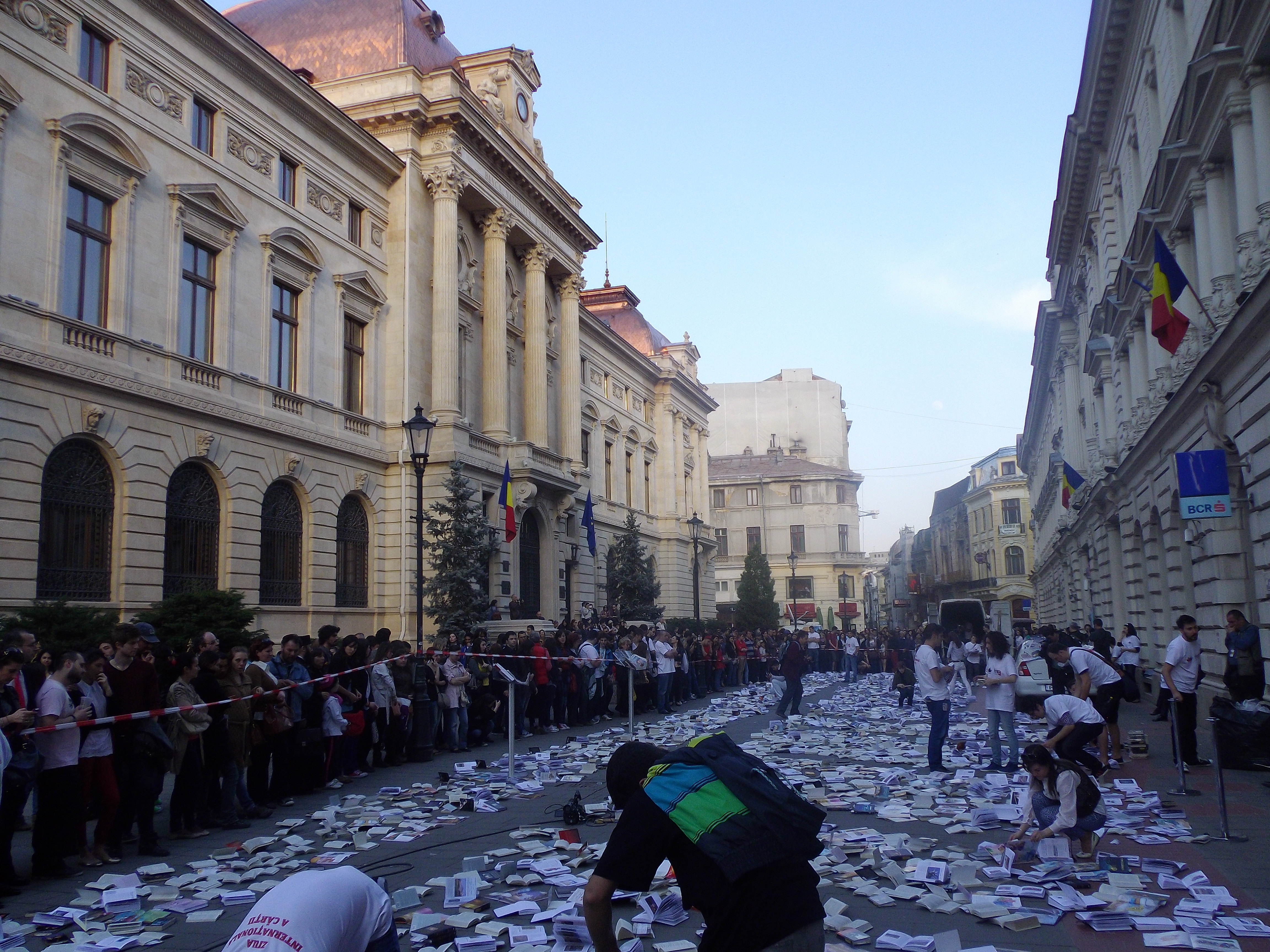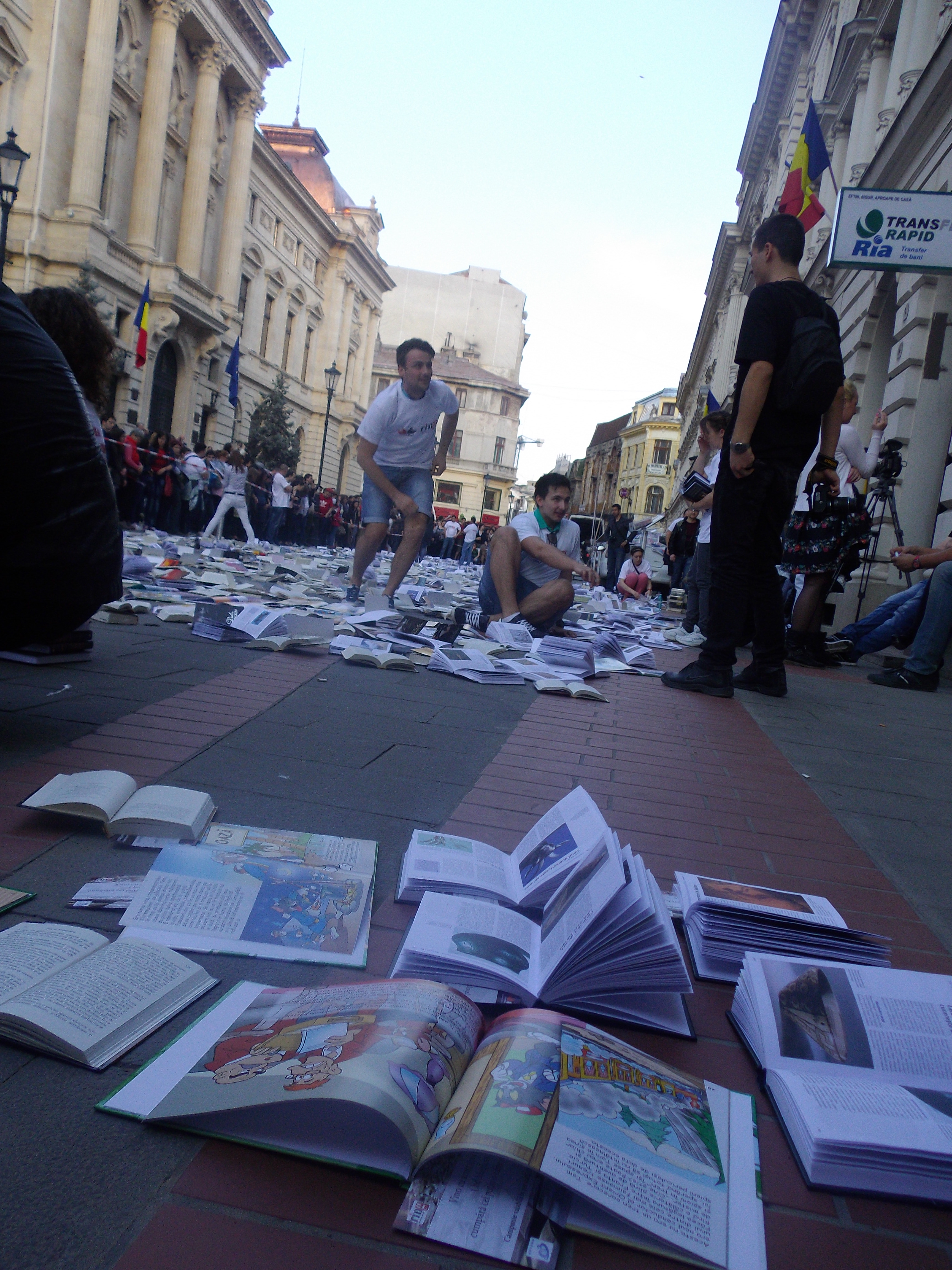 Timp de doua ore şi jumătate, cititorii au aşteptat cu speranţă şi apoi eroic s-au călcat în picioare pentru o carte, indiferent care. O doamnă triumfatoare ţinea în braţe o carte roz cu “Tom şi Jerry” pe copertă, iar alţii mai norocoşi, spre invidia generală, apucaseră chiar mai multe. Scările de la BNR au devenit singurul refugiu pentru jurnaliştii care savurau atmosfera frenetică, dar şi pentru trecătorii şi căţeii maidanezi neinteresaţi de lectură, ajunşi fără vină pe frontul ostilităţilor.” DETALII