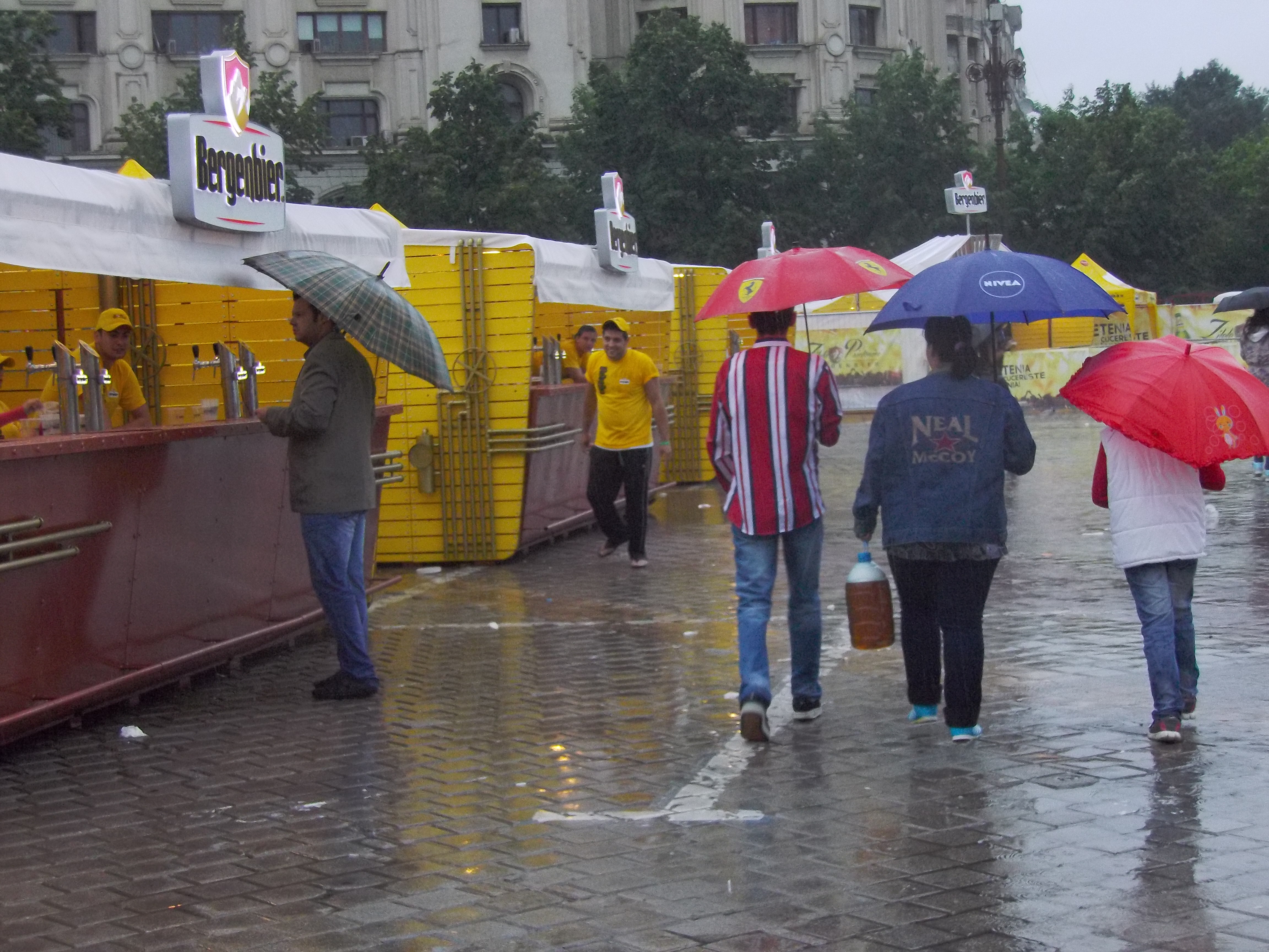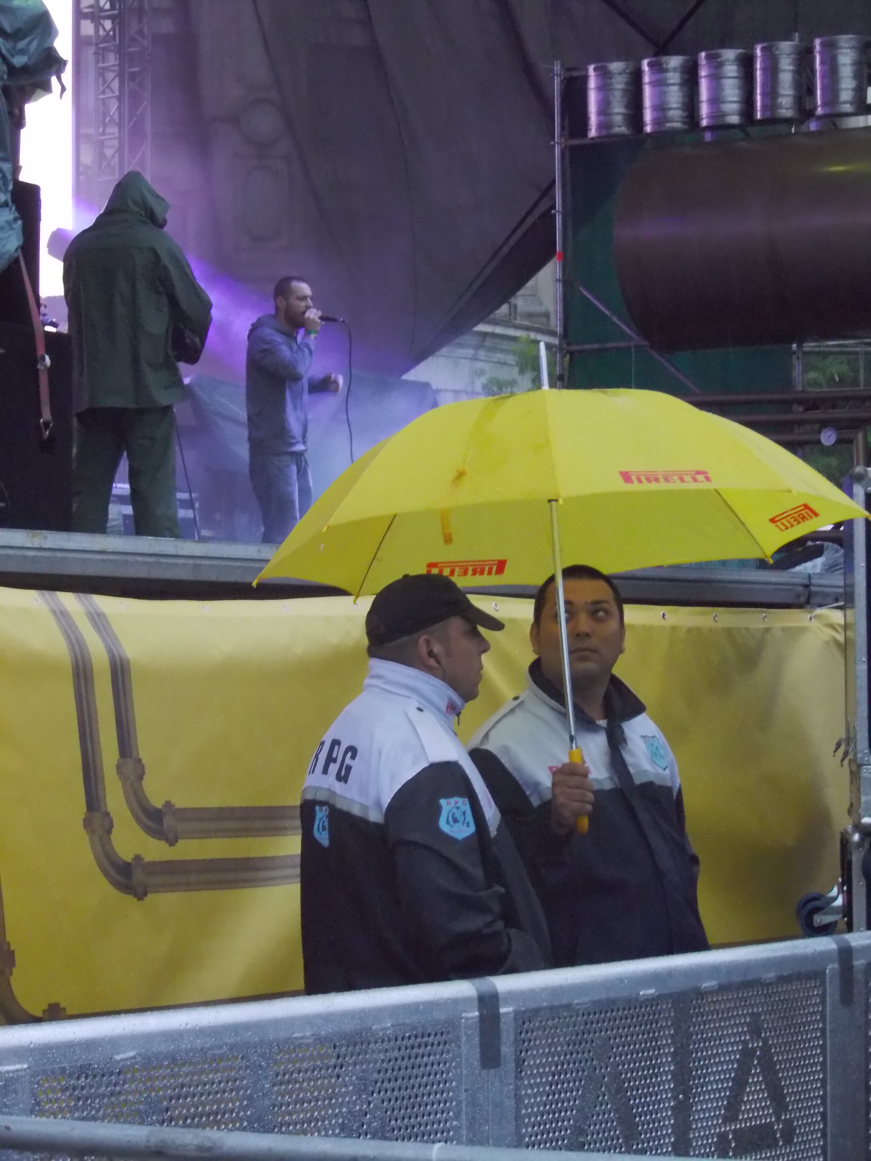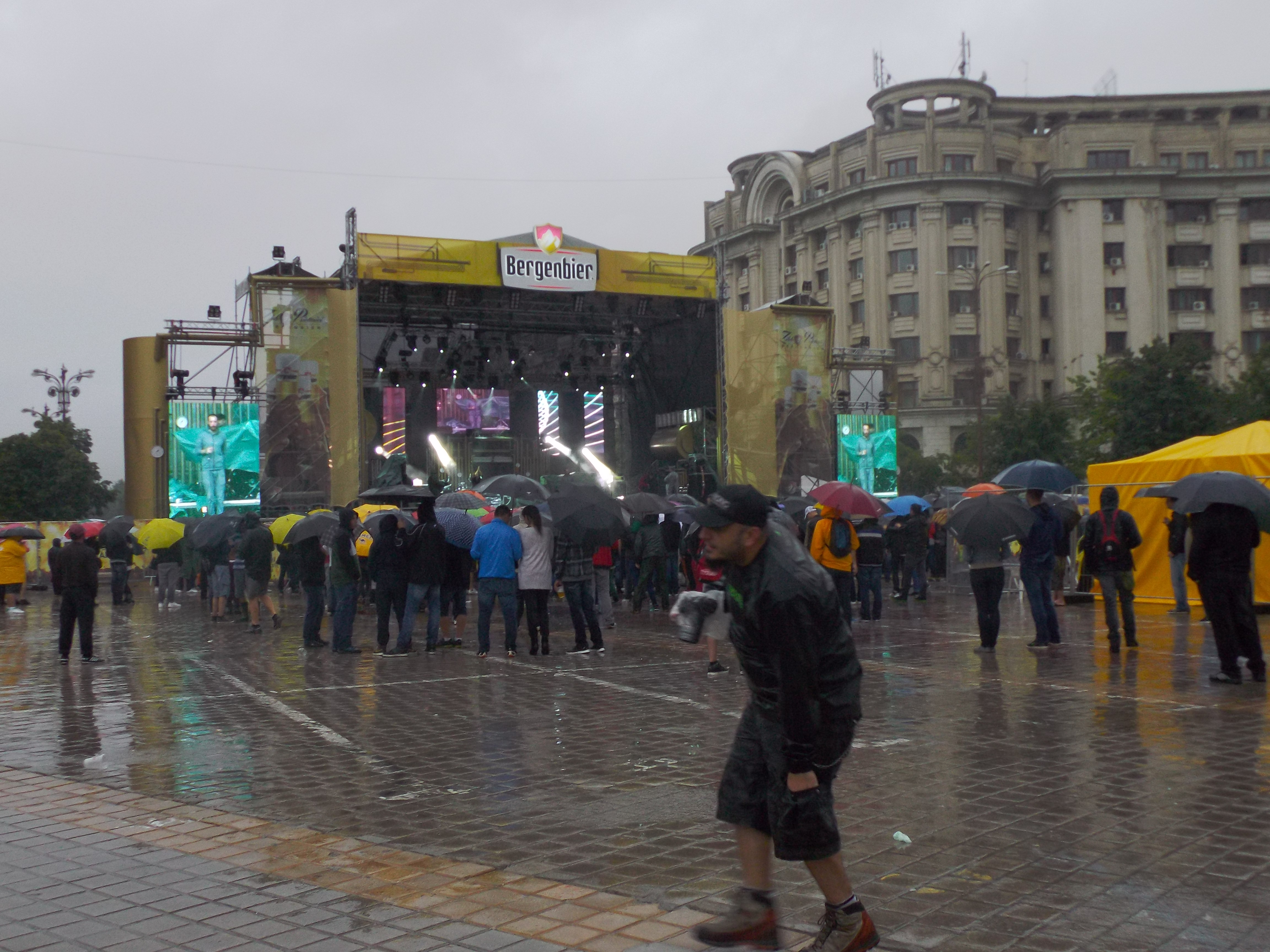 IMGP4113 IMGP4105 IMGP4121 IMGP4107 IMGP4125 IMGP4109Ploua pe scenă, ploua în culise, chiar şi fetele care vindeau jetoane pentru bere stăteau cu umbrele în gheretele aferente… Se pare că nimeni, nici măcar organizatorii, nu a consultat vreo prognoză meteo. Cei care trebuiau să asigure paza şi protecţia în timpul concertului păreau că se păzesc cel mai bine de ploaie.