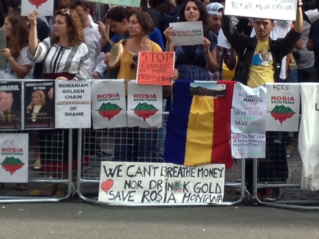 LONDRA: Protest „Salvaţi Roşia Montană!”, ieri, pe High Street Kensington. „Golden chain of shame!”