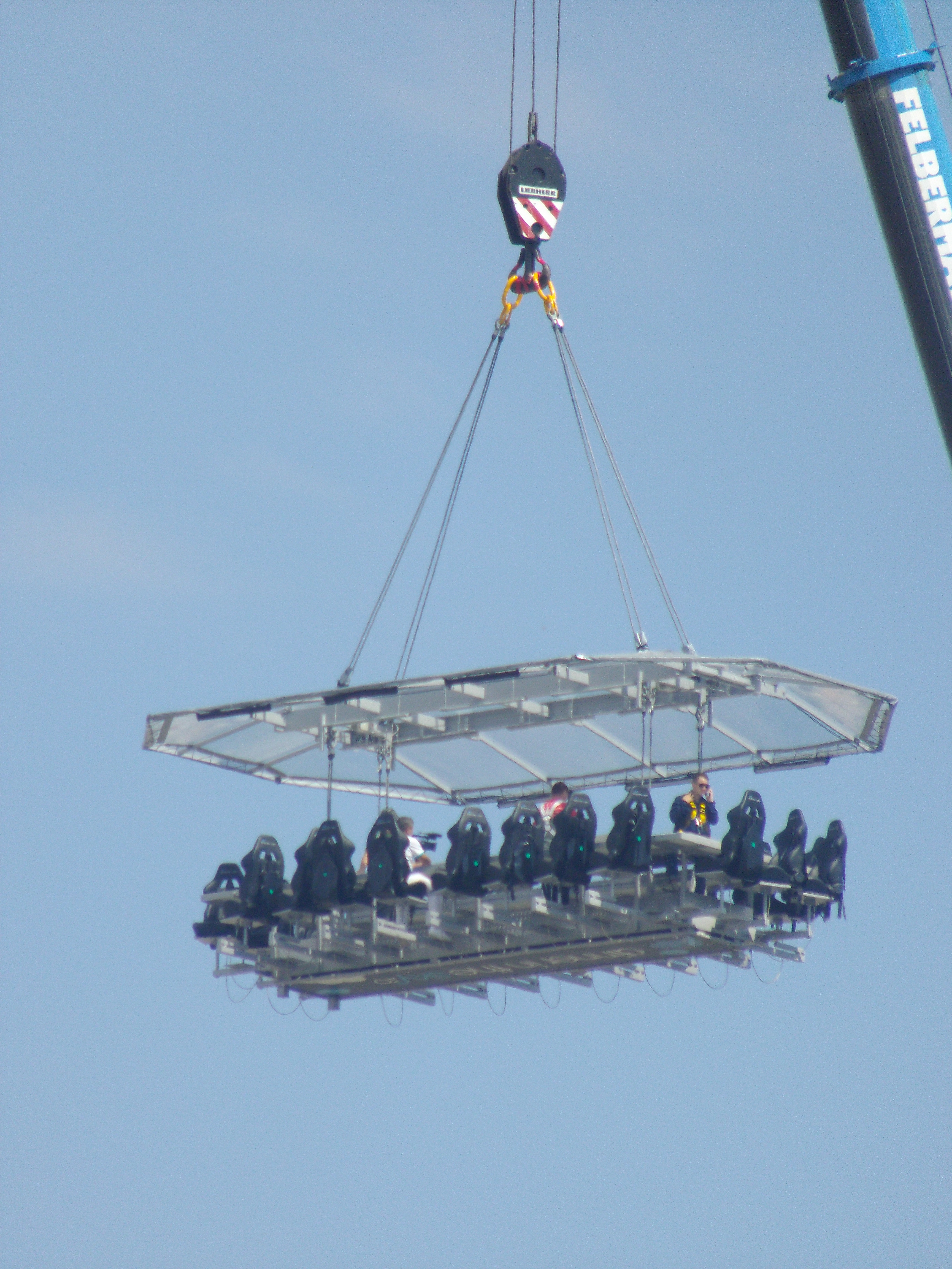 Masa este suspendată cu ajutorul unei macarale la 50 de metri altitudine, adică înălţimea unui bloc cu 15 etaje, având o capacitate de 22 de persoane. În mijlocul ei, se află bucătarul-şef, chelnerul şi un entertainer care are misiunea să creeze o atmosferă de bună dispoziţie. Masa are o lungime de 9 x 5 m şi cântăreşte 5 tone. Pot fi servite simultan 22 de persoane, iar scaunele se pot roti la 180 de grade, astfel încât mesenii să poată admira fără restricţii priveliştea. Macaraua cântăreşte între 90 şi 160 de tone, iar spaţiul necesar la sol pentru montarea şi functionarea întregului arsenal este de 35 x 15 m. Înălţimea maximă la care poate fi ridicată masa este de 50 m, terenul pe care se amplasează macaraua măsurand minim 500 metri pătraţi. DETALII