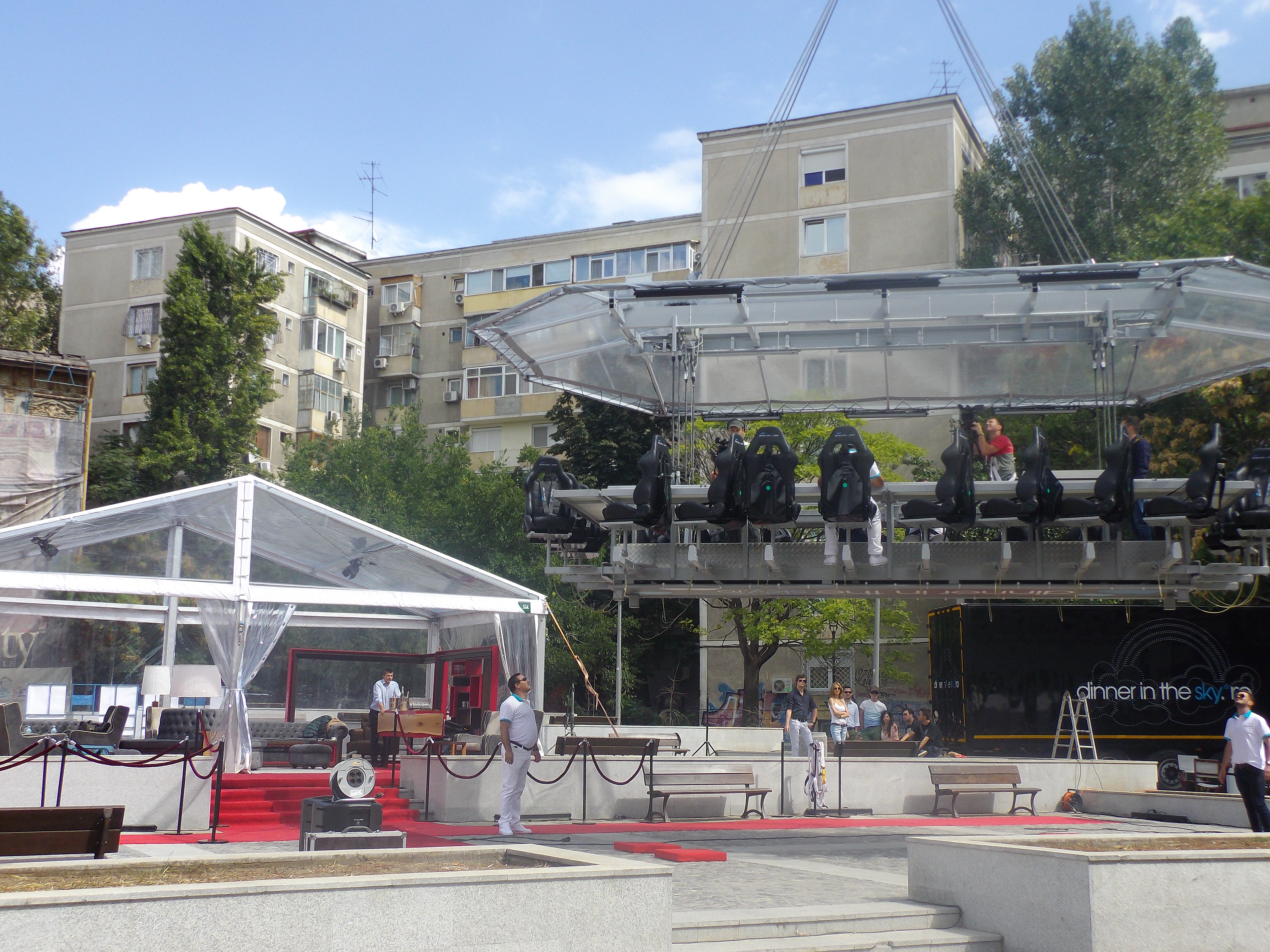 PREŢURI: Breakfast in The Sky – 299 lei / pers (25 de minute), Lunch in the sky – 599 lei / pers (60 minute), Champagne in The Sky – 299 lei / pers (25 minute), Dinner in the Sky – 799 lei (60 minute).