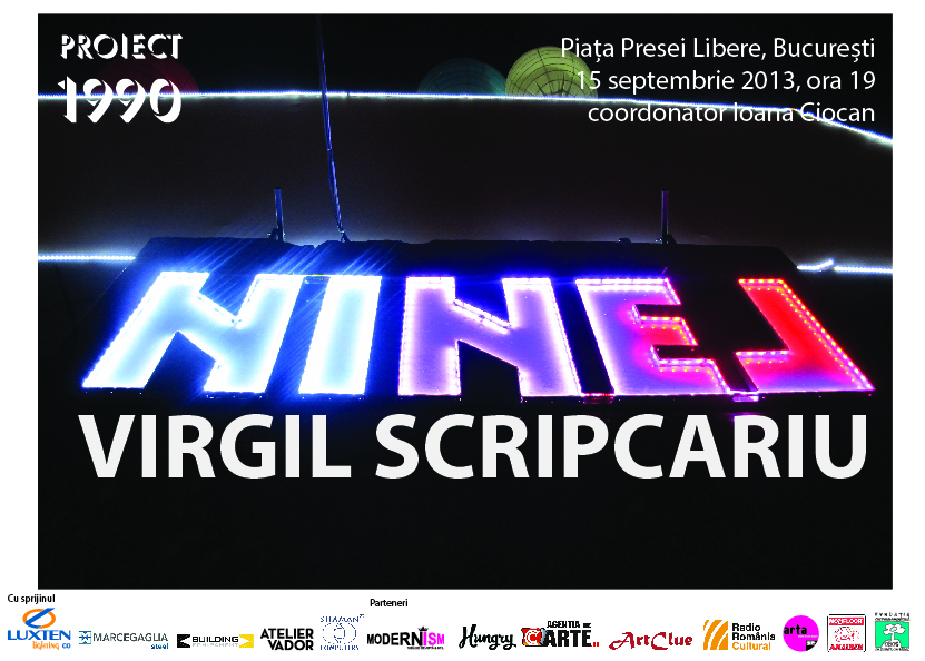 Pentru Proiect 1990 Virgil Scripcariu a creat Ninel, o lucrare-satiră ce ilustrează un binecunoscut fenomen social postcomunist. Vă invităm marți 15 septembrie 2013 la ora 19, în Piața Presei Libere din București, la vernisaj. Virgil Scripcariu (n. 1974), a terminat Universitatea Naţională de Arte din Bucureşti la clasa profesorului Vasile Gorduz. O selecție a expozițiilor sale: Romanian Design Week, București (2013), Centrul Cultural Palatele Brâncovenești (2012), Expoziția Internațională de Design, Holon, Israel (2012), Atelier 030202, București (2012), Muzeul Național de Artă Contemporană (2010). Trăiește și lucrează în satul Piscu din Județul Ilfov.