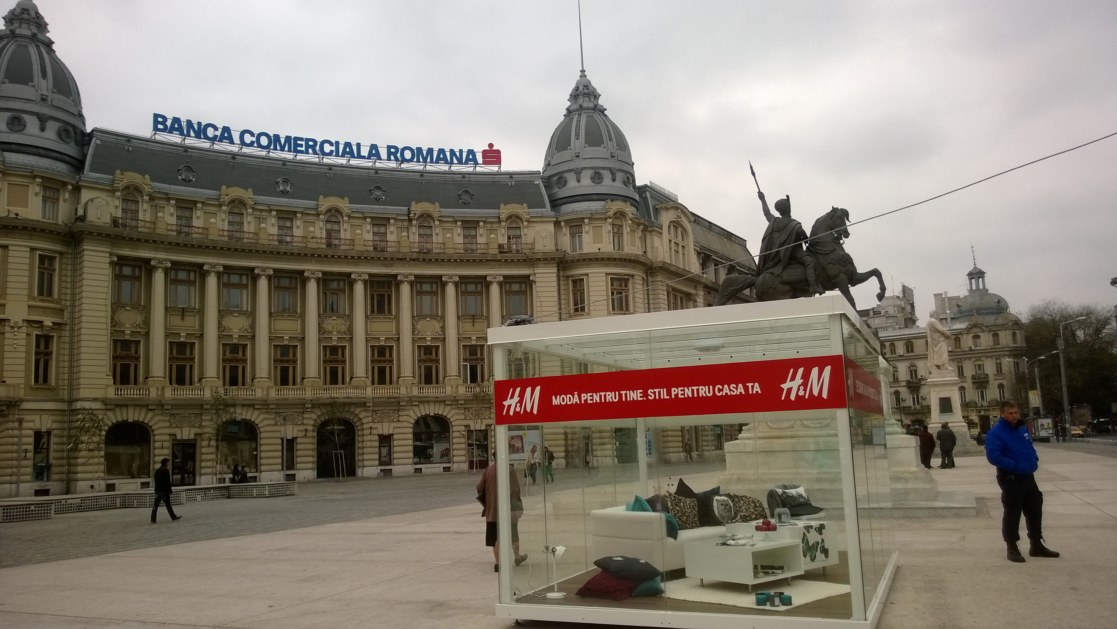 INSIDER: „Special pentru oamenii străzii, H&M pune la dispoziţie două camere proaspăt renovate şi modern mobilate chiar vizavi de Universitate. Gratis! …Adică este gratis să te uiţi şi să visezi că te tolăneşti pe canapeaua albă cu pisici şi fluturi, acoperit cu o „piele de leopard”, în timp ce admiri pereţii cu plasme care rulează imagini live din Piaţa Universităţii. …Apoi îţi tragi gluga pe cap şi te duci către canalele de la Obor!”