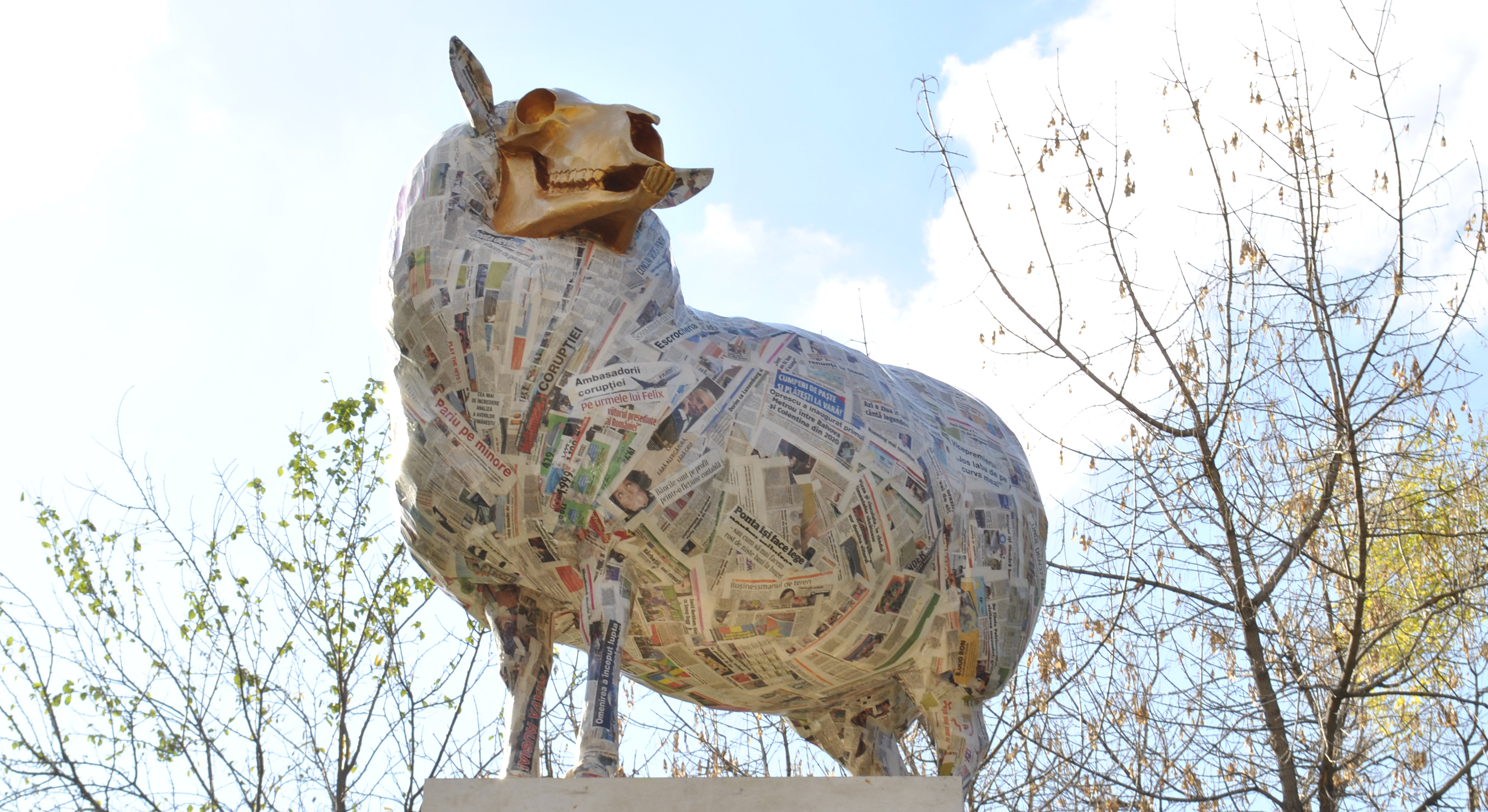 SPAM 5 Costin Ionita Miorita Costin Ionita la SPAMSoclul SPAM, situat lângă Arenele Romane din Parcul Carol I din Bucureşti, găzduieşte ultimul proiect, câştigător al concursului SPAM Copy/Paste, intitulat Mioriţa, autor Costin Ioniţă. Simbol naţional, ca şi versul ţara noastră aur poartă, noi cerşim din poartă-n poartă, Mioriţa lui Costin Ioniţă devine, pentru SPAM, imaginea avuţiei într-o Românie bogato-săracă. Capul de aur al Mioriţei, descarnat, este reprezentarea bogăţiei-blestem, în opoziţie aflându-se corpul voluminos al oii cu lână bogată. Presa, arma perfectă de manipulare în mâinile celor puternici, modifică informaţiile spre folosul diverselor interese, poleind, din când în când, adevărul, în aur. DETALII