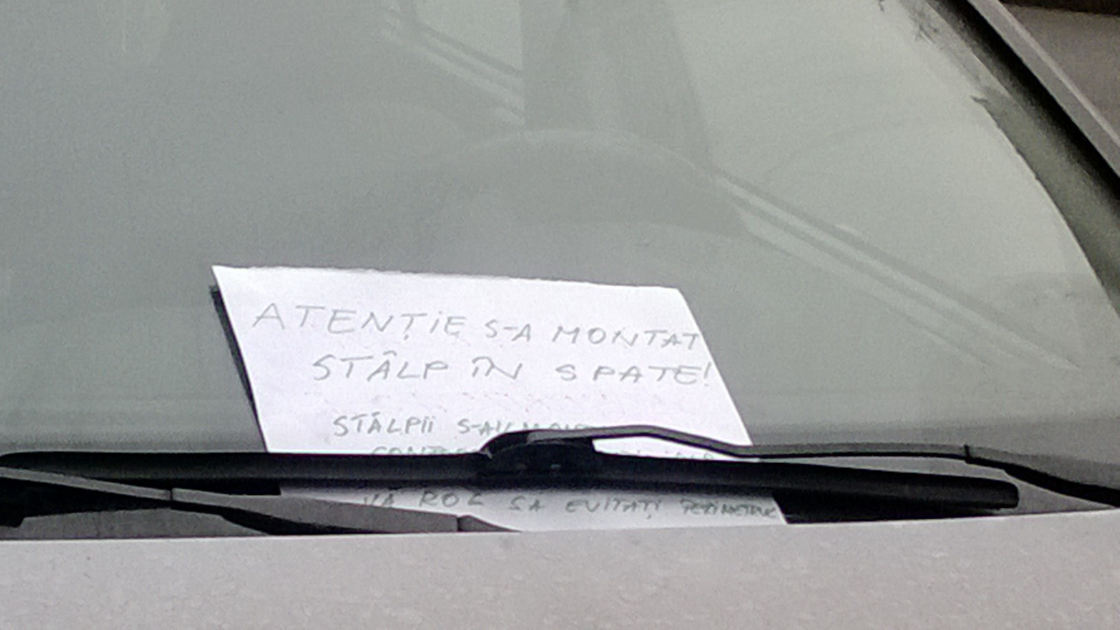 INSIDER: „Dacă aţi parcat maşina pe bd. I.C. Brătianu din Bucureşti, în faţa magazinului de obiecte religioase, la întoarcere vă aşteaptă o surpriză în spate şi un bilet în parbriz. S-au montat stâlpi tocmai pentru a evita parcarea acolo, împreună cu sfatul de a evita perimetrul. Rămâne să vedem cine e mai tare – maşina sau stâlpul!?”
