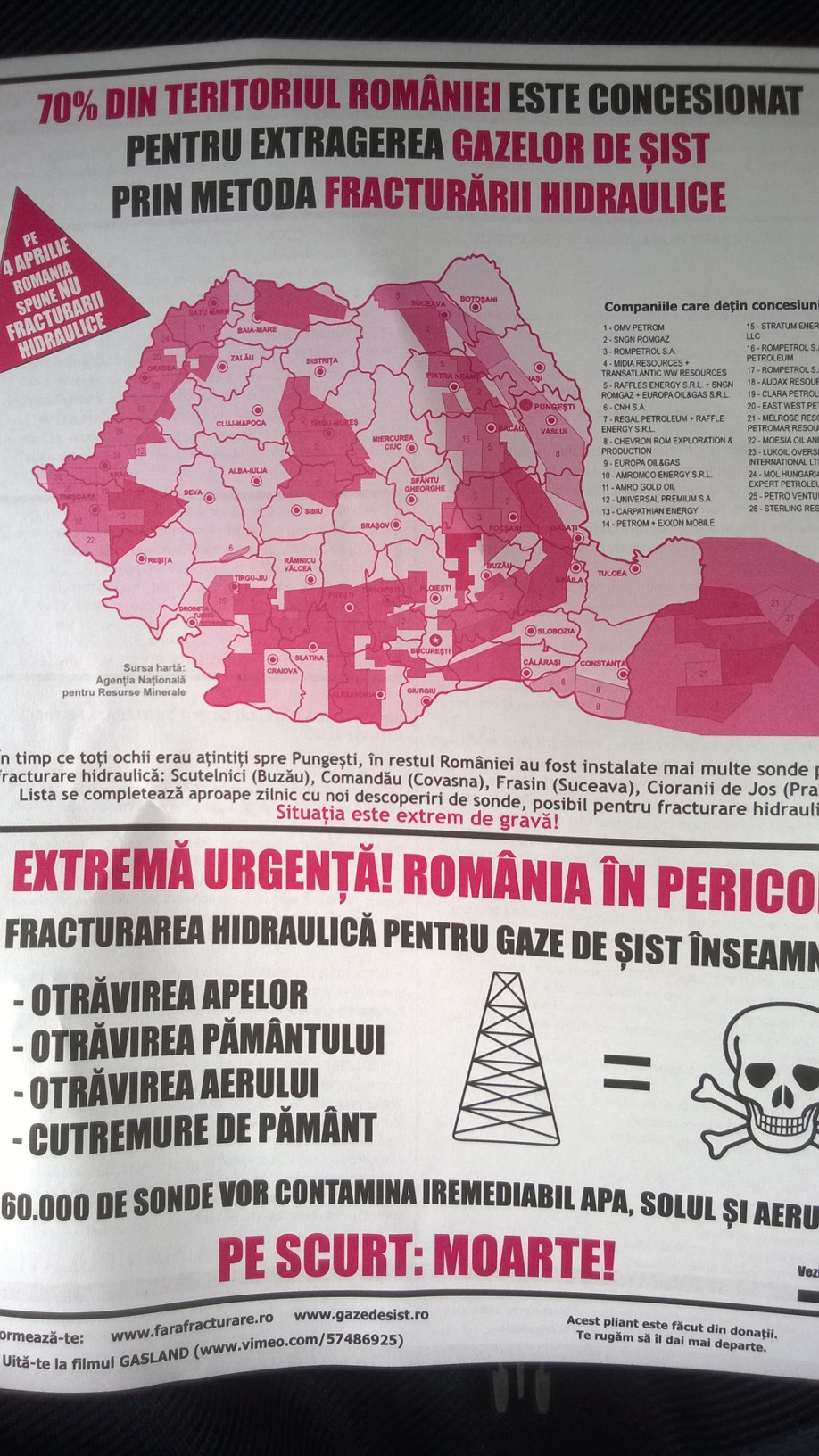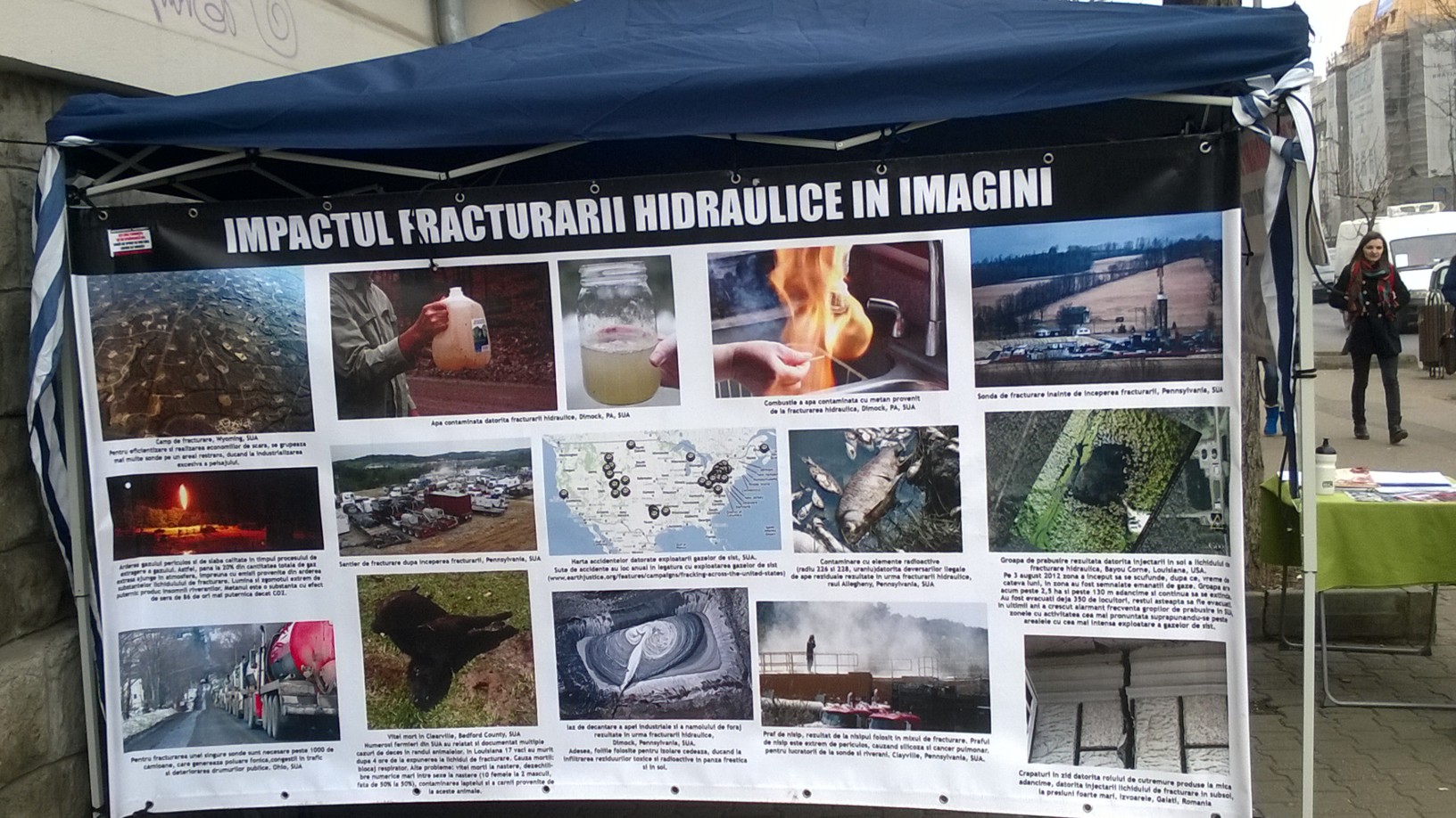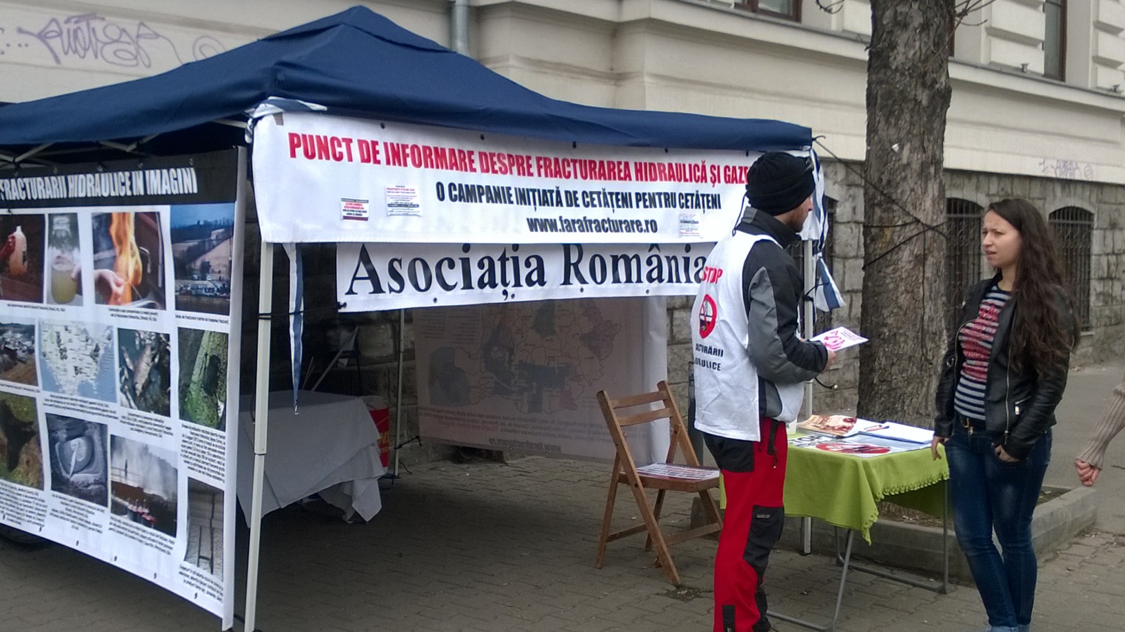 info-cort unde câţiva voluntari care împart fluturaşi pe tema gazelor de şist şi impactul fracturării hidraulice. Din păcate, trecatorii sunt grabiţi şi neinteresaţi. Marea majoritate nici nu ridică ochii către tinerii care doresc să deschidă ochii românilor, nici nu iau flyer-ul sau dacă îl iau, îl aruncă cinci metri mai încolo. Suntem prea preocupaţi de pâinea pe care o punem pe masă astăzi ca să ne mai gândim la apa pe care o vom bea mâine?!”