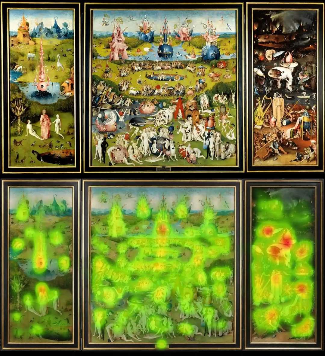 Muzeul Prado din Madrid – unde se află expusă pictura lui Bosch – a organizat un studiu ingenios: i-a rugat pe vizitatori să privească tabloul purtând niște ochelari care le urmărea mișcarea ochilor. Astfel, cercetătorii au putut reproduce harta privirii artistice și să descopere unde anume se uită vizitatorii când observă tabloul. Datele vizuale arată că ochii le sunt atrași de iad: privirea oamenilor rămâne îndelung fixată asupra peisajului infernal al caznelor și torturii. Idilicul tablou al paradisului abia dacă e băgat în seamă. Grădina Edenului – în istorie ca și în pictura lui Bosch – este doar placa turnantă către infern.