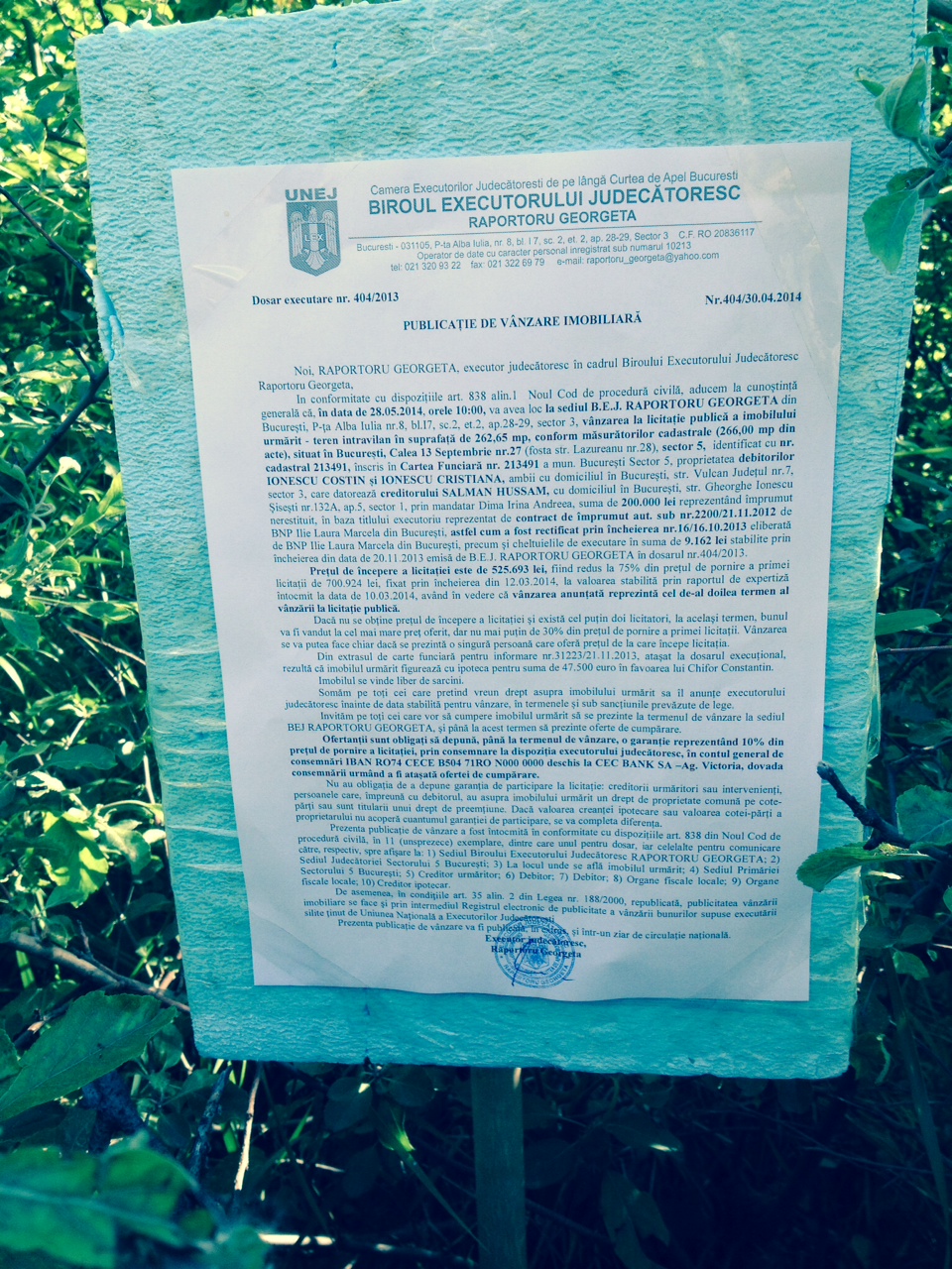INSIDER: „Într-un boschet pe Calea 13 Septembrie, vizavi de Casa Poporului, în curtea Academiei Române, un executor zelos a „publicat” anunţul de licitaţie publică pentru vânzarea unui teren de 260 mp cu preţul de pornire de la 525.000 lei, fiind redus la 75%, după ce la primul termen nu s-a prezentat niciun parlamentar… Dar dacă pe 28.05.2014 se prezintă „doi academicieni deştepţi”, unul dintre ei va putea să cumpere terenul cu o reducere de 70%, adică undeva pe la 50.000 de euro. …Ce să faci, domne’, nu mai are lumea bani!”