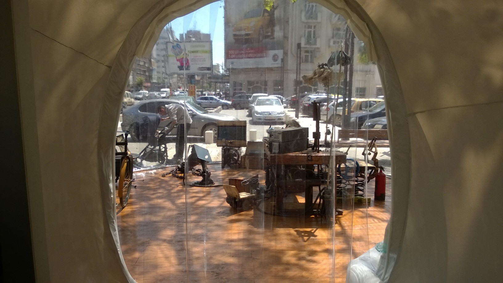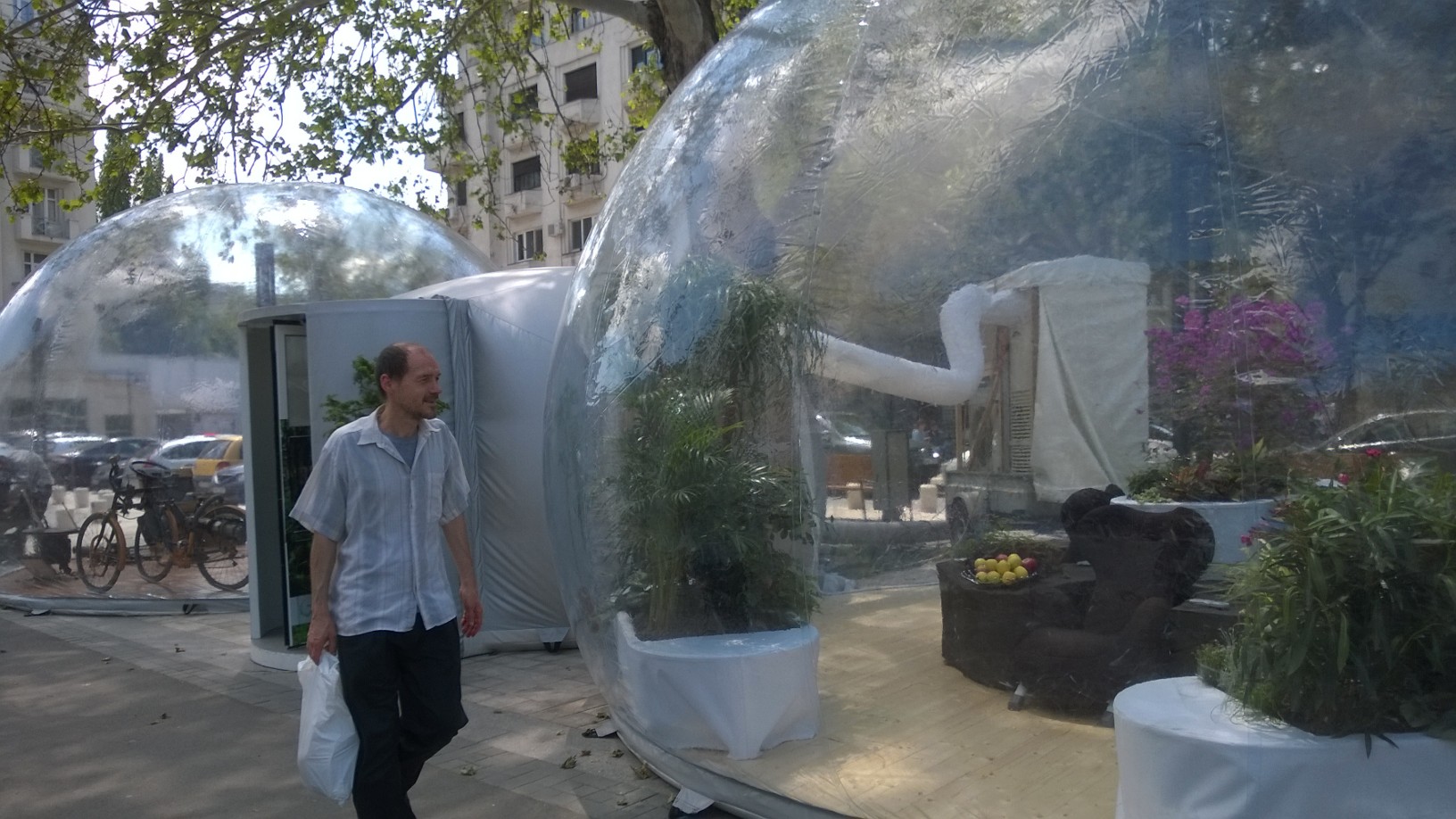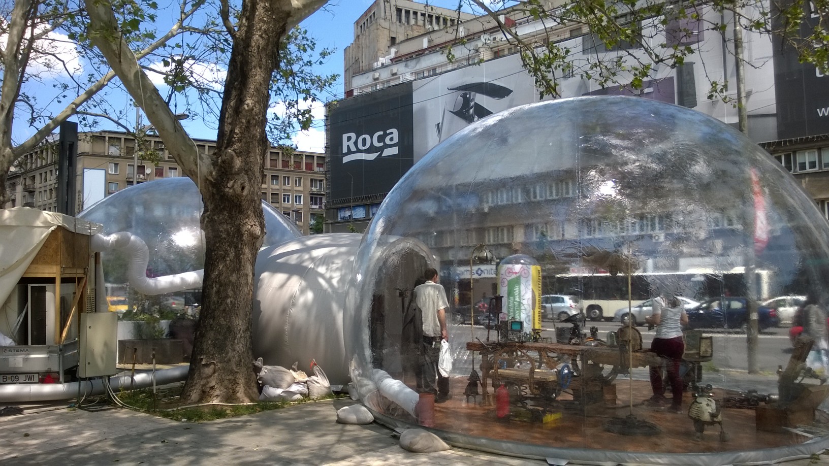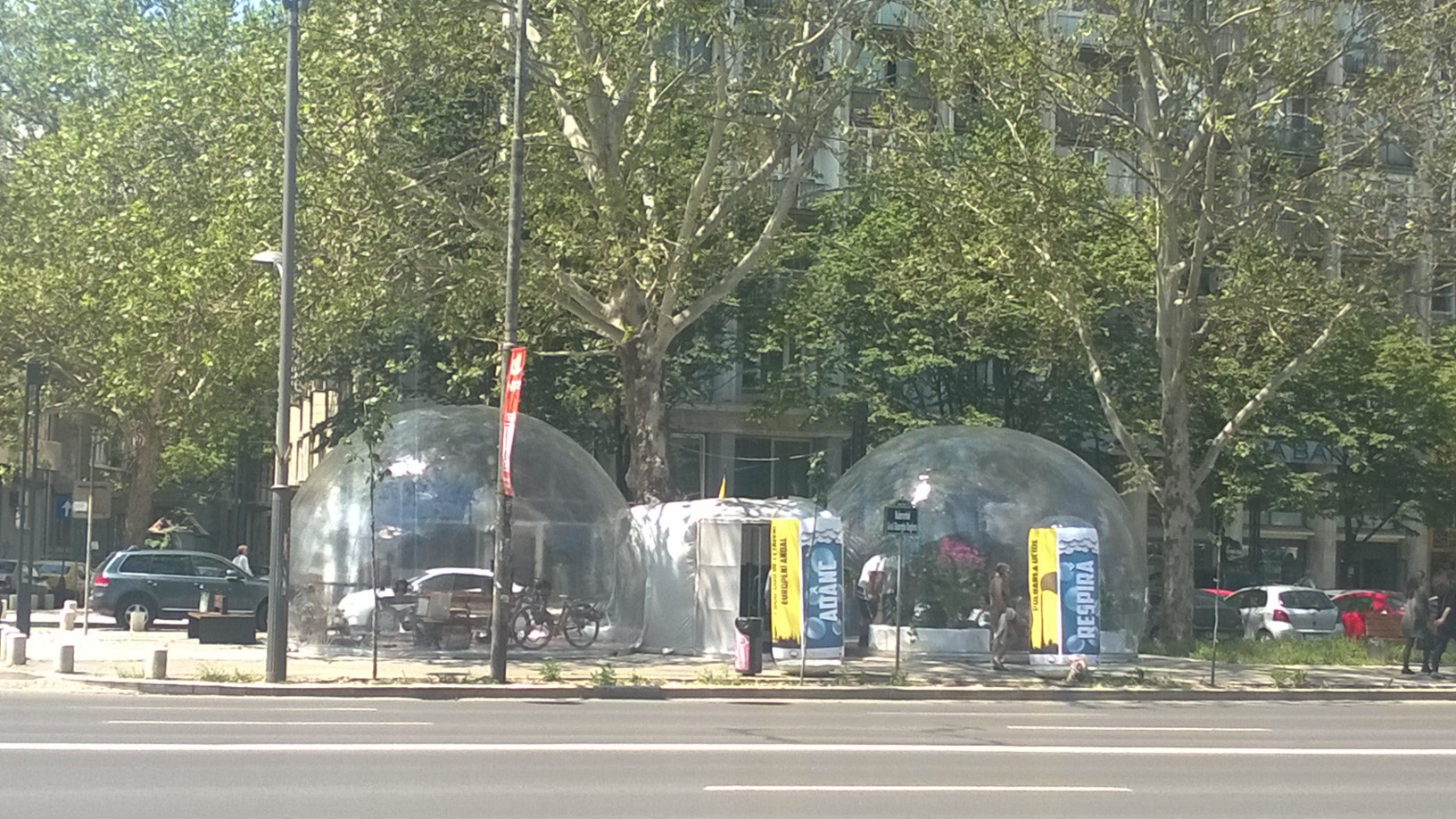 Pe flyerul primit la intrare suntem sfătuiţi să folosim trenul şi autobuzul în defavoarea maşinii, mare producătoare de CO2, ceea ce mi se pare oarecum amuzant, dat fiind faptul că vizitatorii bulelor nu sunt chiar şoferii din coloana de maşini care ocupă 80% din bulevard, timp de 24 de ore pe zi. După locaţia din Magheru, conştientizarea se muta în Parcul Herăstrău până pe 1 septembrie. Respiră adânc, dacă poţi!