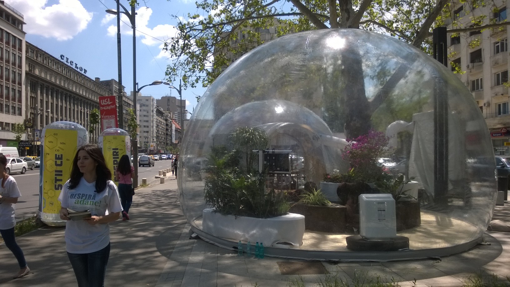 INSIDER: „În perioada 21-28 mai, pe Bd. Magheru, vizavi de cinema Patria, trecătorii pot lua o gură de aer curat. La pungă! „Respiră adânc” este un proiect de conştientizare a importanţei calităţii aerului. În două bule separate, găsim aer curat şi aer foarte poluat.