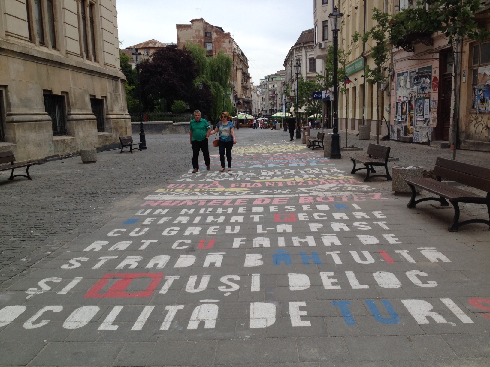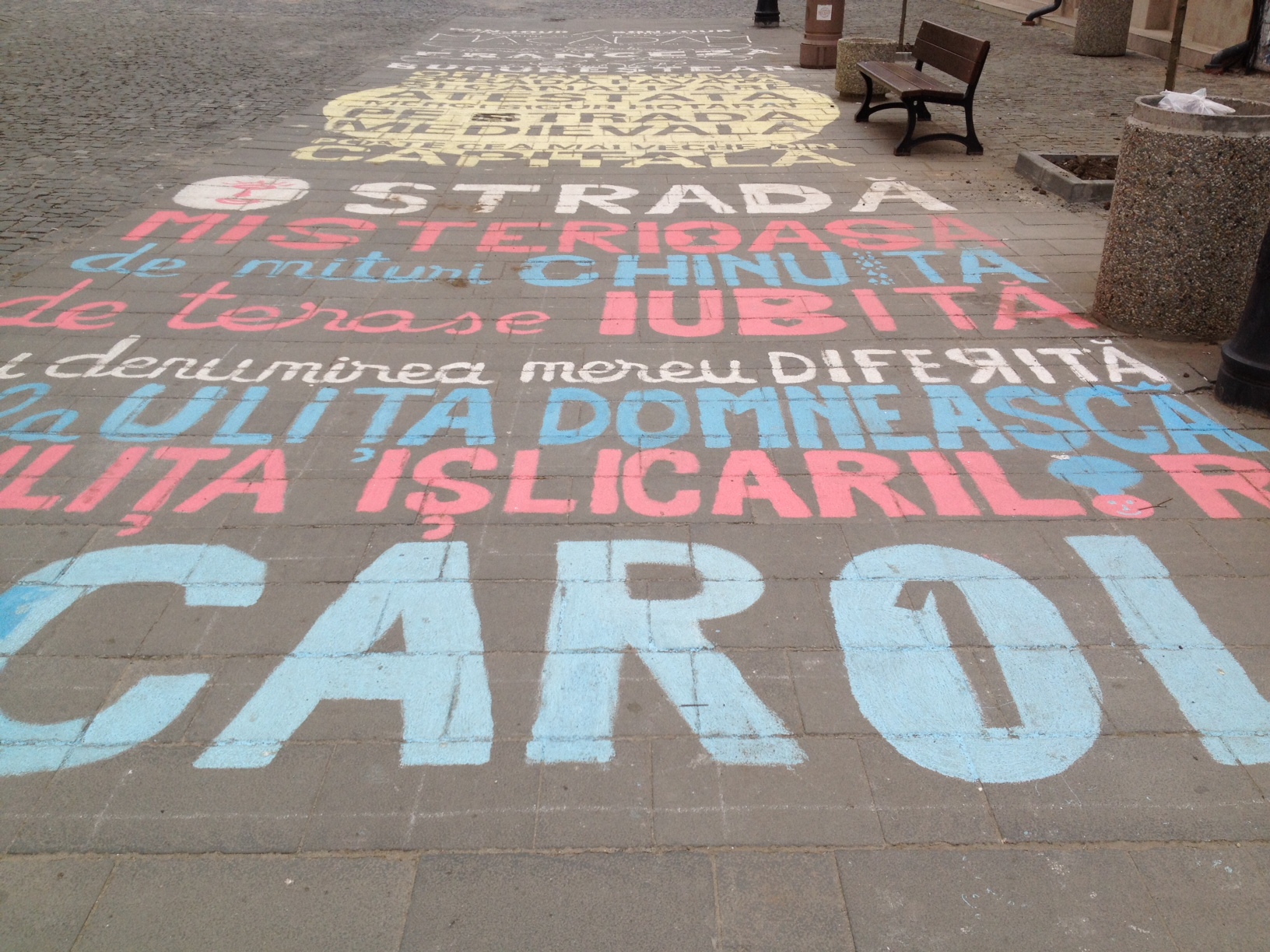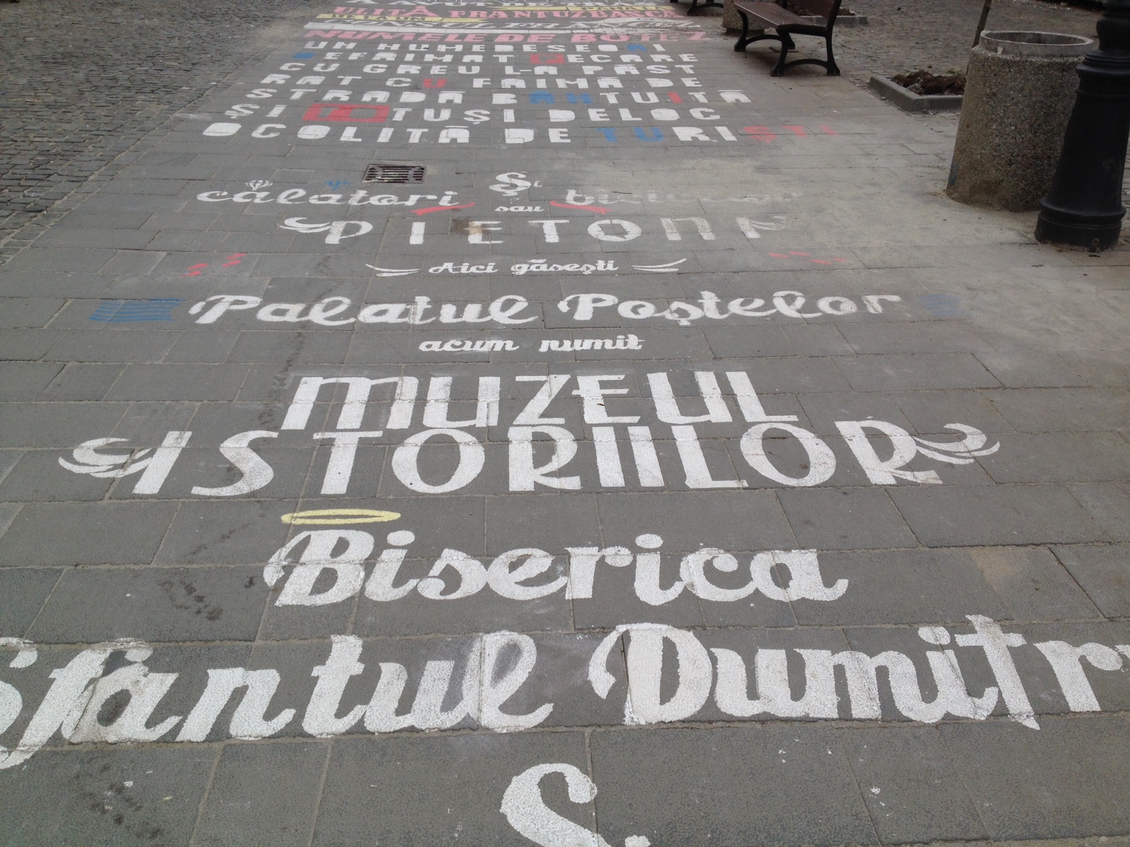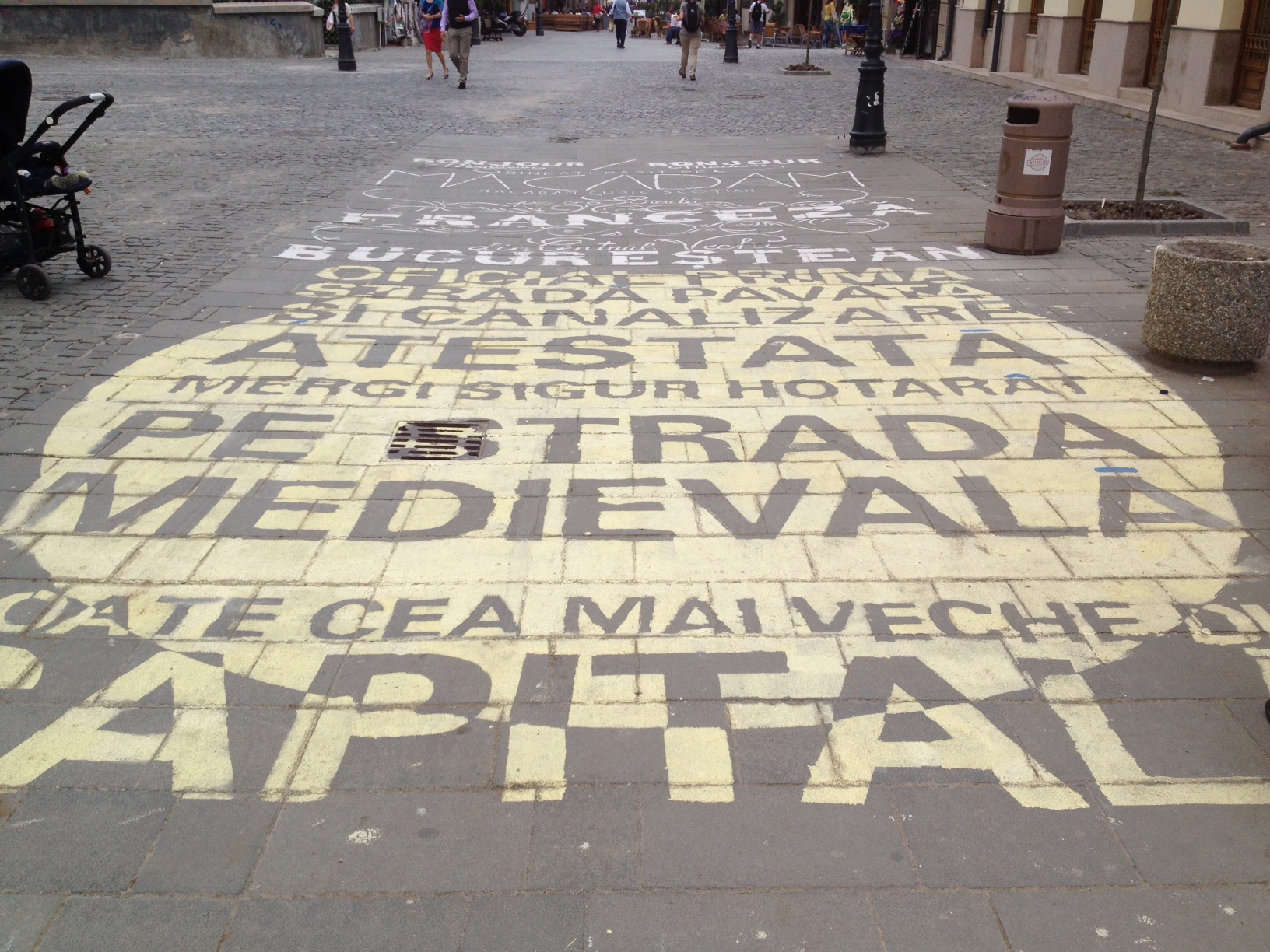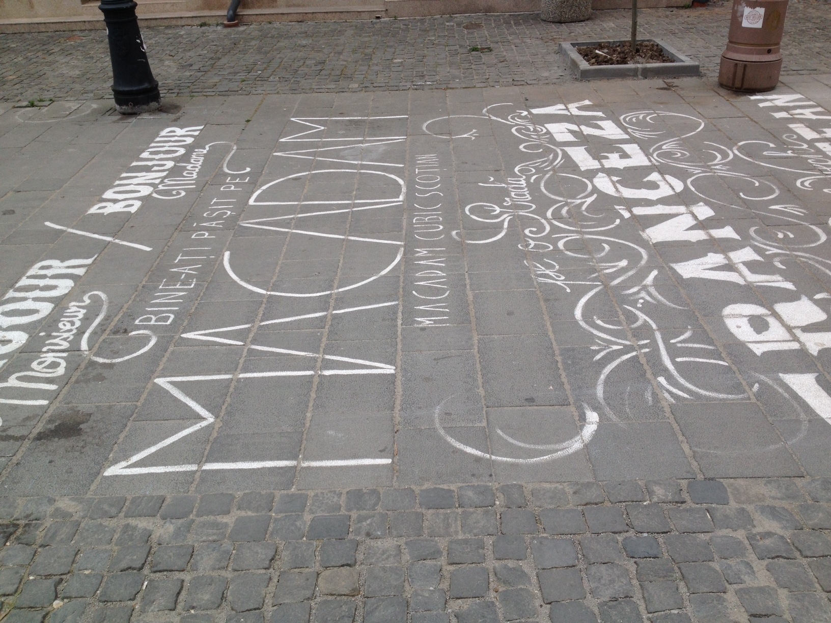 „Bonjour / Bonjour. Bine-aţi pășit pe / MACADAM / Macadam cubic scoţian / Pe o stradă franceză / Din Centrul Vechi / BUCUREȘTEAN. Oficial prima stradă pavată și canalizată atestată. Mergi sigur și hotărat pe strada medievală poate cea mai veche din Capitală.