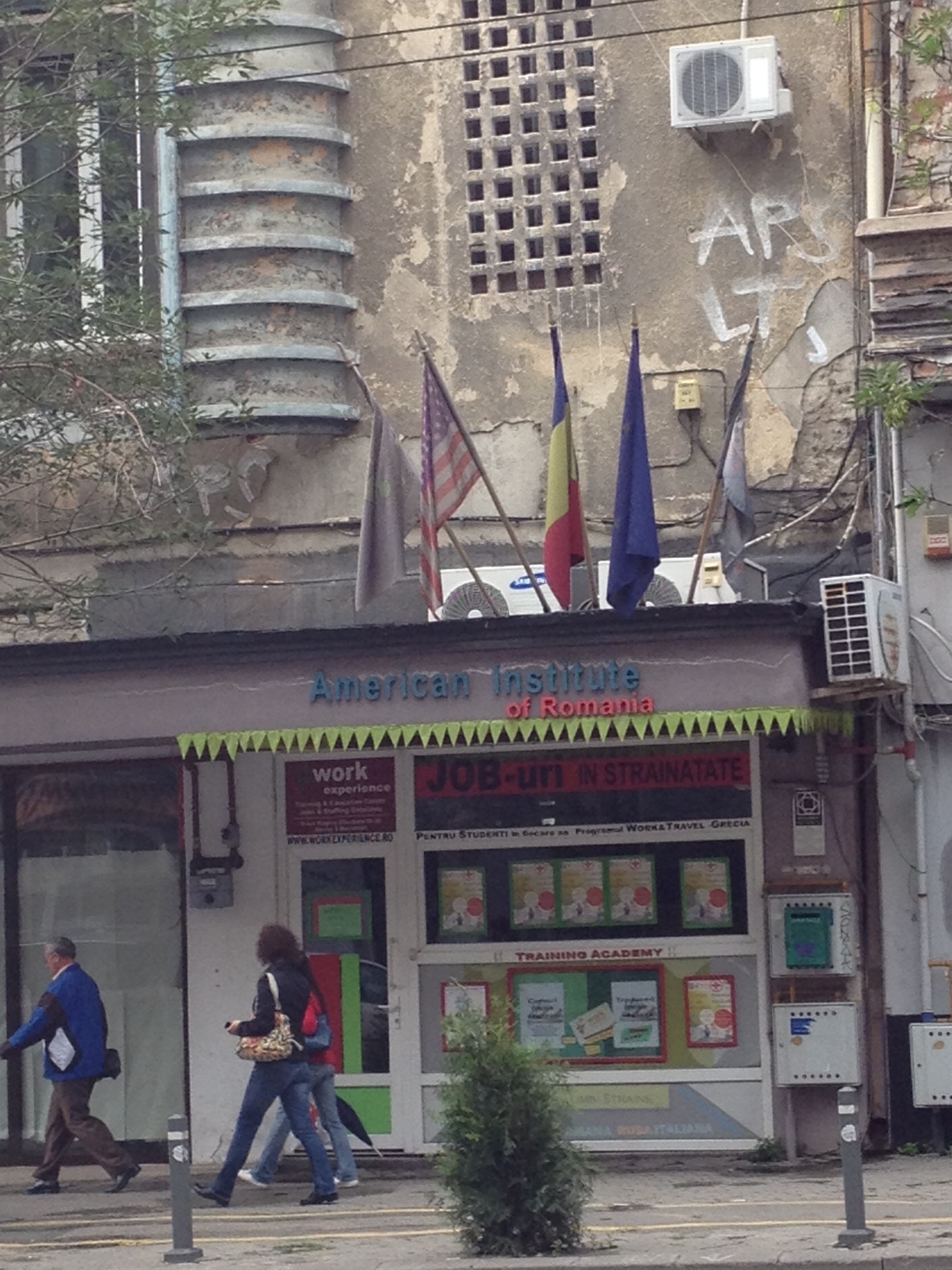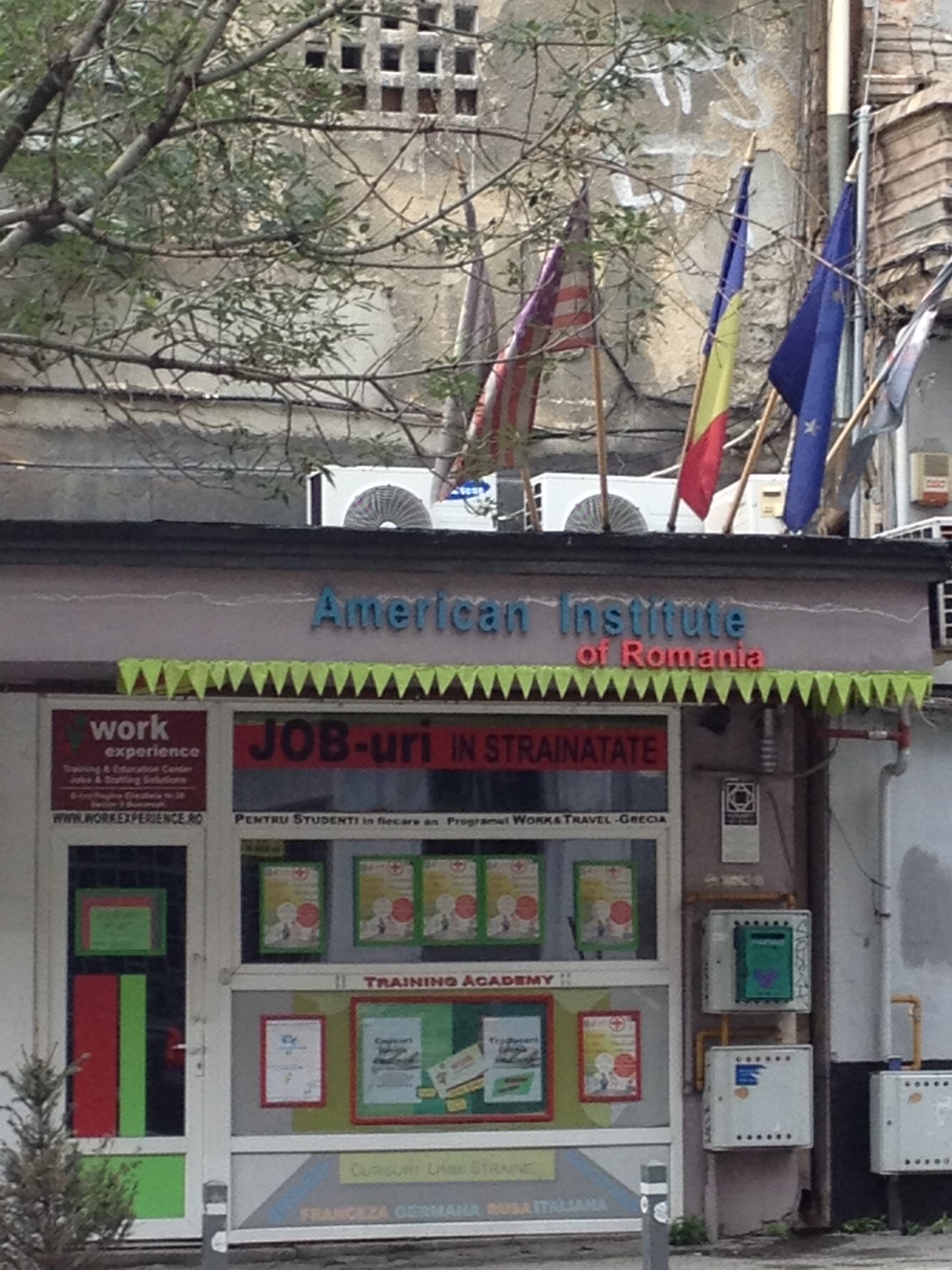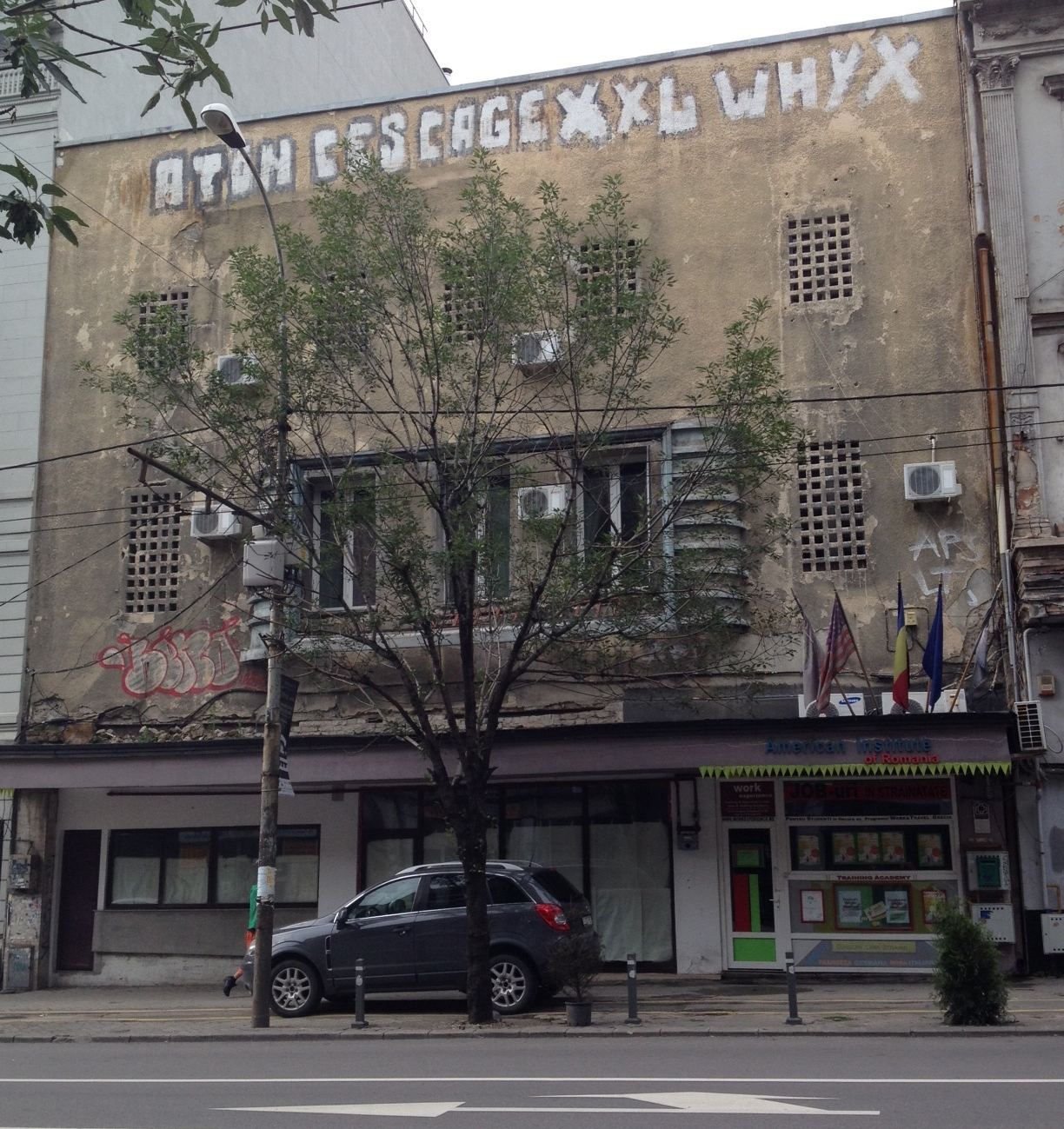 INSIDER: “American Institute of Romania de pe bd. Elisabeta are cinci steaguri – steagul României şi UE mai noi, plus steagul SUA cam nespălat şi încă două mai vechi indescifrabile, ca nişte cârpe de şters pe jos… Pe clădire, grafferii Ces şi Aton au pictat un mesaj misterios: „CAGE XXL. WHY X”, probabil un fel de lozincă gen „Libertate pentru Nuţu!”. …Pălărie într-un picior ghici ciupercă ce e? Job-uri în străinătate!”