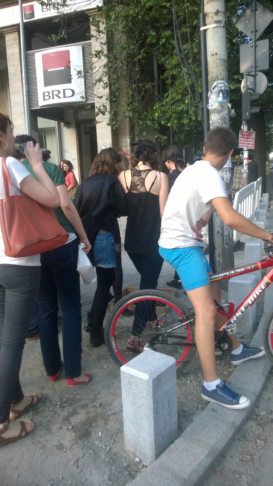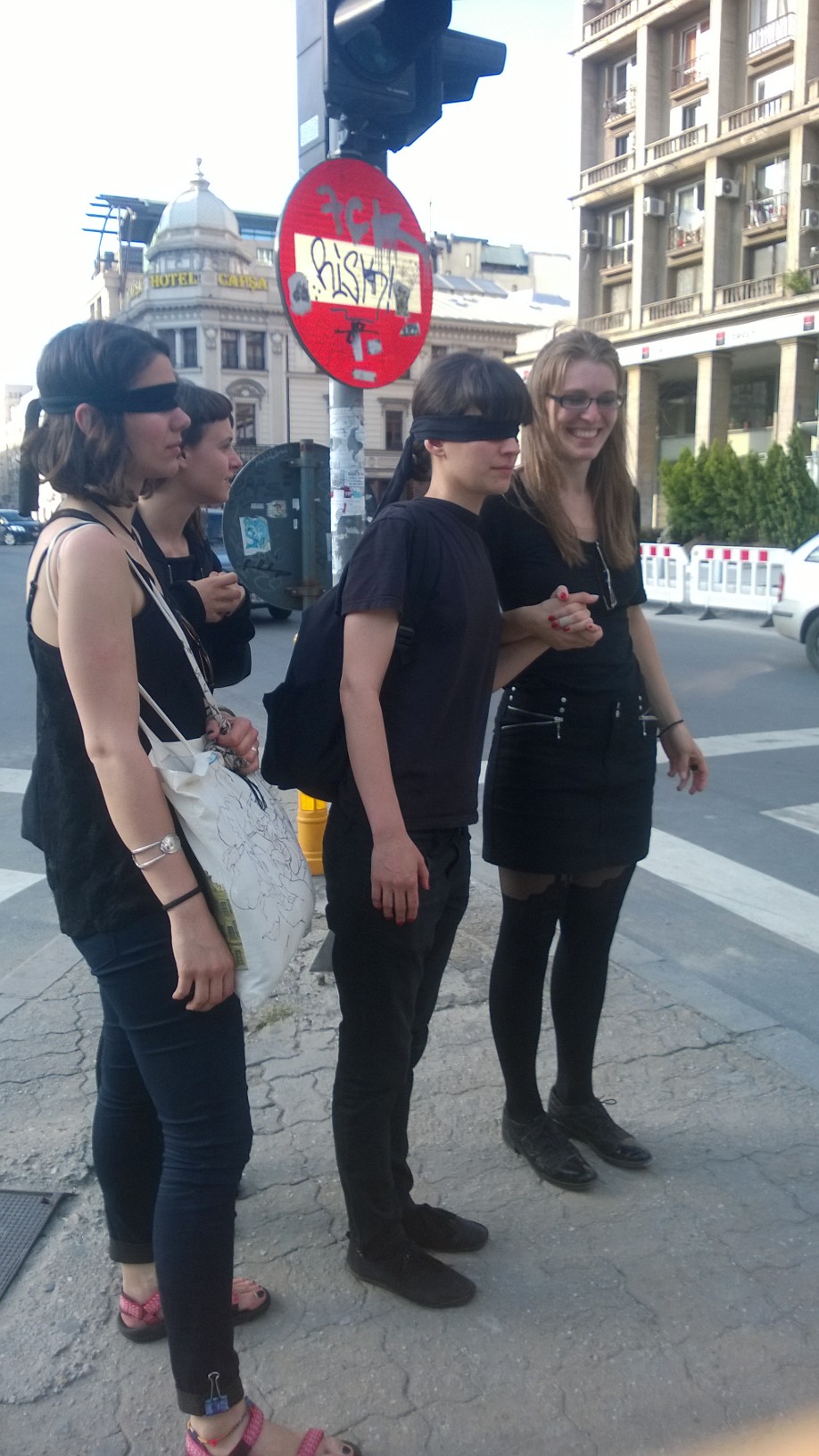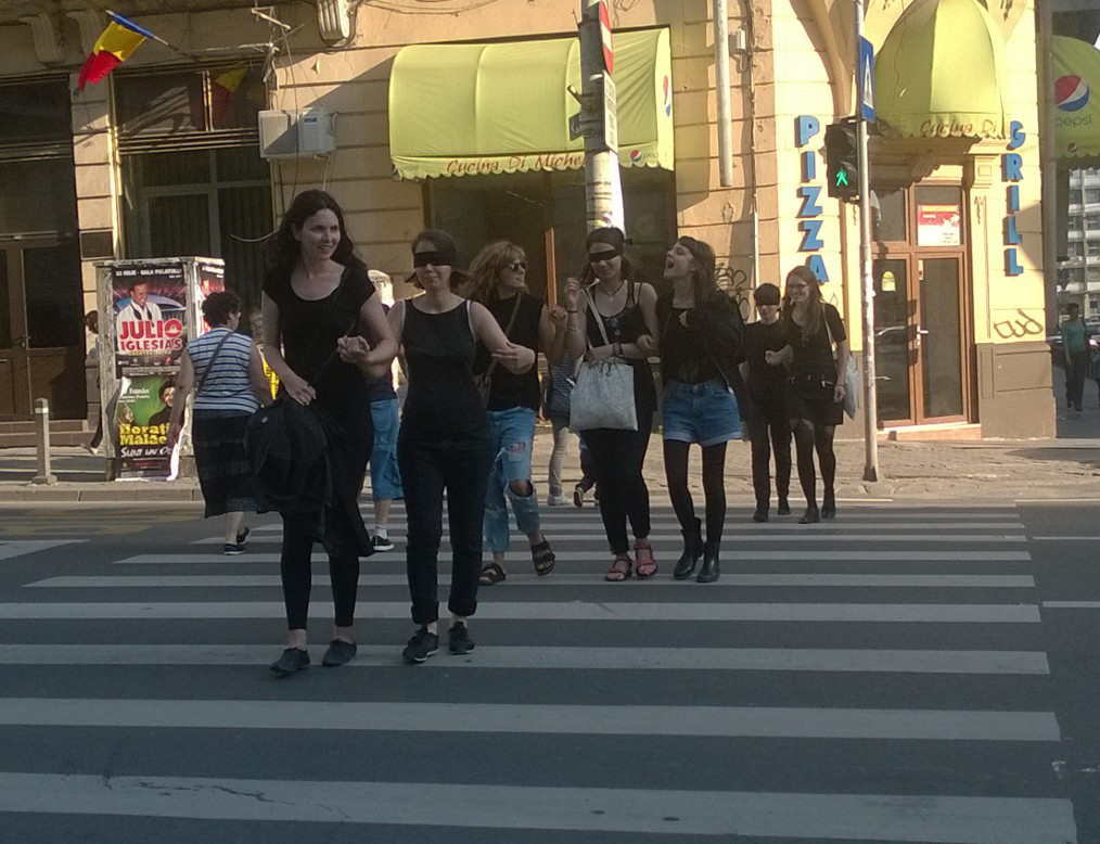 INSIDER: „Şapte studente la UNArte au făcut, ieri, un experiment pe Bd. Elisabeta din Bucureşti. Îmbracate în negru, trei dintre ele conduceau pe trotuarul accidentat alte trei colege legate la ochi cu o bandă neagră, iar a şaptea făcea poze.