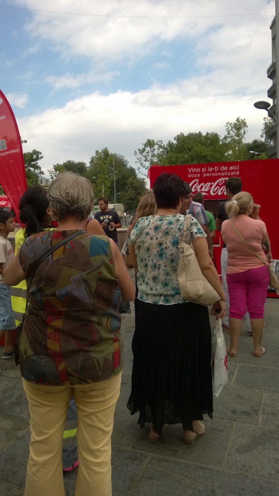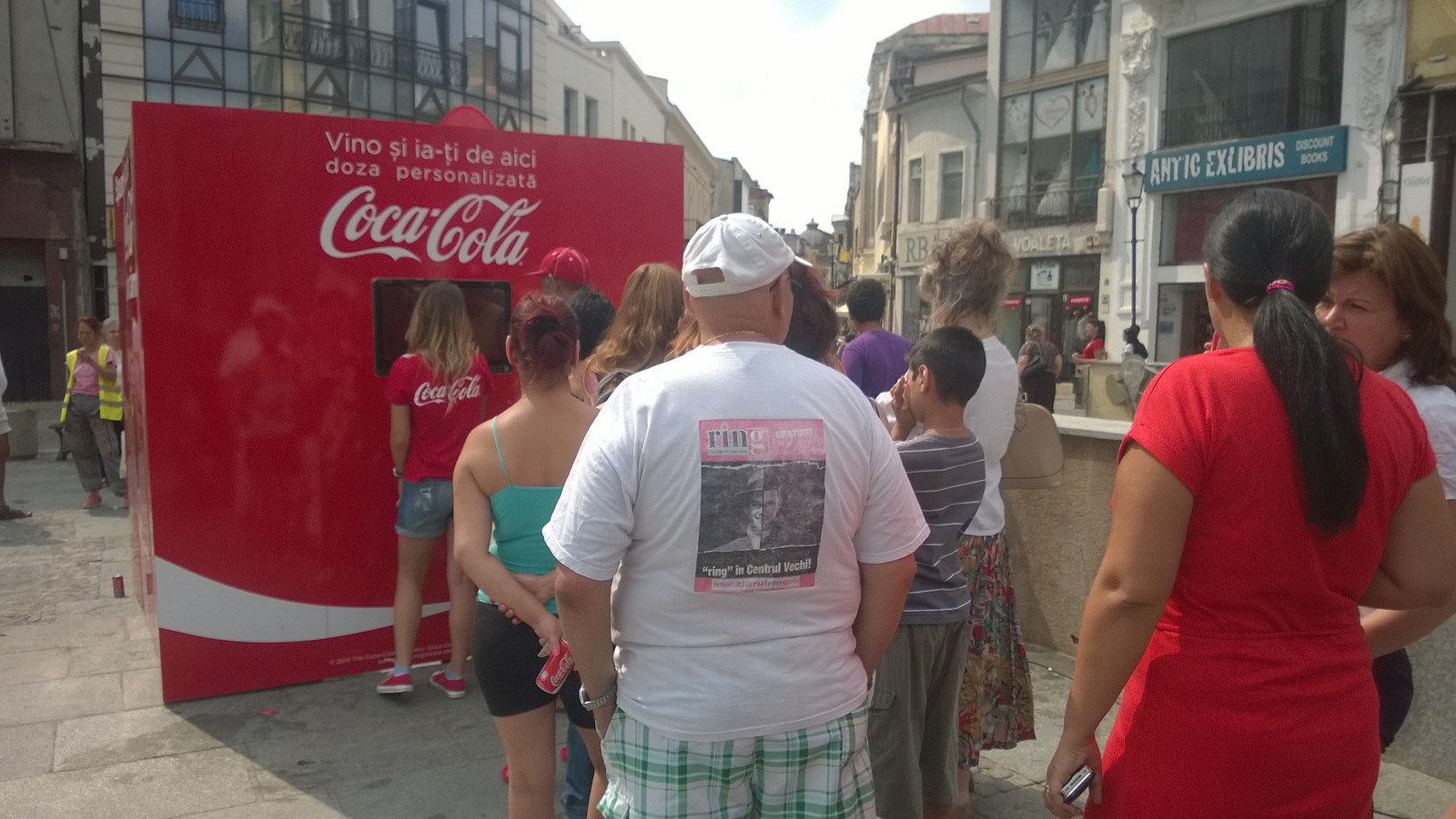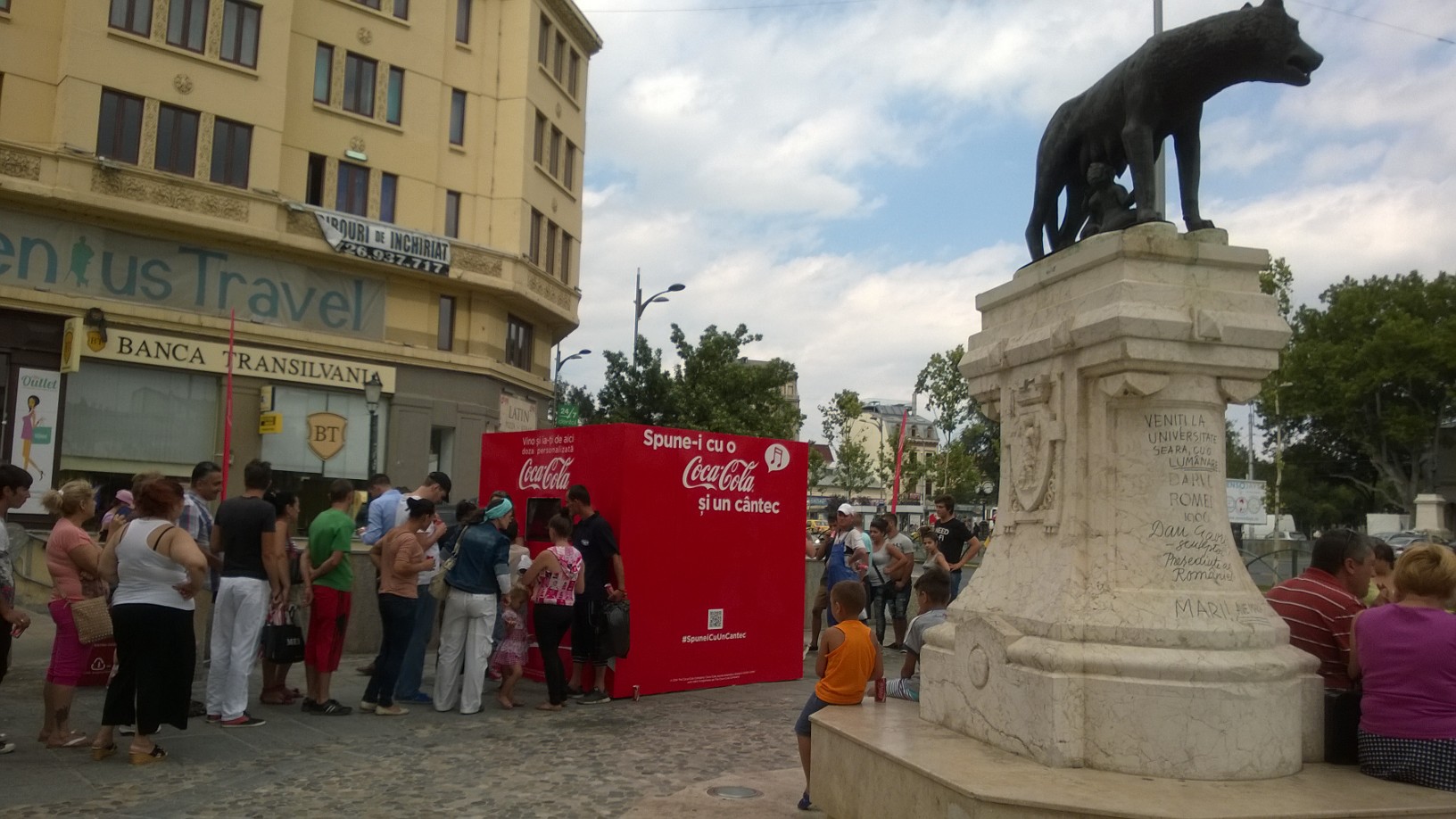 magazinului Bucureşti, cei de la Coca-Cola au organizat un eveniment de „responsabilitate socială” prin distribuirea şi personalizarea gratuită a dozelor de răcoritoare. Singura problemă era că trebuia să stăi la coada imensă de sub coada lui „Lupa Capitolina”. Iar unde este o coadă apare şi o raţie – doar una de persoană ca să ajungă la toată lumea! Dacă Romulus şi Remus au băut lapte de lupoaică şi au întemeiat Roma, rămâne să vedem ce vor face urmaşii lor din Dacia îmbătaţi astăzi cu Coca-Cola de la Unchiul Sam!”