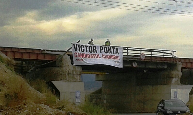 COMUNICAT: „12 septembrie 2014, Alba Iulia – Un banner cu mesajul ”Victor Ponta, candidatul cianurii” a fost afişat de activiştii care se opun proiectelor miniere pe bază de cianuri cu ocazia lansării candidaturii premierului la Alba. Bannerul de mari dimensiuni a fost afişat în imediata apropiere a reuniunii la care participă numeroşi membri de partid din toată ţara. Victor Ponta, primul ministru al României, se află la un complex turistic de la marginea oraşului Alba Iulia care găzduieşte Congresul Naţional al PSD pentru validarea candidaturii acestuia la alegerile prezidenţiale. (…) În România sunt planificate în prezent 13 proiecte de minerit cu cianuri. Şapte proiecte miniere ce au la bază suspecta asociere dintre Minvest şi Gabriel Resources din 1997: Roşia Montană, Bucium, Certej, Deva-Muncel, Băiţa Crăciuneşti, Brad şi Bolcana. Acestora li mai adaugă alte şase noi proiecte ce ar putea transforma comunităţile vizate în zone marcate de poluare accentuată, boli profesionale cronice şi de neputiinţa de a mai avea în viitorul previzibil dezvoltare prin agricultură sau turism.” SURSA