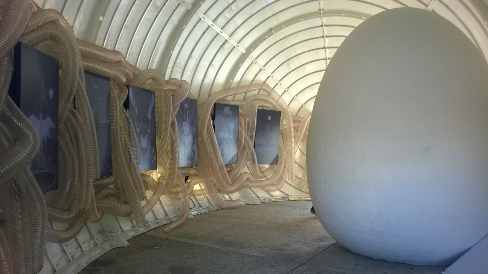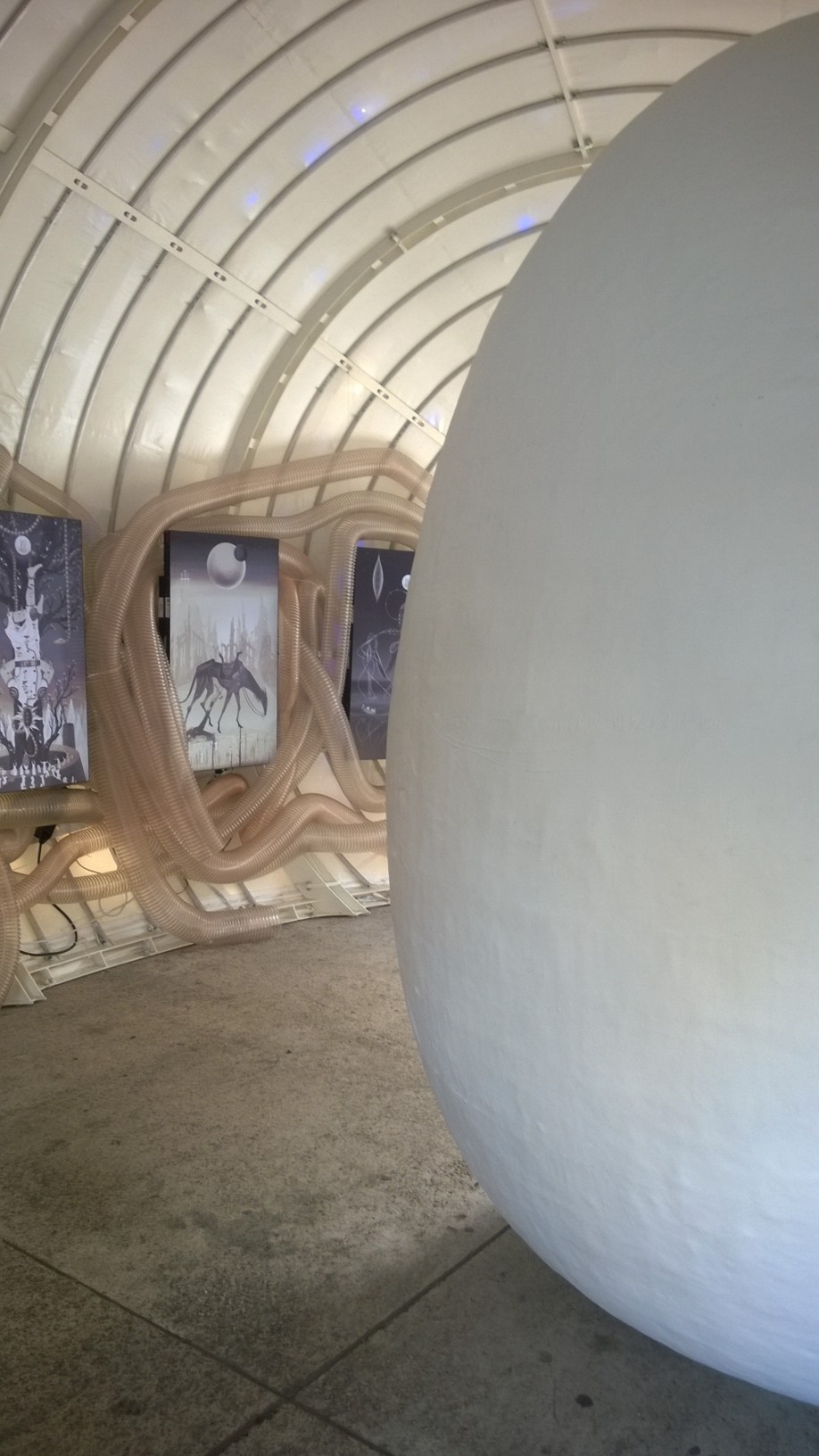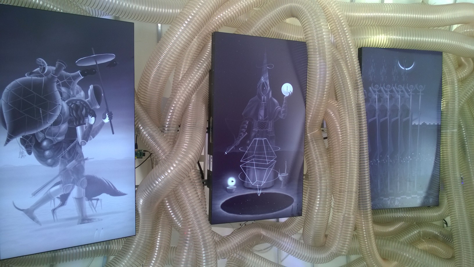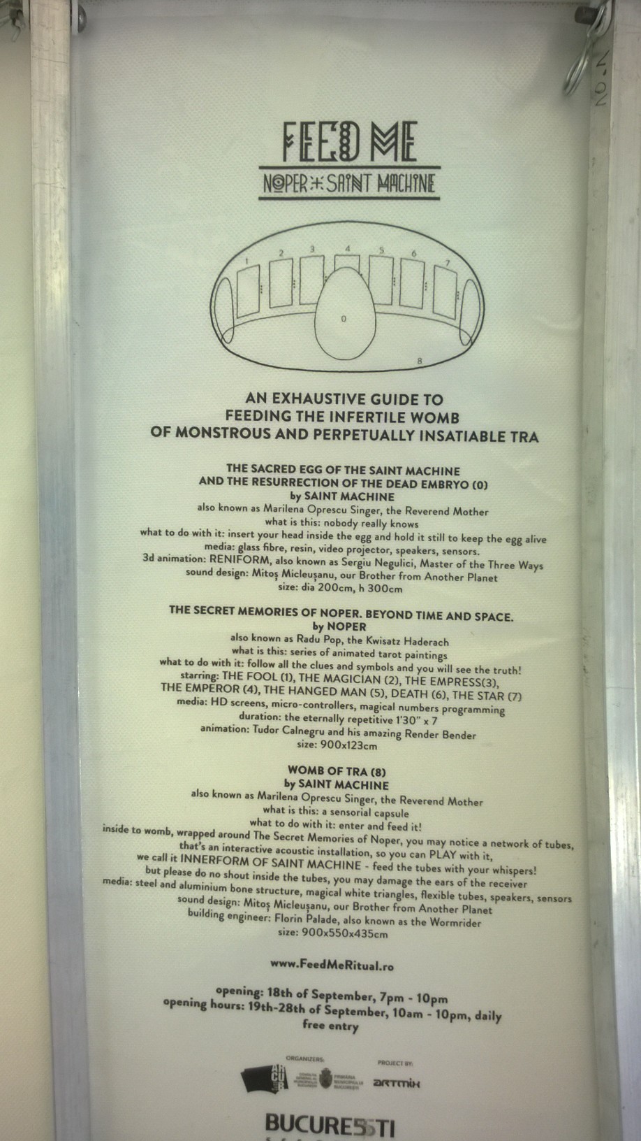 Întreaga expoziţie “Feed Me!” este conţinută de lucrarea artistei Marilena Oprescu Singer: o capsulă senzorială în forma unui uriaş cocon, denumit “Womb of Tra”, cu o înălţime de 5,5 metri şi o lungime de 9 metri, care îşi înghite vizitatorii şi se hrăneşte cu energia lor fizică pentru a exista. Odată înghiţiţi de pântecele “monstruoasei şi veşnic nesătulei “Tra”, vizitatorii sunt înconjuraţi de şapte picturi fermecate: “The Secret Memories of Noper”. Lucrarea artistului Radu Pop a.k.a. Noper, este o instalaţie video interactivă compusă din şapte animaţii high definition pe care publicul le poate controla prin atingerea cililor cu care este căptuşit la interior coconul “Womb of Tra”. DETALII
