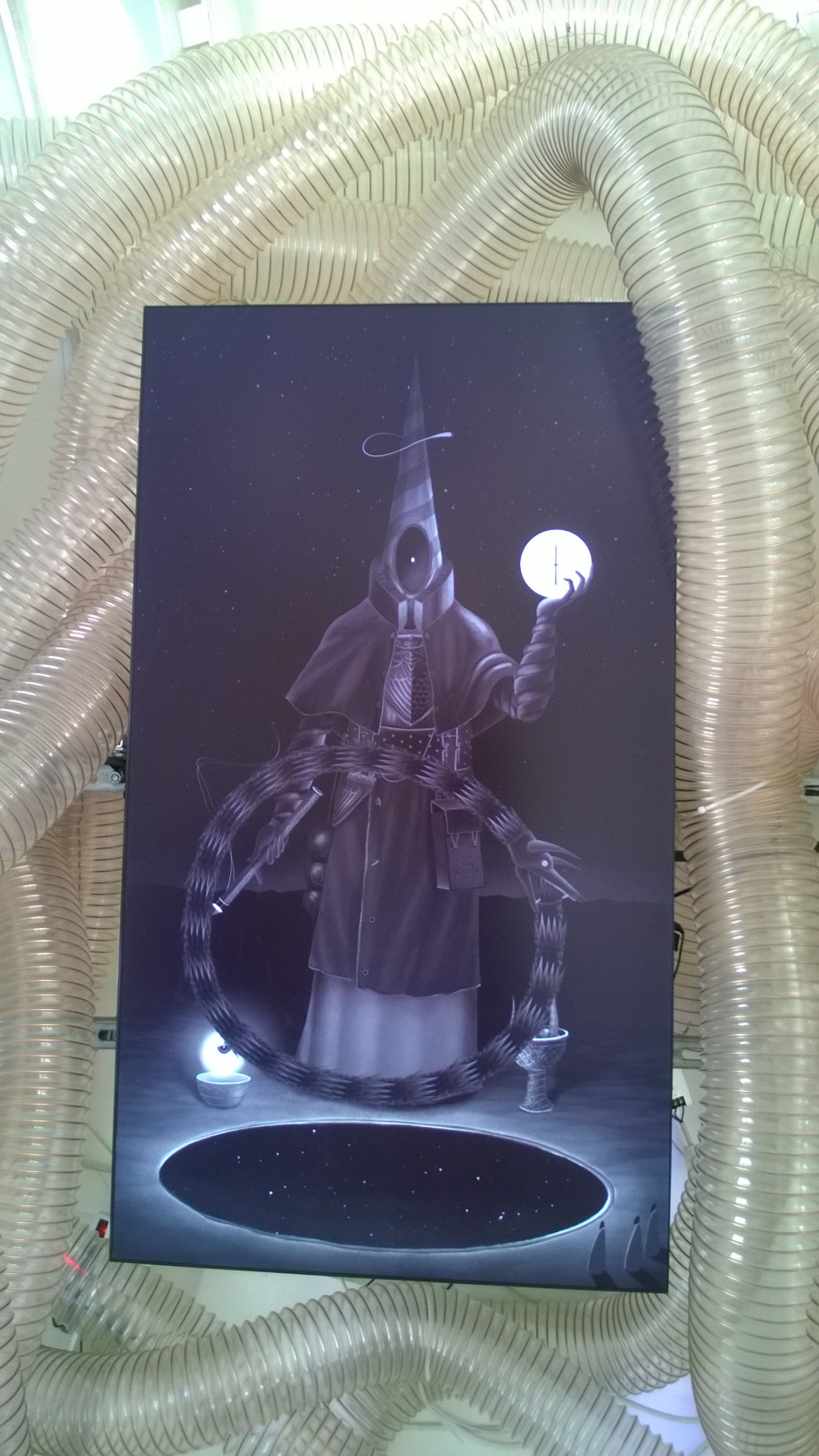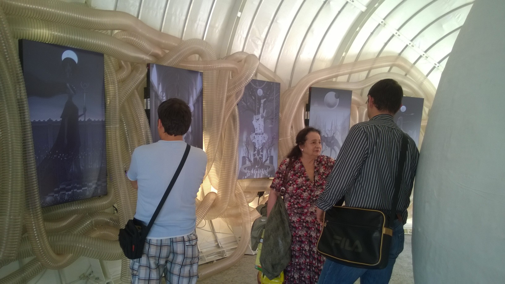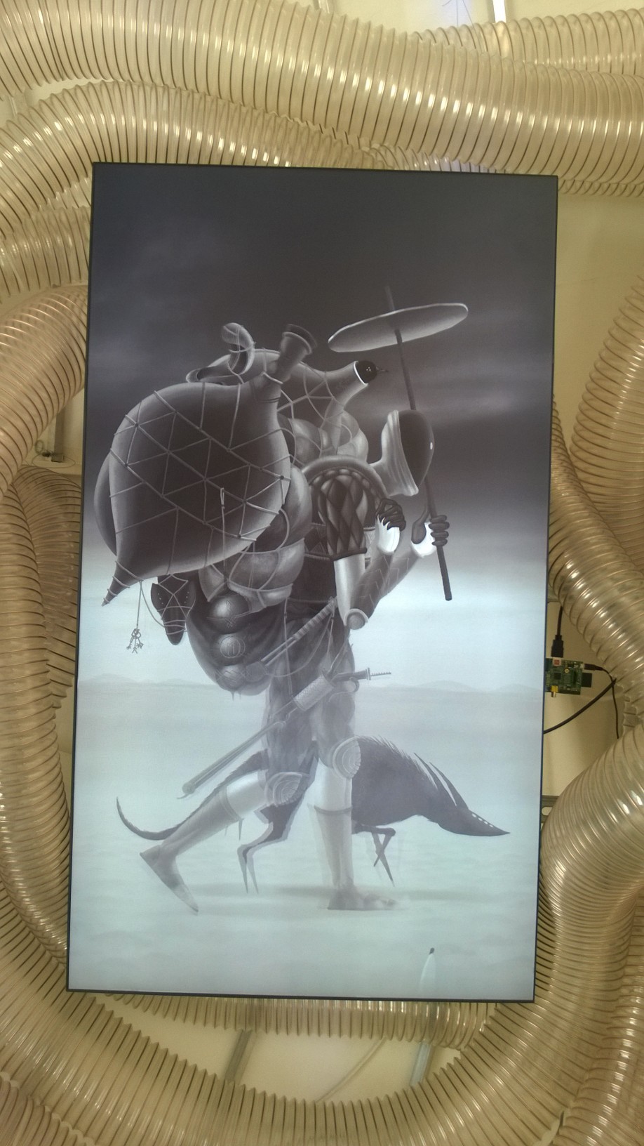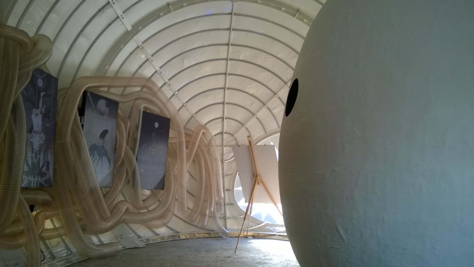 Întreaga expoziţie “Feed Me!” este conţinută de lucrarea artistei Marilena Oprescu Singer: o capsulă senzorială în forma unui uriaş cocon, denumit “Womb of Tra”, cu o înălţime de 5,5 metri şi o lungime de 9 metri, care îşi înghite vizitatorii şi se hrăneşte cu energia lor fizică pentru a exista. Odată înghiţiţi de pântecele “monstruoasei şi veşnic nesătulei “Tra”, vizitatorii sunt înconjuraţi de şapte picturi fermecate: “The Secret Memories of Noper”. Lucrarea artistului Radu Pop a.k.a. Noper, este o instalaţie video interactivă compusă din şapte animaţii high definition pe care publicul le poate controla prin atingerea cililor cu care este căptuşit la interior coconul “Womb of Tra”. DETALII