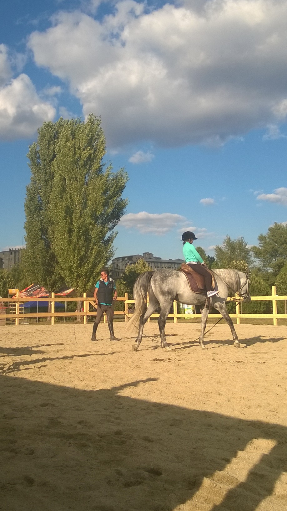 După încă circa un sfert de oră (și terminarea lecțiilor celor care se aflau deja în menaj), vedem că noii veniți sunt îndrumați să se organizeze într-un șir pentru a începe echitația „în ordine”. Întrebăm IAR un instructor, dar acesta ne apostrofează că deranjăm, că „aici se stă doar pentru lecții, nu pentru plimbare la pas, mergeți acolo, unde e coada, nu aveți voie aici!”