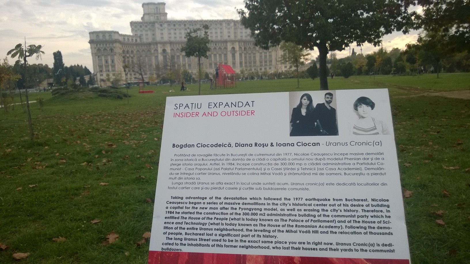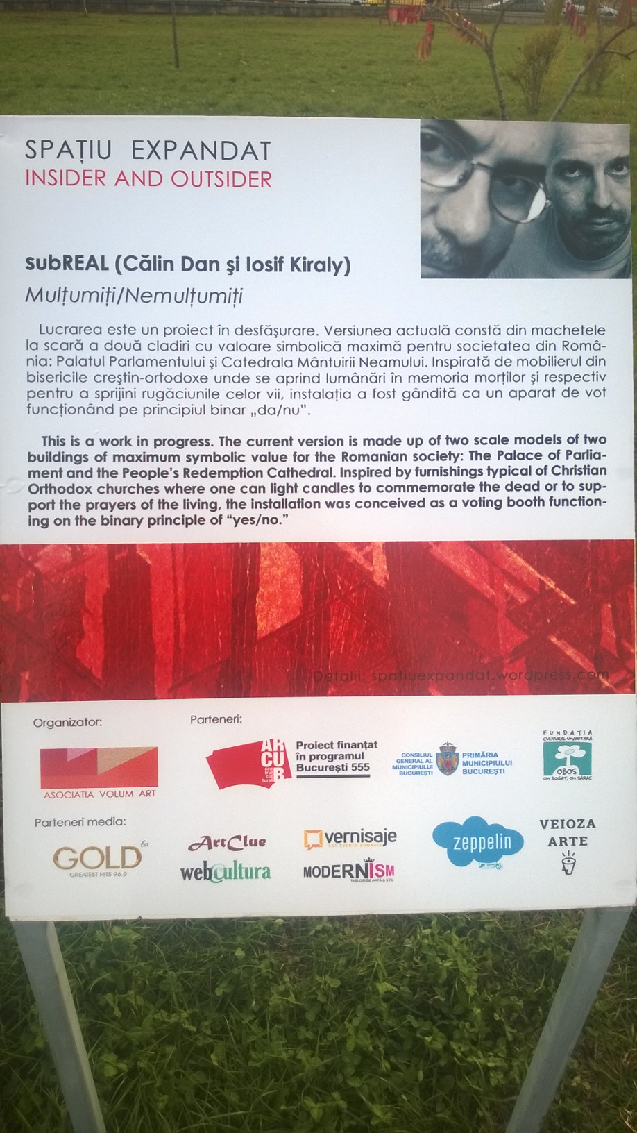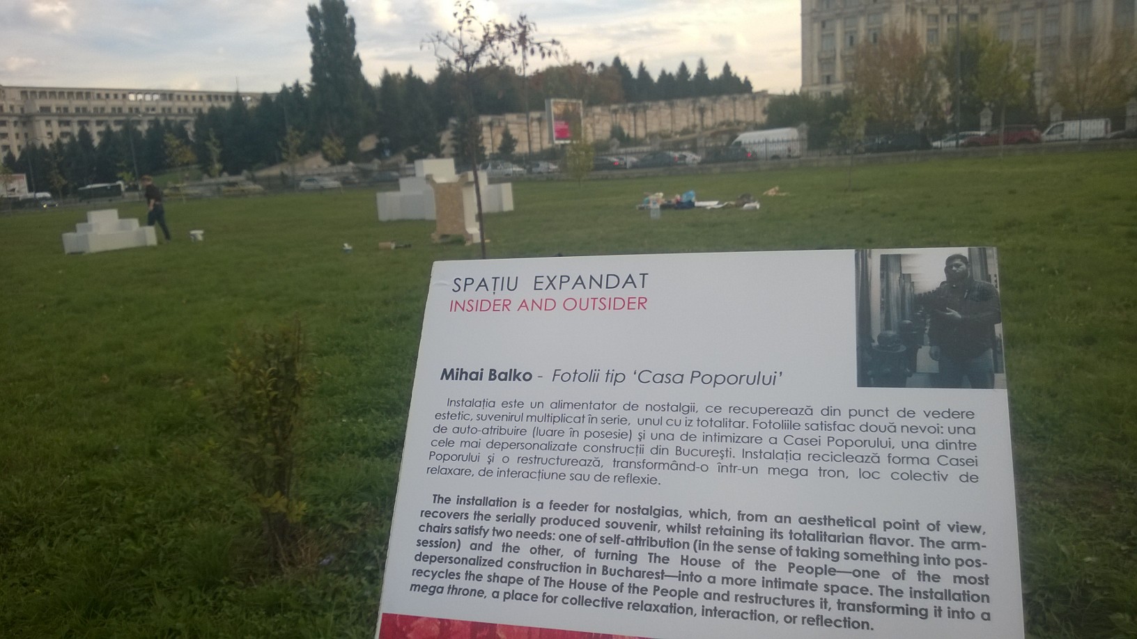 Prin tema „Insider and outsider”, expoziţia în aer liber „Spaţiu expandat” aduce în Parcul Izvor din Bucureşti, în perioada 21 octombrie – 15 decembrie 2014, patru intervenţii artistice: „Fotolii tip „Casa Poporului” – autor Mihai Balko, „Uranus cronic(a)” – realizată de echipa formată din Ioana Ciocan şi arhitecţii Bogdan Ciocodeică şi Diana Roşu, „Schelet de megafon cu scrînciob” – autor Adela Iacoban şi lucrarea „Mulţumiţi, nemulţumiţi” a grupului subREAL (Călin Dan şi Iosif Kiraly). DETALII