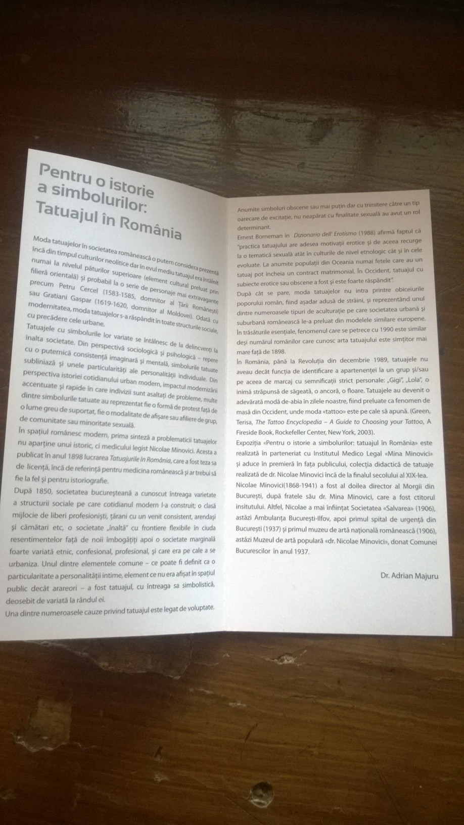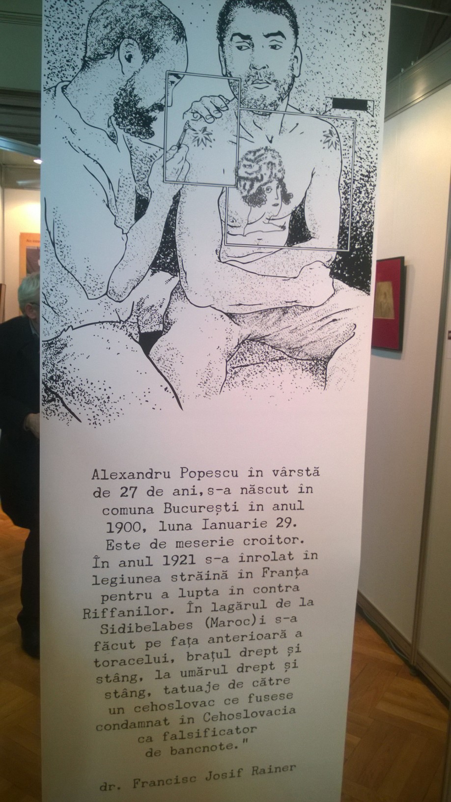 “Prin această manifestare facem publică prima sinteză românească a problematicii tatuajelor, care nu a aparţinut unui istoric, ci medicului legist Nicolae Minovici. Acesta a publicat în anul 1898 lucrarea «Tatuajurile în România», care a fost teza sa de licenţă, o lucrare de referinţă pentru medicina românească, chiar şi astăzi”, ne-a spus Adrian Majuru, directorul Muzeului Municipiului Bucureşti (Muzeul Şuţu), gazda expoziţiei.