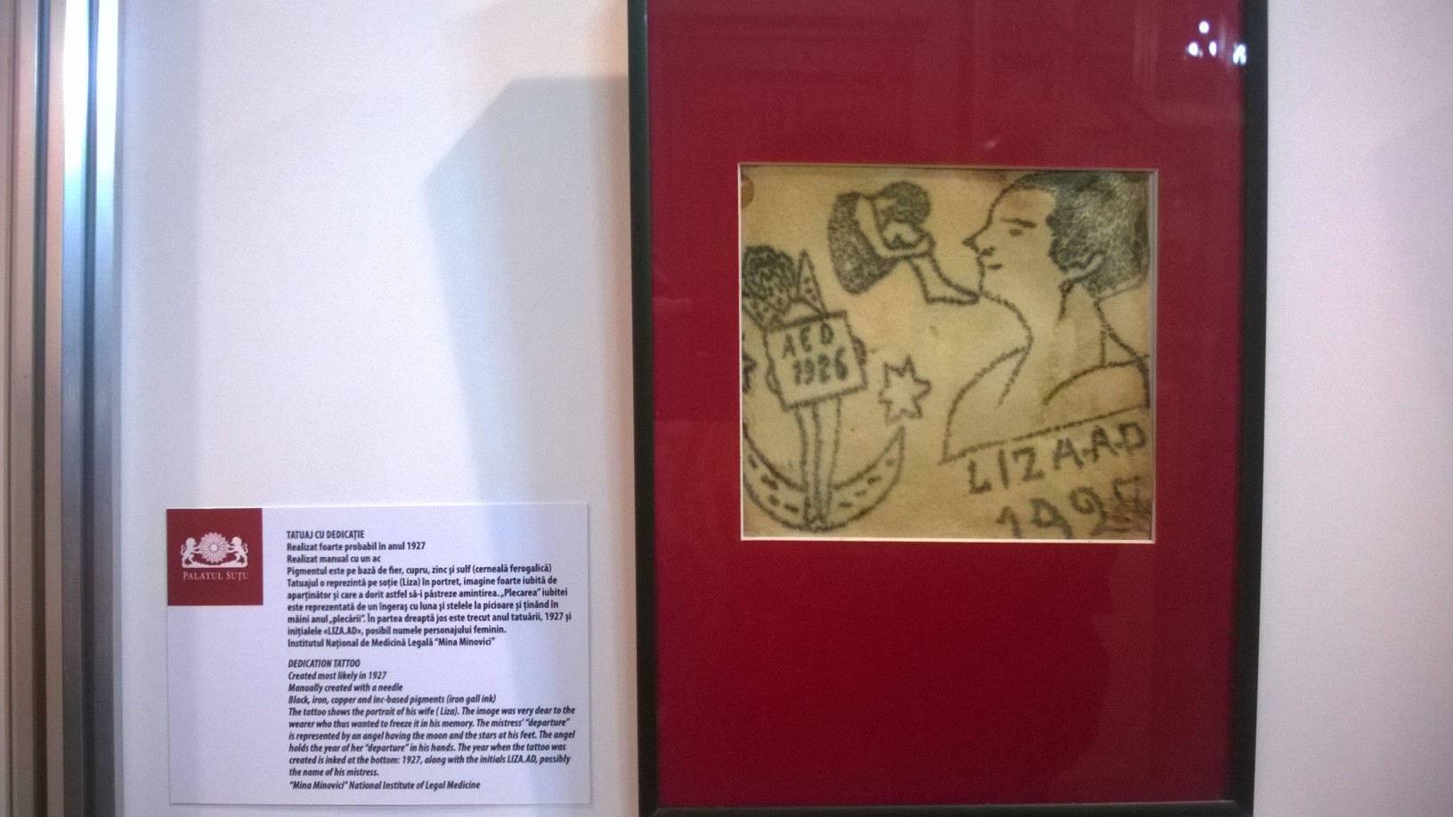 Printre exponate, care aparţin Muzeului Institutului de Medicină Legală, există şi un tatuaj datat 1876, cel mai vechi din România, decupat de pe trupul unui bărbat despre care nu se mai ştie nimic – un bucureştean care şi-a imortalizat familia, soţia şi copilul, pe propriul său corp, desenul fiind interpretat ca o poveste de iubire de către specialiştii care au studiat acest tatuaj. Legiştii şi istoricii au încercat totuşi să refacă povestea, în mare, după datele pe care le conţine desenul şi cele lăsate de Minovici despre sociologia românească a tatuajului în epoca respectivă. DETALII