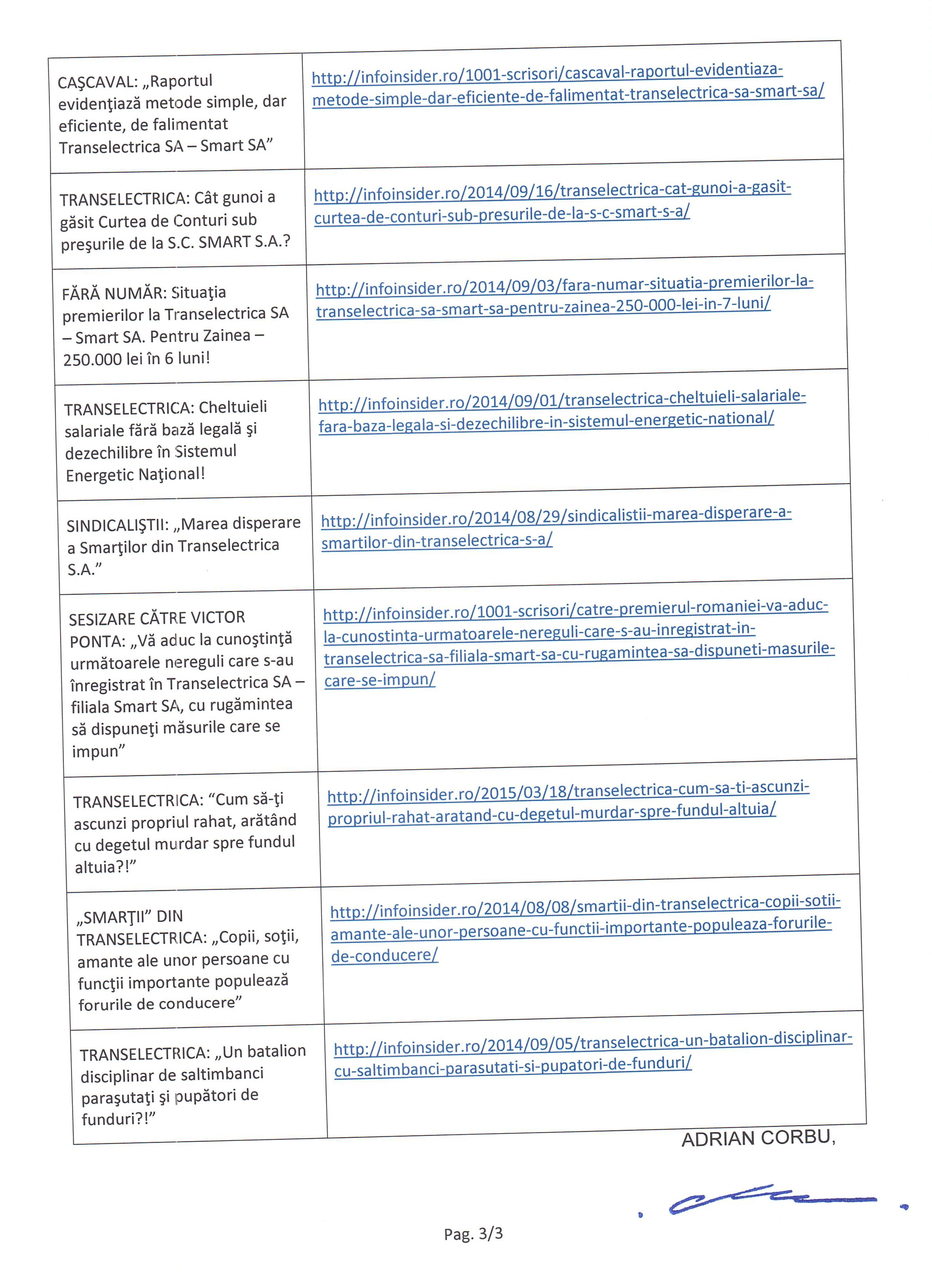 ARHIVĂ: TRANSELECTRICA: Cine plăteşte pentru moartea inginerului Cristian Rusu din filiala Smart S.A.? *** TRANSELECTRICA: „Când le va veni rândul la DNA lui Cosmin Mihai Monac şi Constantin Marius Banu?” *** PUROI: „Conducerea Transelectrica SA – filiala Smart SA este deţinută de PDL, inclusiv astăzi 9 august 2014„ *** CAŞCAVAL: „Raportul evidenţiază metode simple, dar eficiente, de falimentat Transelectrica SA – Smart SA” *** TRANSELECTRICA: Cât gunoi a găsit Curtea de Conturi sub preşurile de la S.C. SMART S.A.? *** FĂRĂ NUMĂR: Situaţia premierilor la Transelectrica SA – Smart SA. Pentru Zainea – 250.000 lei în 6 luni! *** TRANSELECTRICA: Cheltuieli salariale fără bază legală şi dezechilibre în Sistemul Energetic Naţional! *** SINDICALIŞTII: „Marea disperare a Smarţilor din Transelectrica” *** SESIZARE CĂTRE VICTOR PONTA: „Vă aduc la cunoştinţă următoarele nereguli care s-au înregistrat în Transelectrica SA – filiala Smart SA, cu rugămintea să dispuneţi măsurile care se impun” *** TRANSELECTRICA: „Cum să-ţi ascunzi propriul rahat, arătând cu degetul murdar spre fundul altuia?!” *** „SMARŢII” DIN TRANSELECTRICA: „Copii, soţii, amante ale unor persoane cu funcţii importante populează forurile de conducere” *** TRANSELECTRICA: „Un batalion disciplinar de saltimbanci paraşutaţi şi pupători de funduri?!”