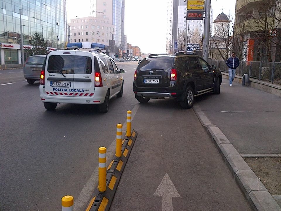INSIDER: „Azi dimineaţă, spre birou, văd cum un jeepan negru lucios bloca noua pista de biciclete de pe Buzeşti, parcat de-a curmezişul, cu avariile puse. Dar şoferul nu a aparut într-un minut, aşa cum faci dacă ai o urgenţă. Mă apropii şi văd că maşina poliţiei îl aşteapta, blocându-i retragerea. „Bravo!”, îmi zic, după articolele de ieri, iată că poliţia îşi face datoria. Intru la bancă, îmi rezolv treaba, mă mai învârtesc câteva minute – cu totul vreo 10. Voiam să văd cum se încheie lucrurile. Mai stau un pic şi văd.