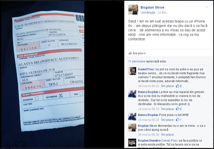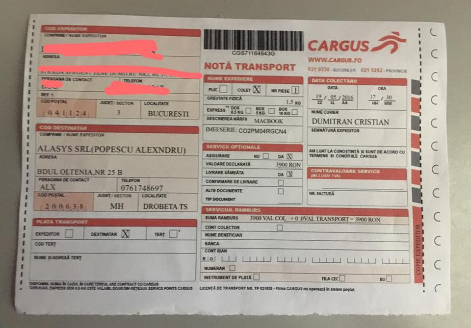 INSIDER: „Printr-o metoda foarte ingenioasă mi-am luat ţeapă. Pe 19.05.2016 am fost sunat de pe nr. 0724005910 cu privire la un MacBook ce îl aveam de vânzare. Domnul dorind să îi facă şi asigurare coletului, am stabilit să facă el comanda la curier şi respectiv să plătească asigurarea acestuia, după câteva ore am fost sunat de către „un curier” de la nr. de telefon 0761748697. Acesta ulterior a sosit la mine echipat cu vesta ce avea logo Cargus, a ridicat coletul şi mi-a lăsat o copie de pe comandă.