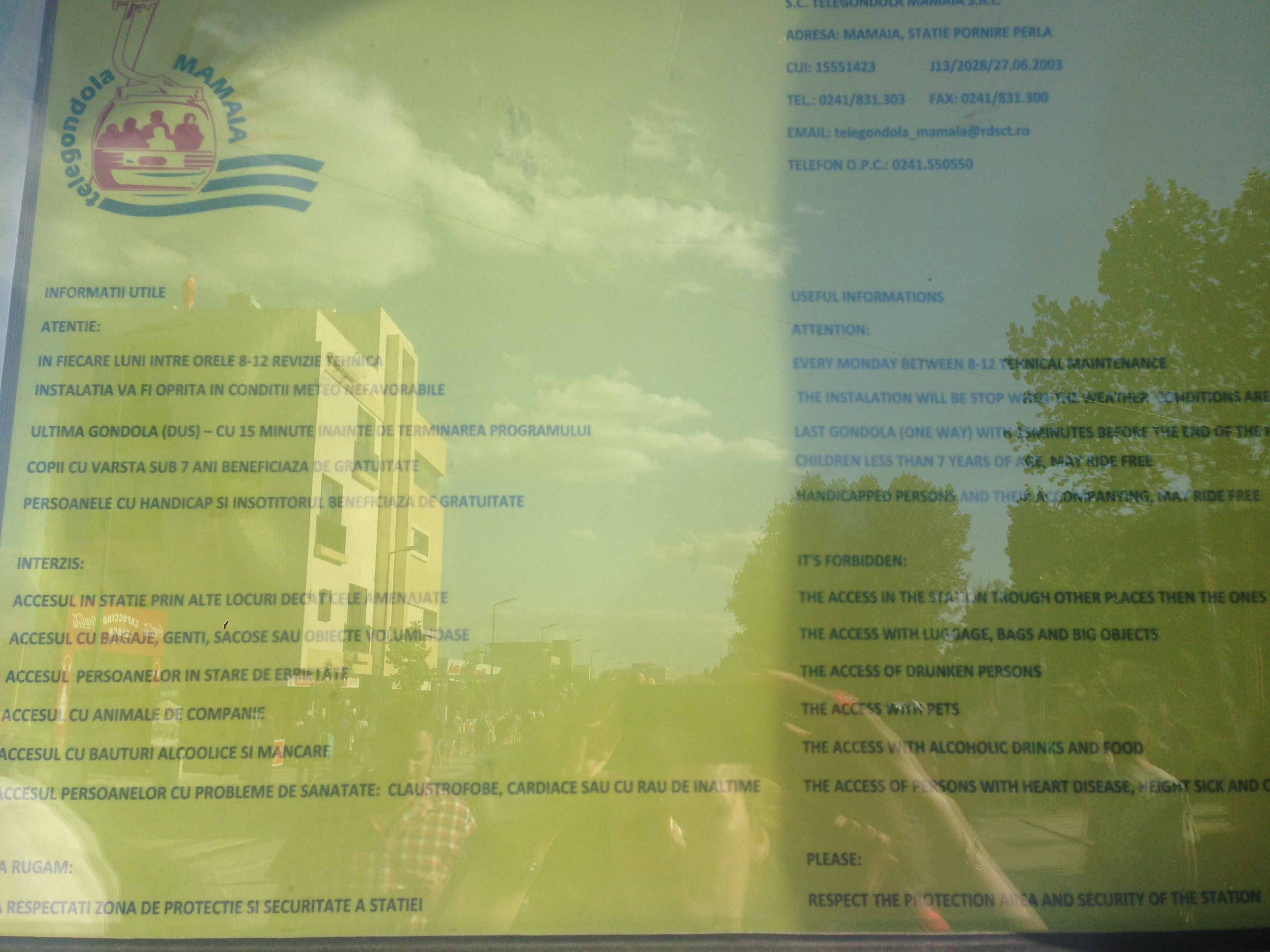 Telegondola Mamaia este o instalatie complexa de transport pe cablu, destinata turistilor care doresc sa admire panorama statiunii Mamaia. Va puteti imbarca din doua statii, prima in zona Perla Mamaia/Aqua Magic, iar cea de-a doua in zona Cazino Mamaia. Turistii vor avea ocazia sa pluteasca efectiv pe deasupra statiunii Mamaia, timp de aproximativ 7 minute, la o inaltime maxima de 50 de metri. Capacitatea unei gondole este de opt locuri, aceasta fiind inchisa, cu ventilatie naturala si protectie solara. Lungimea totala a traseului este de 2000 de metri. Calatorie dus: 20 lei / adult. DETALII