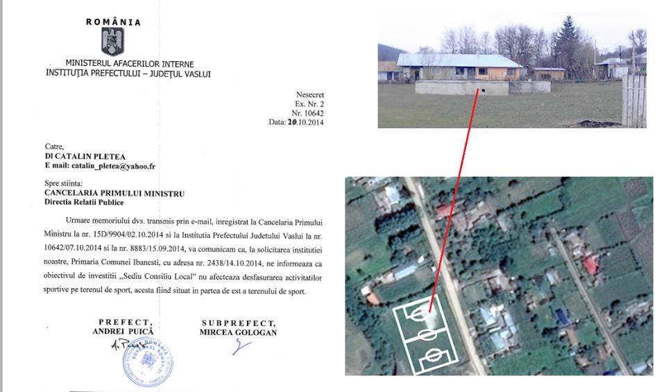 INSIDER: „Vă mulţumesc încă o dată pentru articolul publicat, a fost eficient, a fost preluat apoi şi de alte ziare/bloguri. Am făcut o sesizare şi la Prefectura Vaslui şi răspunsul îl vedeţi în imaginea postată. Se vede clar şi din satelit că fundaţia este aproape în mijlocul terenului, între fundaţie şi râpa din partea de vest sunt în jur de 35 metri. Am încercat să desenez terenul de odinioară pe o imagine din satelit, deci e clar că acolo nu mai poate fi teren de fotbal. Pentru a avea o idee cam la ce scară e imaginea, şoseaua are în jur de 4 metri lăţime. Azi am primit răspunsul de la prefectură şi vă cer sfatul dumneavoastră, ce aş putea să fac pentru a repara nedreptatea. Primăria minte cu neruşinare, profitând şi de faptul că primarul a trecut la PSD, iar prefectul e tot psd-ist. Mulţumesc!”