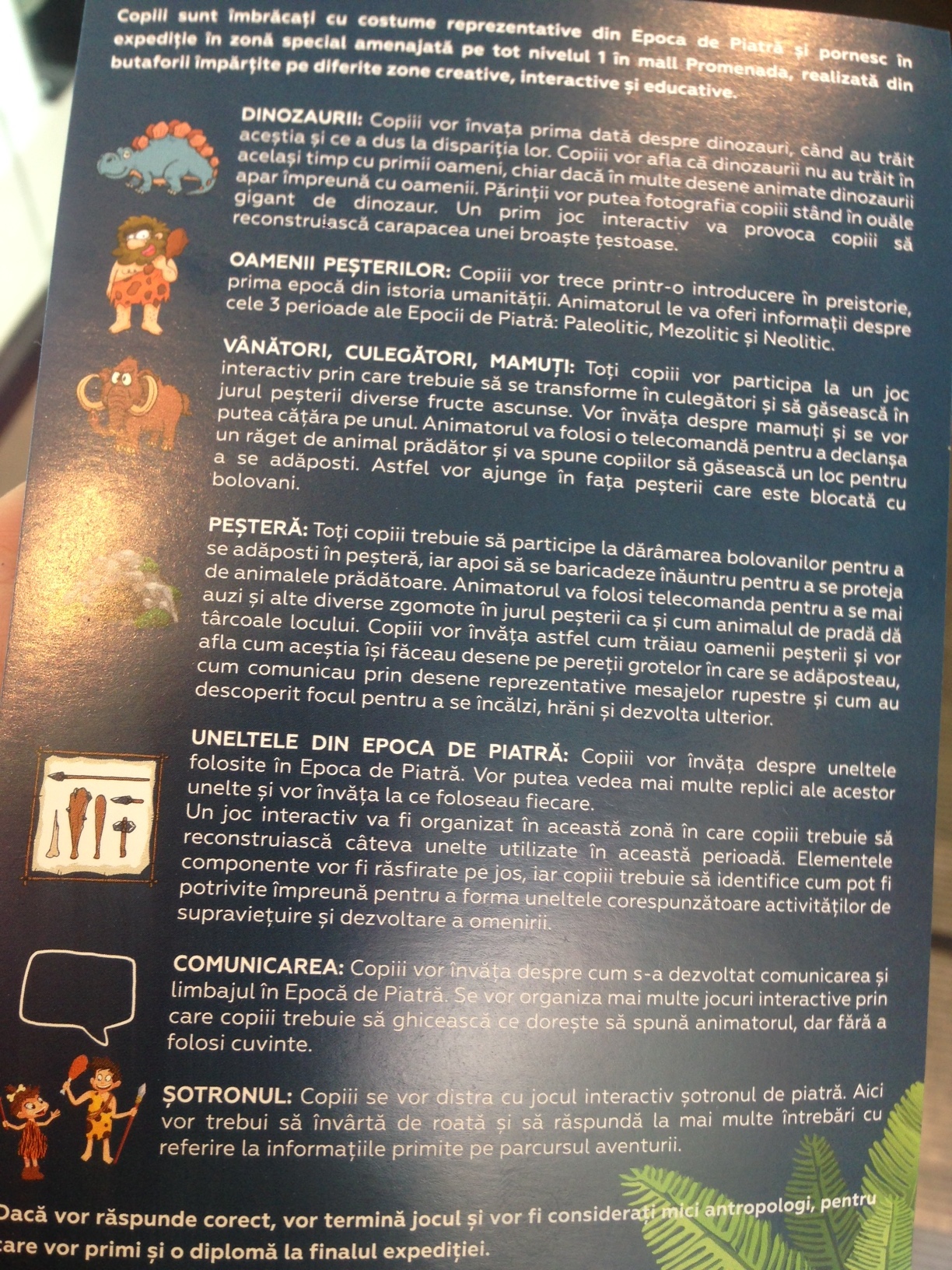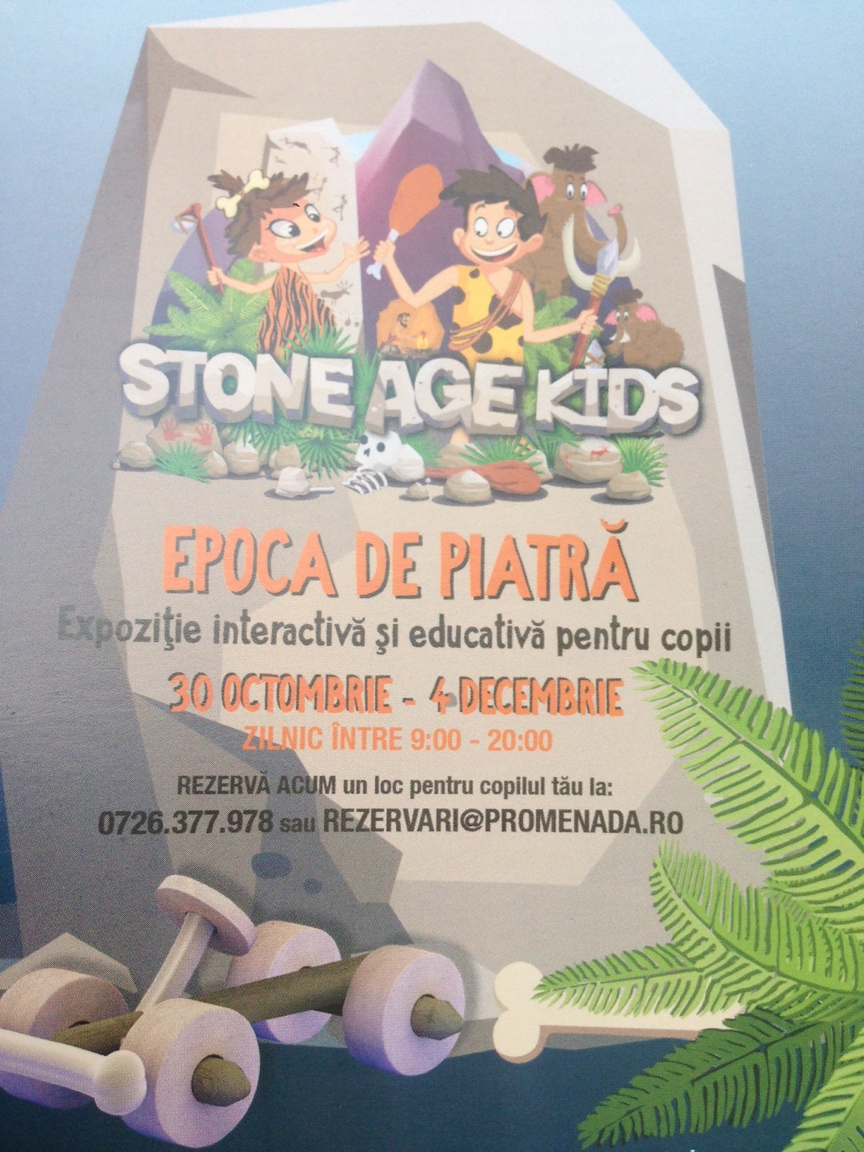 La Promenada Mall pâna pe 4 decembrie 2016, zilnic între orele 9:00 și 20:00, copiii între 3 și 10 ani sunt așteptați la nivel 1, să se aventureze timp de 45 de min în Epoca de piatră și să învețe totul despre aceasta prin activități interactive și educative la expoziția Stone Age Kids, organizată de mall în parteneriat cu Inspectoratul Școlar al Municipiului București. Zilnic, copiii cu vârste cuprinse între 3 și 10 ani, vor intra în lumea preistorică, unde se vor aventura timp de 45 de minute pe un traseu special amenajat. Bilet intrare 15 lei. (DETALII)