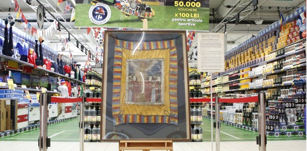 Drapelul lui Avram Iancu a ajuns sa fie expus intr-un SUPERMARKET din Bucuresti (SURSA) Drapelul lui Avram Iancu, cumpărat la licitaţie,cu 105.000 de euro, de omul de afaceri Adrian Thiess. Drapel de luptă al unei legiuni a lui Avram Iancu, pictat pe piele, este considerat o raritate absolută, fiind datat jumătatea secolului al XIX-lea. Acesta a fost scos din nou la vânzare, miercuri seara, la Bucureşti, la casa de licitaţii Artmark, evenimentul având loc la peste doi ani de la conflictul dintre fostul lider al PRM Corneliu Vadim Tudor, decedat în 2015, şi Gheorghe Funar, care şi-au disputat acest steag. (SURSA)