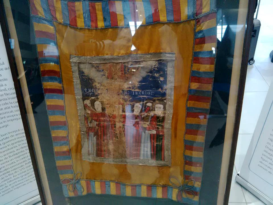 Drapelul are forma patrata, este confectionat, in principal, din piele si are cusuta o icoana brodata pe margini cu fir de argint, care reprezinta, pe una dintre fete, momentul Pogorarii Duhului Sfant, iar, pe cealalta, Inaltarea. Pe marginea drapelului sunt cusute culorile tricolorului romanesc. Pana pe 4 decembrie, pasagerii vor putea admira acest drapel expus in noul Terminal Plecari al Aeroportului „Henri Coanda”. Evenimentul face parte dintr-un turneu de promovare a drapelului, care este expus în mai multe locații din țară în acest an. (SURSA) ALTE FOTO